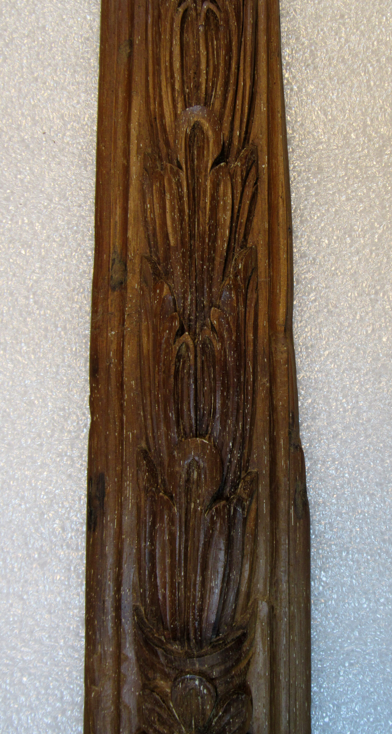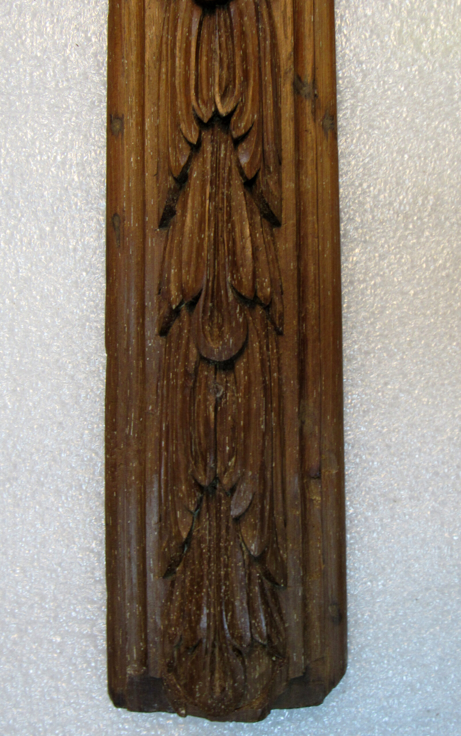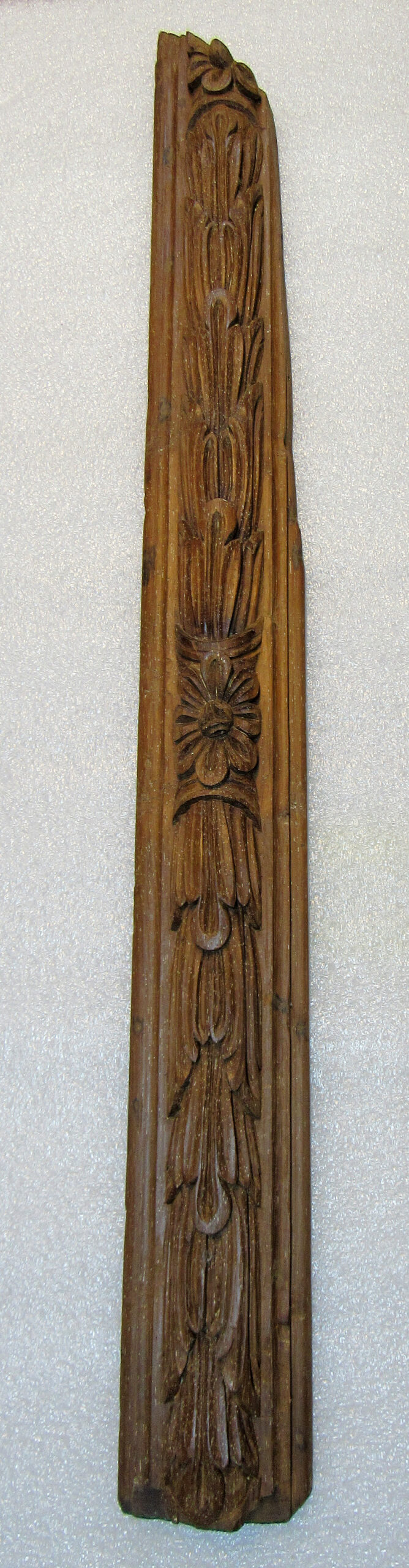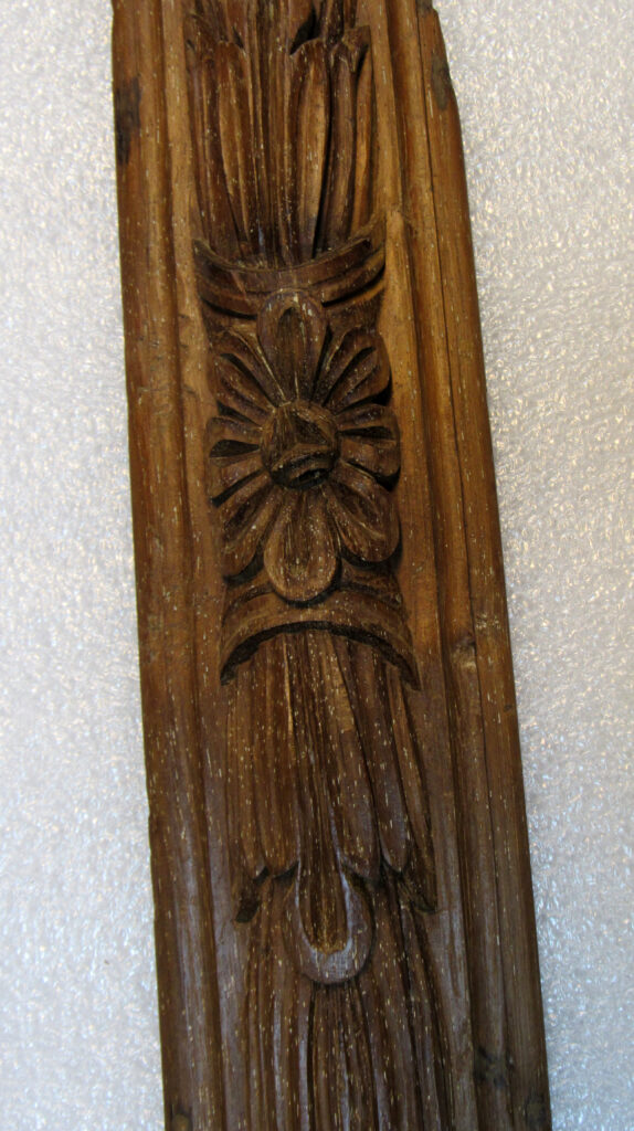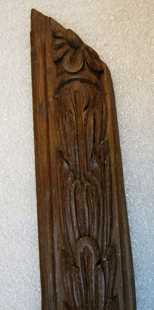 Alizar, em madeira (cedro) talhada e esculpida, sem pintura. Placa de madeira cortada no sentido longitudinal, ornada na face anterior com motivos fitomórficos esculpidos em baixo-relevo, constituindo-se a ornamentação por folhas de acanto enfeixadas no sentido vertical, entrecortadas periodicamente por uma flor de miolo circular e oito pétalas; tudo ladeado por friso relevado, à guisa de moldura.