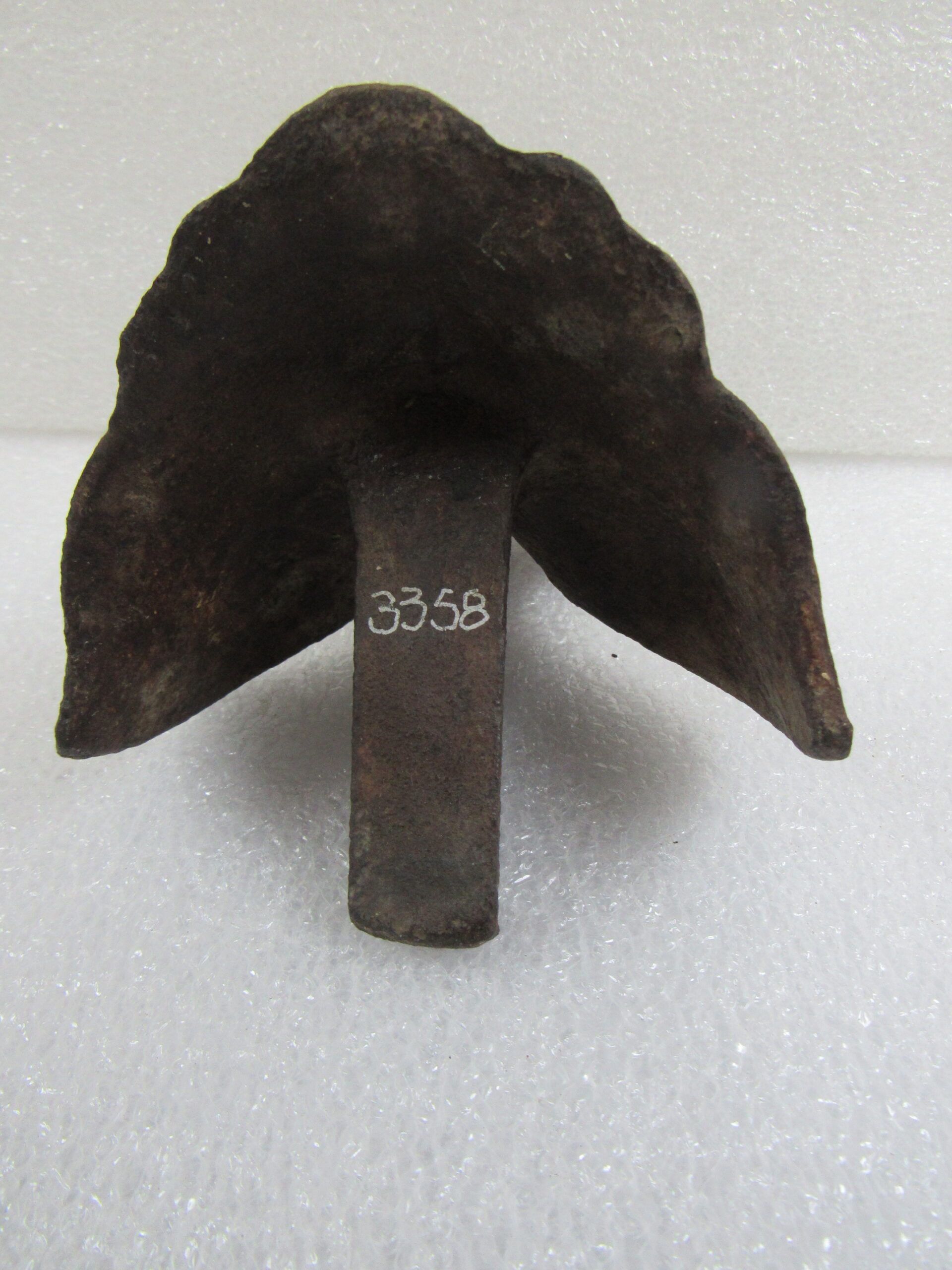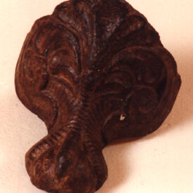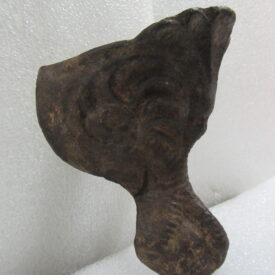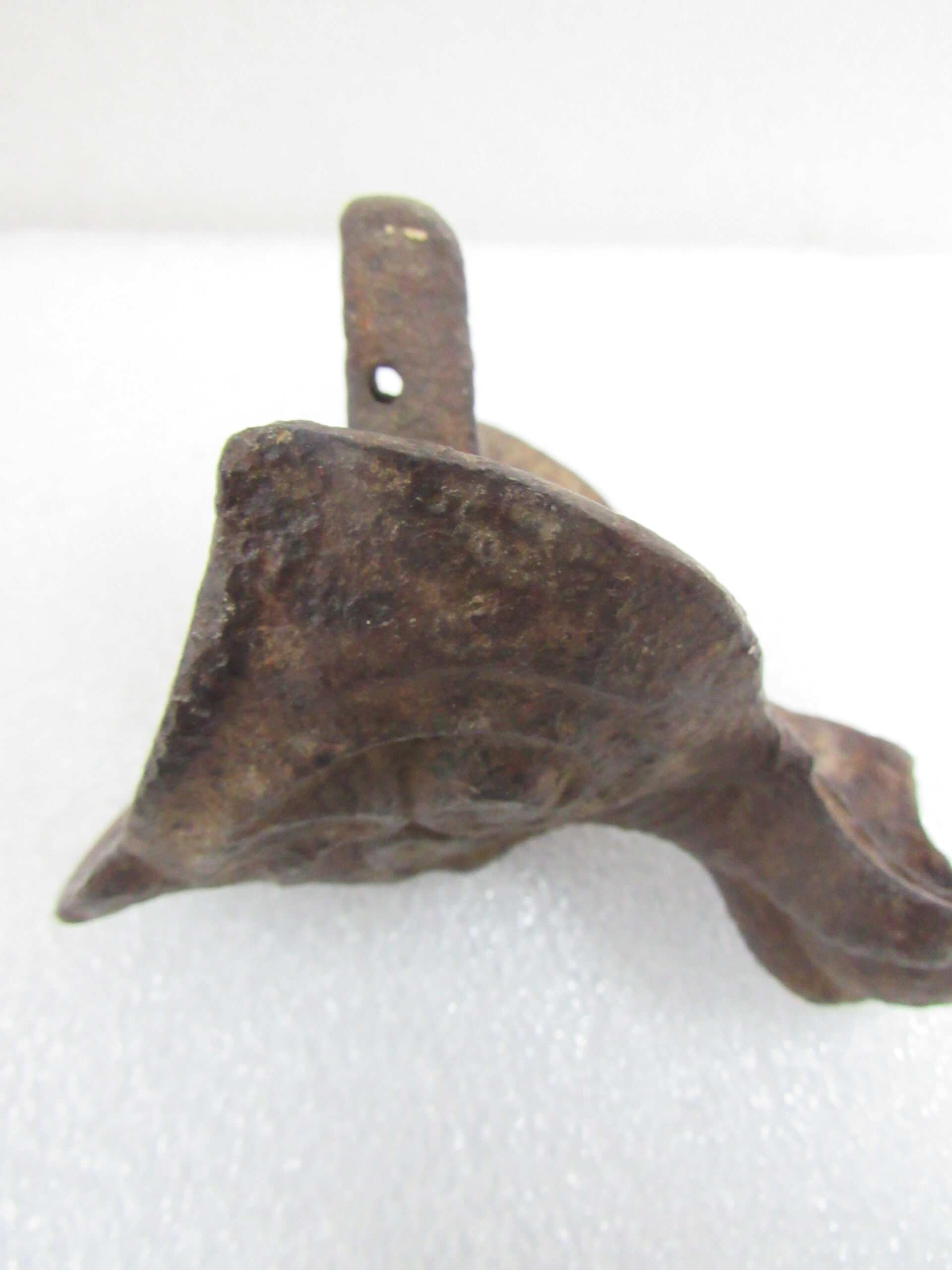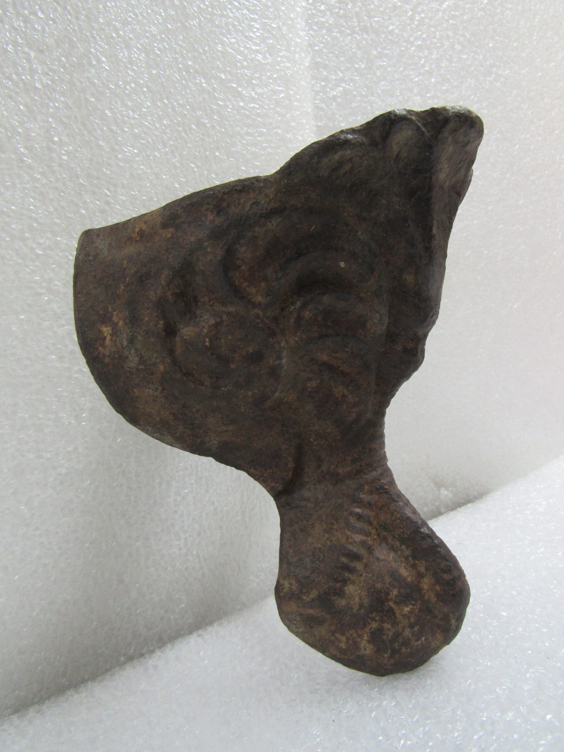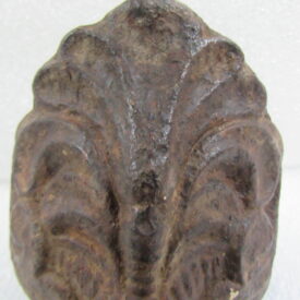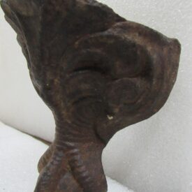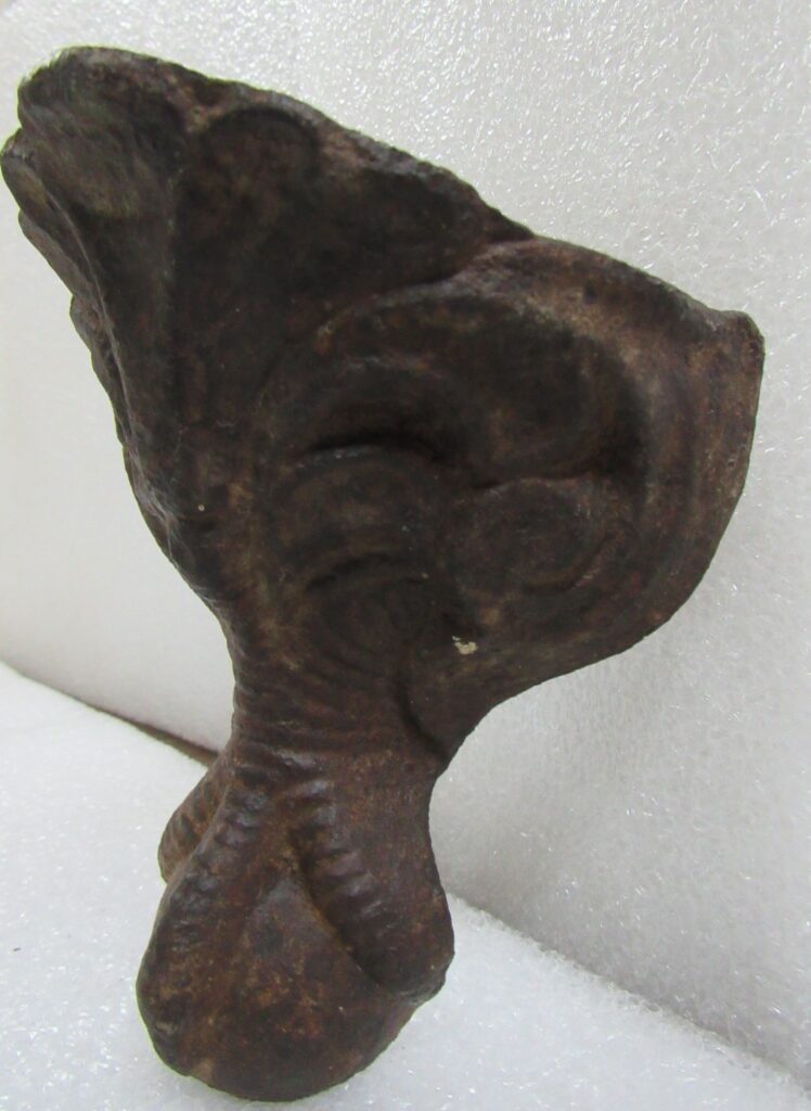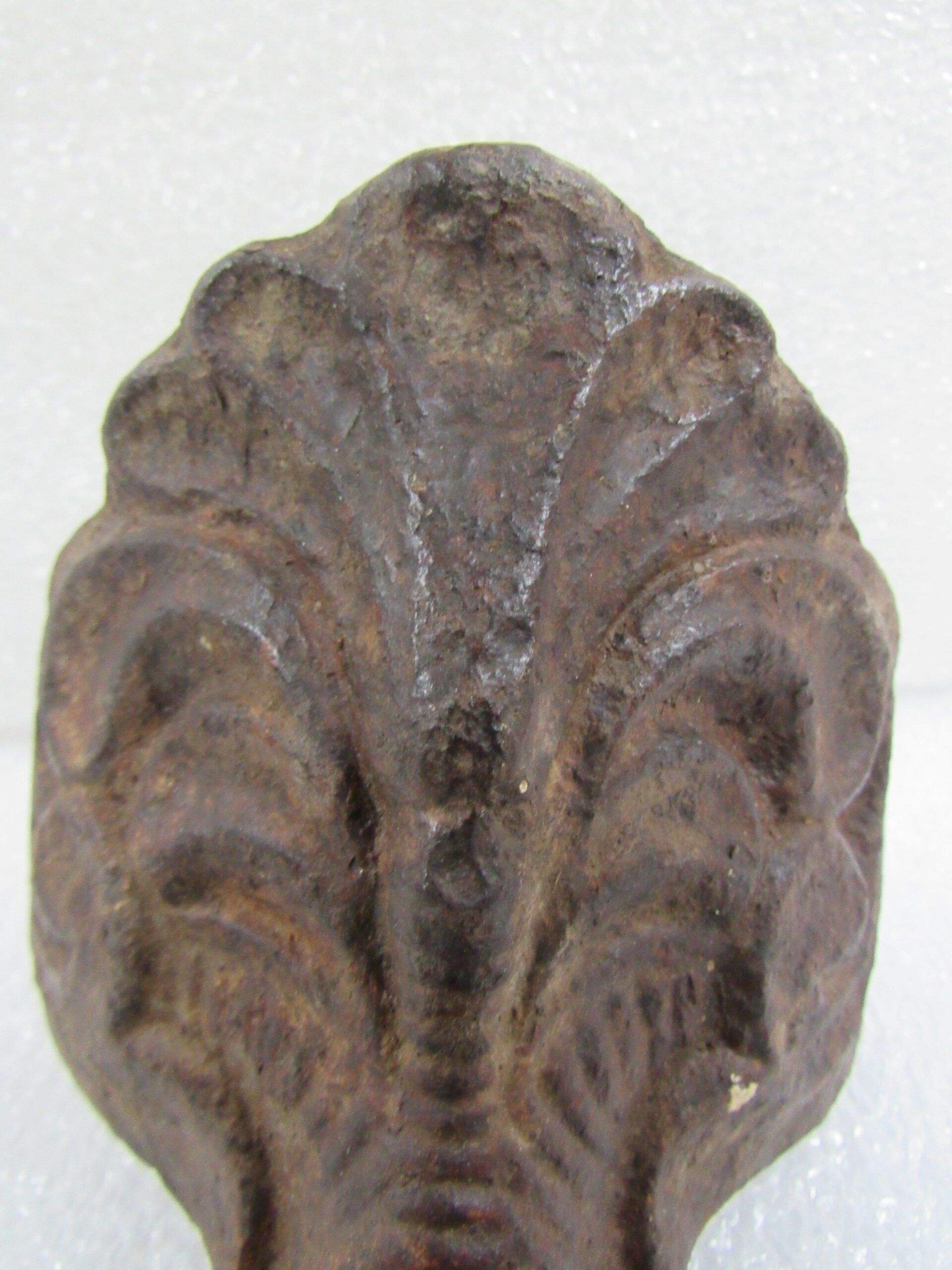 Banheira (fragmento): pé, em ferro fundido. Peça de formato conchóide, apresenta na face externa, em relevo, motivos fitomórficos (folha de acanto) e concheados, com terminação, na extremidade inferior que lhe serve de base, em bola envolvida por três garras de uma ave de rapina.
