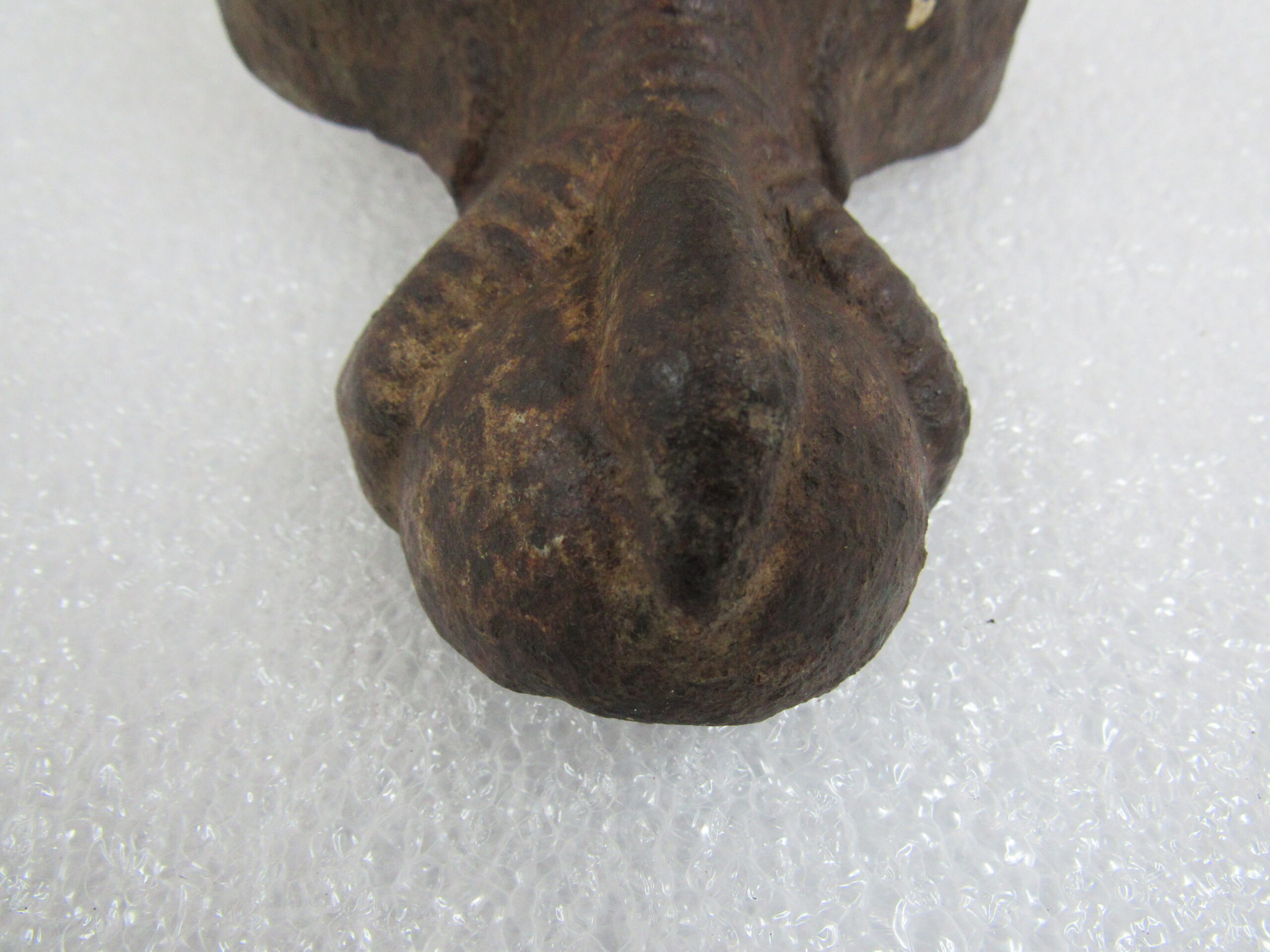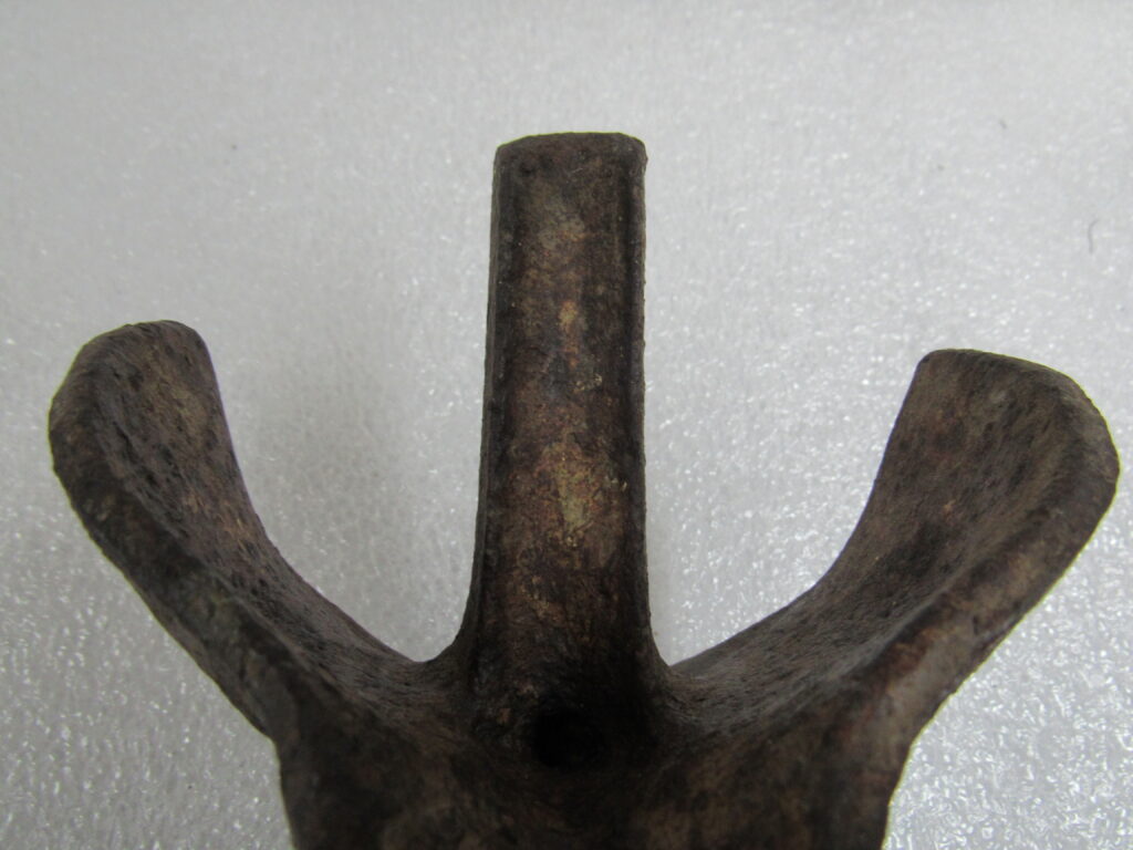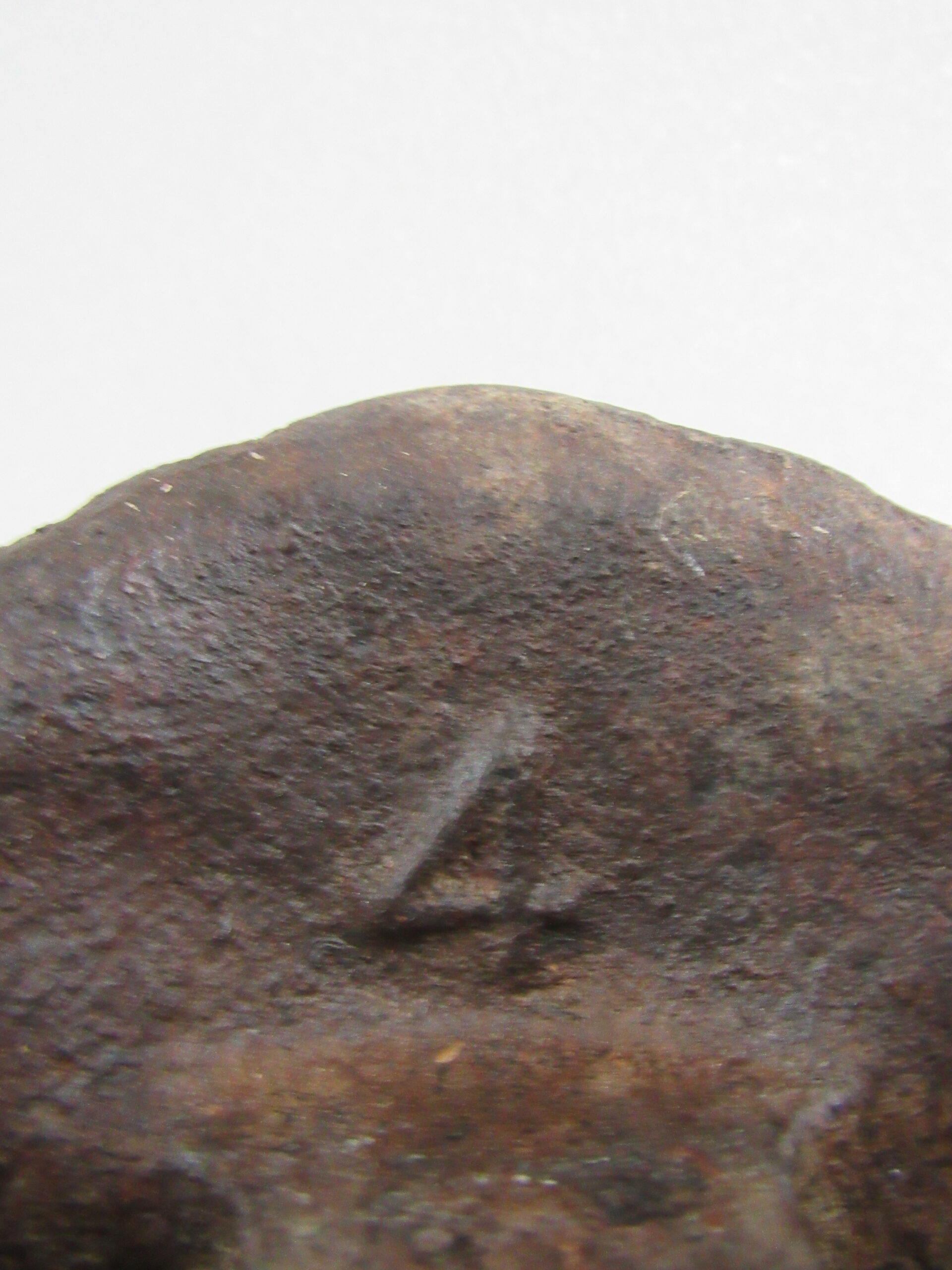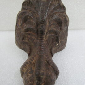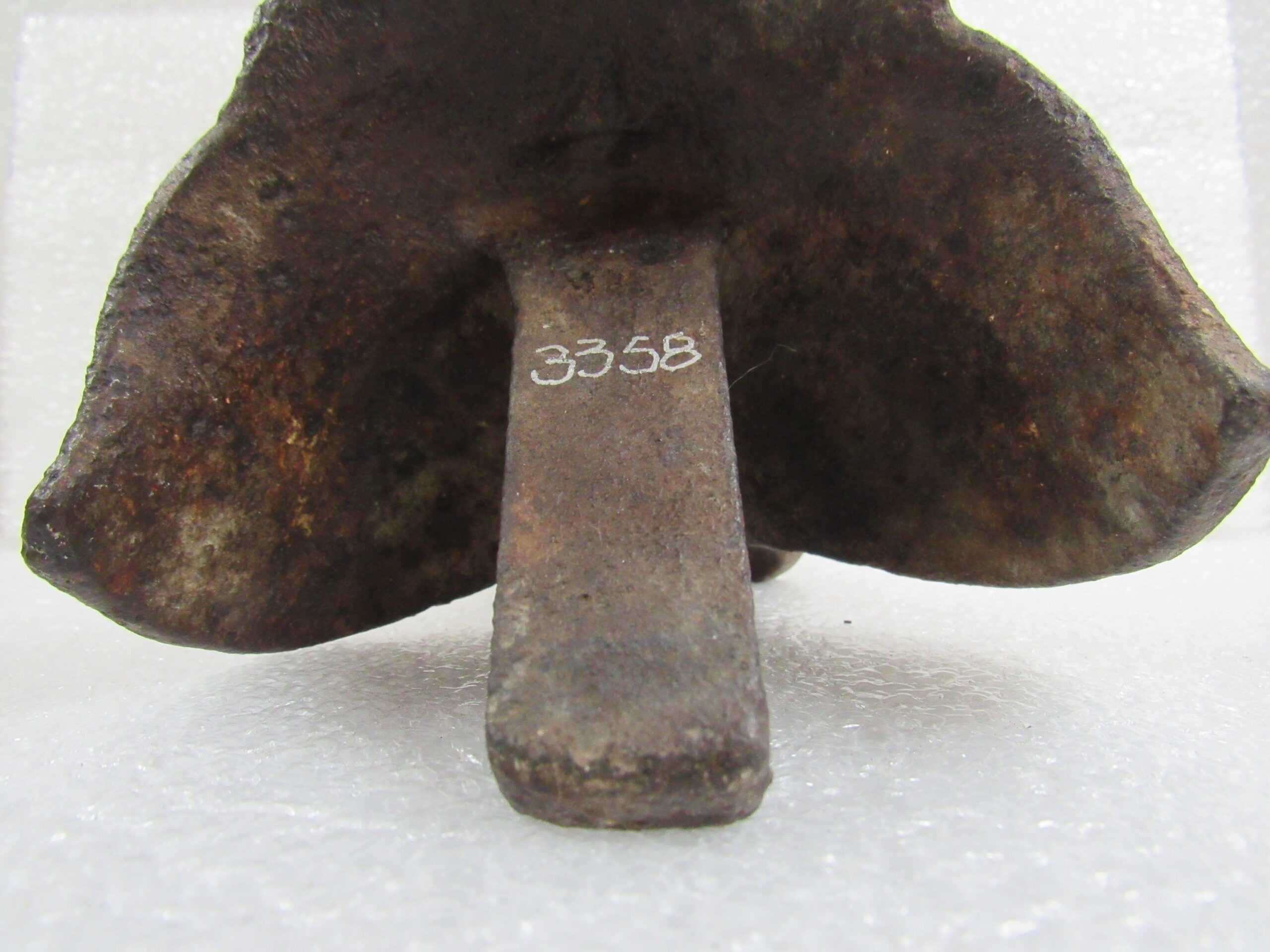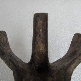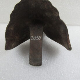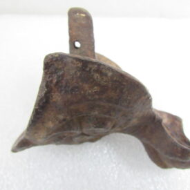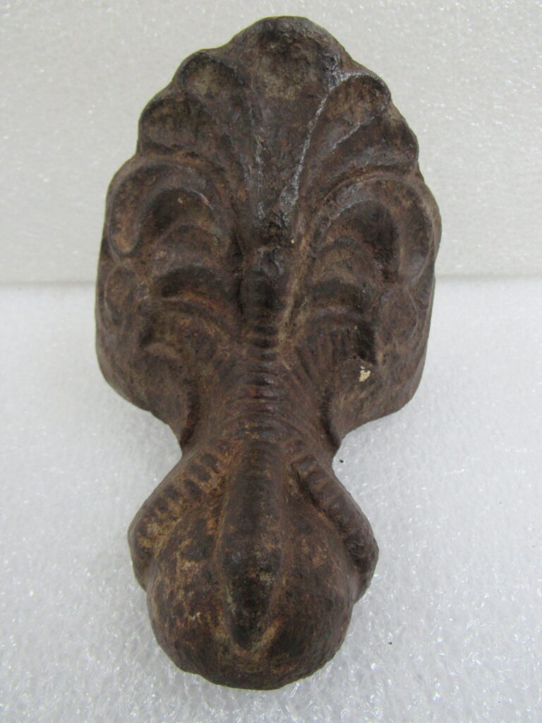 Banheira (fragmento): pé, em ferro fundido. Peça de formato conchóide, apresenta na face externa, em relevo, motivos fitomórficos (folha de acanto) e concheados, com terminação, na extremidade inferior que lhe serve de base, em bola envolvida por três garras de uma ave de rapina.