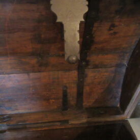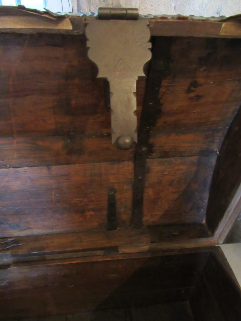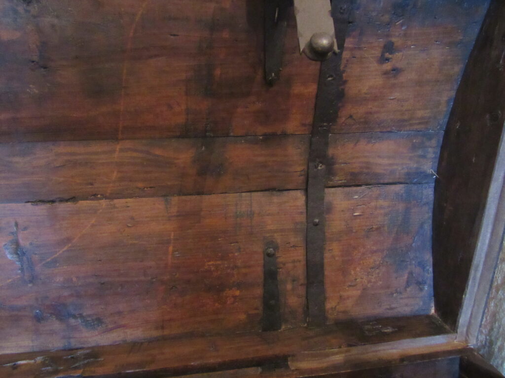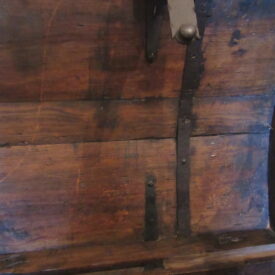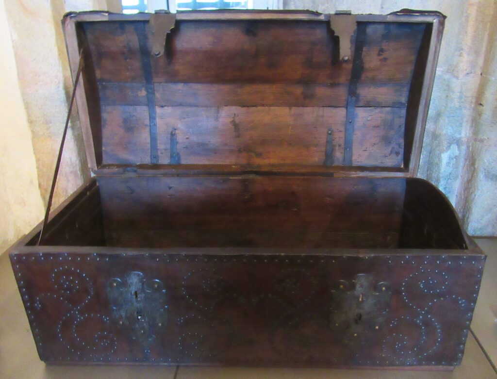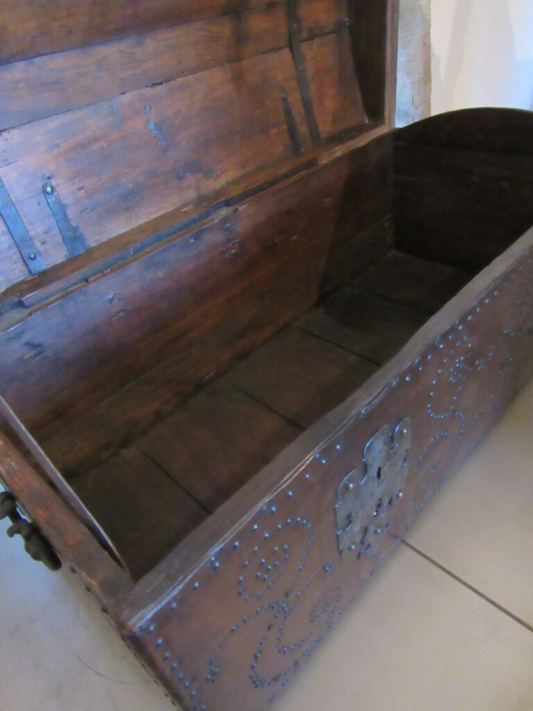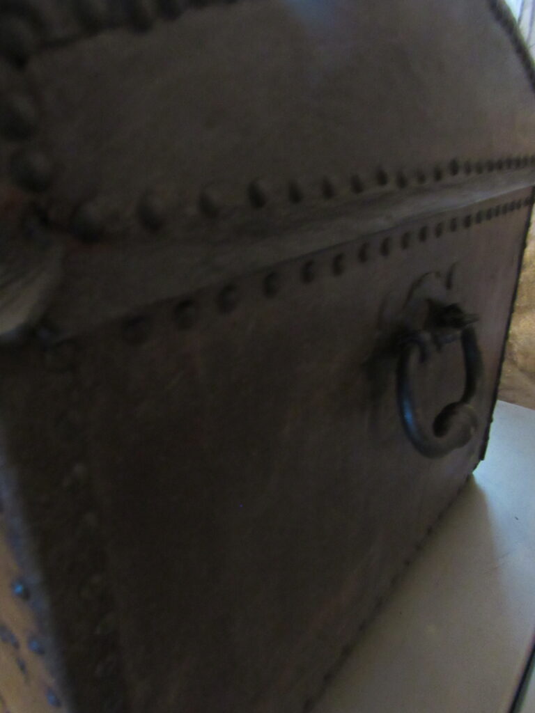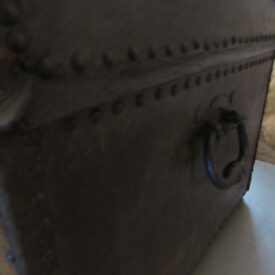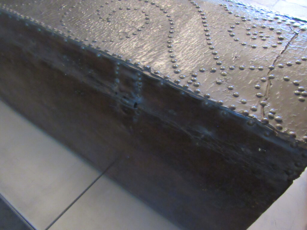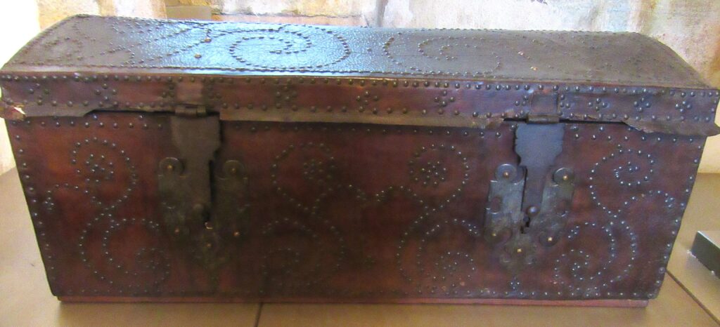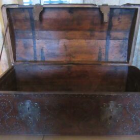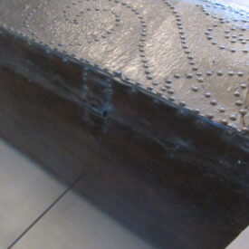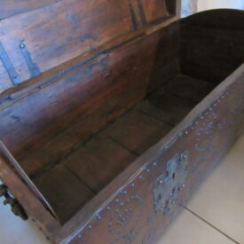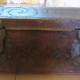 Baú de viagem, em madeira talhada, couro curtido e metal (ferro e latão) fundido. Caixa em madeira, de formato retangular, com tampo abaulado, recoberta por couro e com dobradiças e duas alças laterais de metal. Apresenta duas linguetas presas ao tampo que se encaixam em fechaduras com espelhos na face frontal. Ornamentação de volutas e pespontos formados por tachas de metal (latão). Metal amarelo (latão) para os tacheados e ferro para as dobradiças, alças e fechaduras.
