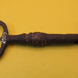 Chave, em ferro fundido. Peça constituída por haste longitudinal, cilíndrica e oca, interceptada em sua extremidade inferior por haste curta, lateralizada; a outra extremidade é coroada por argola de formato oval, transversal. Estreitos anéis relevados ornamentam a haste longitudinal.