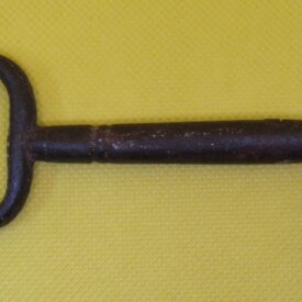 Chave, em ferro fundido. Peça constituída por haste longitudinal, cilíndrica e oca, interceptada em sua extremidade inferior por haste curta, lateralizada; a outra extremidade é coroada por argola de formato oval, transversal. Estreitos anéis relevados ornamentam a haste longitudinal.