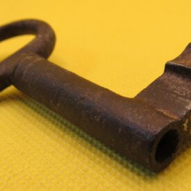 Chave, em ferro fundido. Peça constituída por haste longitudinal, cilíndrica e oca, interceptada em sua extremidade inferior por haste curta, lateralizada; a outra extremidade é coroada por argola de formato oval, transversal. Estreitos anéis relevados ornamentam a haste longitudinal.