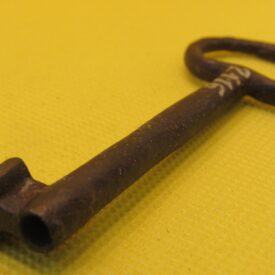 Chave confeccionada em metal (ferro fundido). Peça estruturada por haste longitudinal, cilíndrica e oca, arrematada em uma das extremidades por aro ovalado. Na outra extremidade do objeto, pequena chapa retorcida e denteada, disposta transversalmente, para encaixe na tranca.