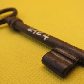Chave, em ferro fundido. Peça constituída por haste longitudinal, cilíndrica e oca, interceptada em sua extremidade inferior por haste curta, lateralizada; a outra extremidade é coroada por argola de formato oval, transversal. Estreitos anéis relevados ornamentam a haste longitudinal.