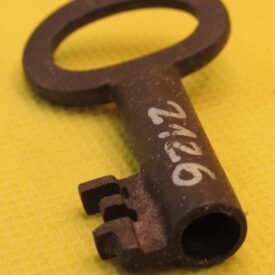 Chave, em ferro fundido. Peça constituída por haste longitudinal, cilíndrica e oca, interceptada em sua extremidade inferior por haste curta, lateralizada; a outra extremidade é coroada por argola de formato oval, transversal. Estreitos anéis relevados ornamentam a haste longitudinal. Peça provavelmente para tranca de móvel.
