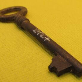 Chave confeccionada em metal (ferro fundido). Peça estruturada por haste longitudinal, cilíndrica e oca, arrematada em uma das extremidades por aro oval. Na outra extremidade do objeto, pequena chapa retangular delgada, disposta transversalmente, com a extremidade denteada para encaixe na tranca.