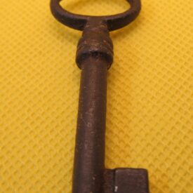 Chave em ferro fundido, com estrutura composta por haste longitudinal, oca e de formato cilíndrico, ornada por anéis e interceptada em uma das extremidades por estrutura escalonada. Extremidade oposta arrematada por aro ovalado, transversal. Peça provavelmente para tranca de móvel.