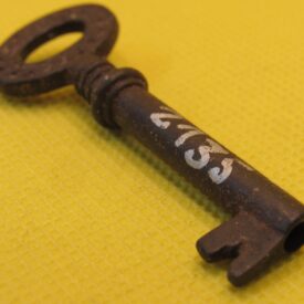 Chave em ferro fundido, com estrutura composta por haste longitudinal, oca e de formato cilíndrico, ornada por estreitos anéis e interceptada em uma das extremidades por estrutura escalonada. Extremidade oposta arrematada por aro ovalado, transversal, com ornamentação na face por volutas seriadas. Peça provavelmente para tranca de móvel.