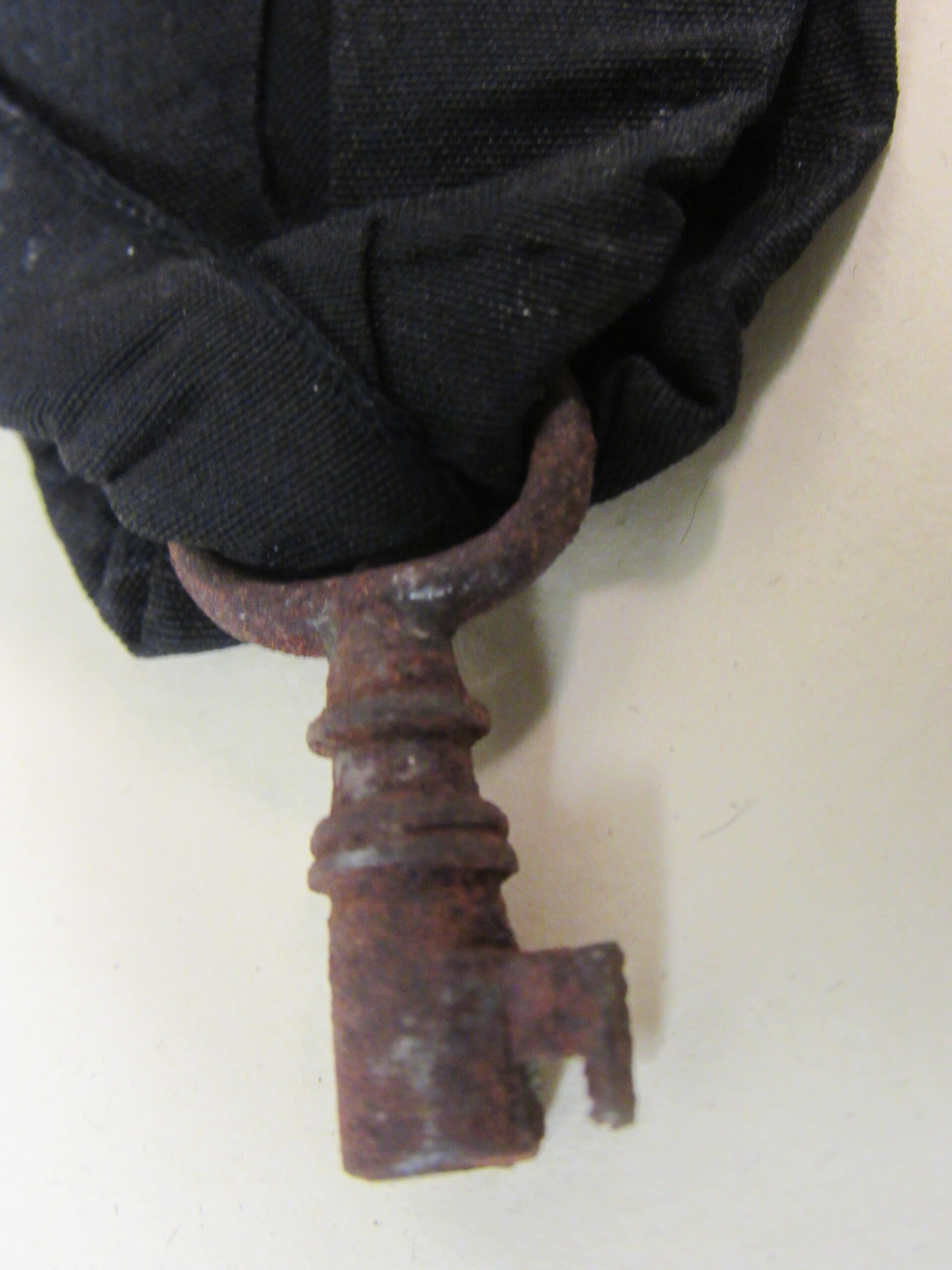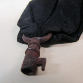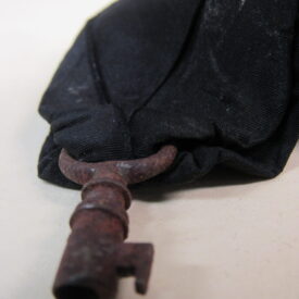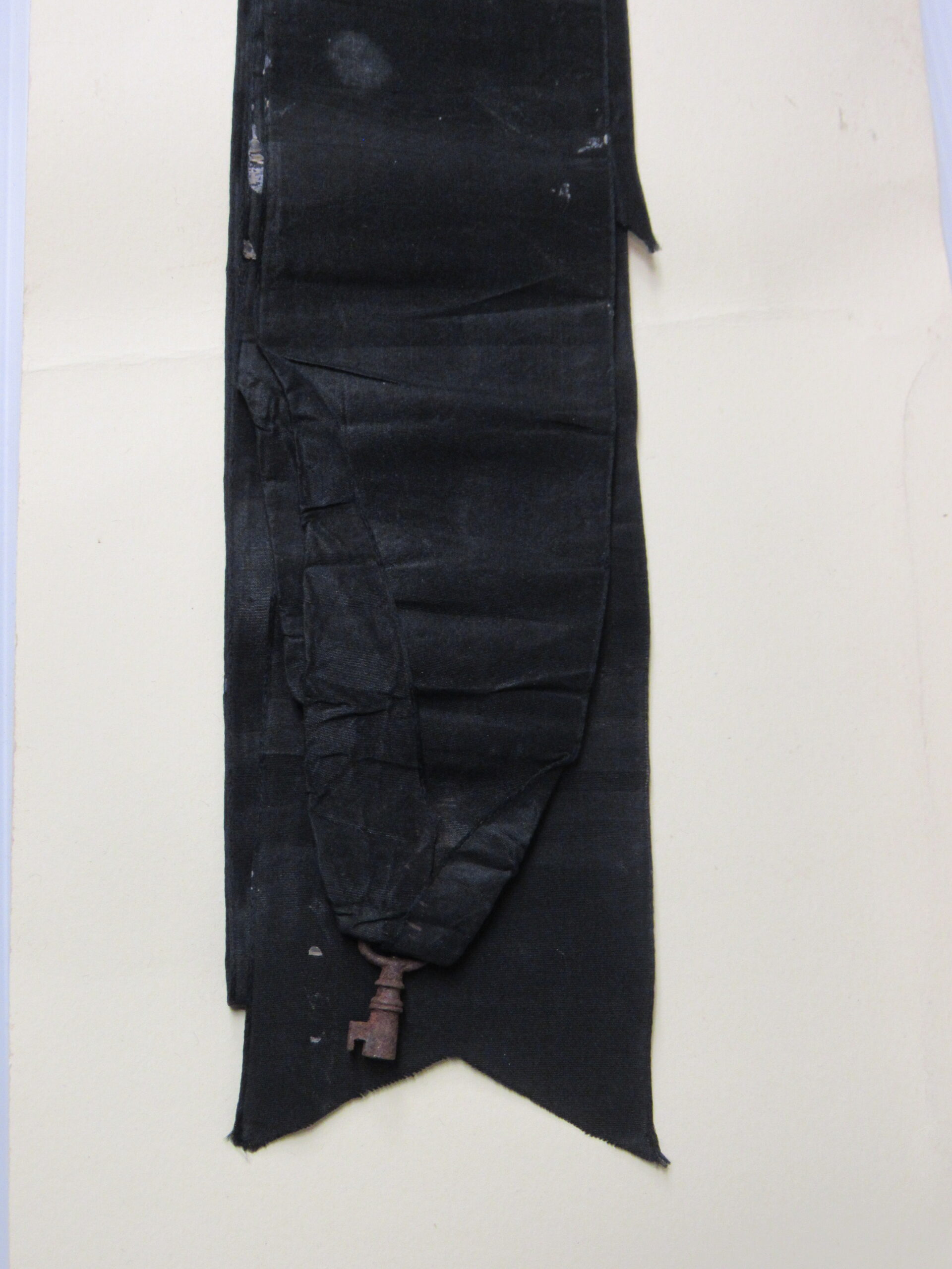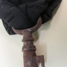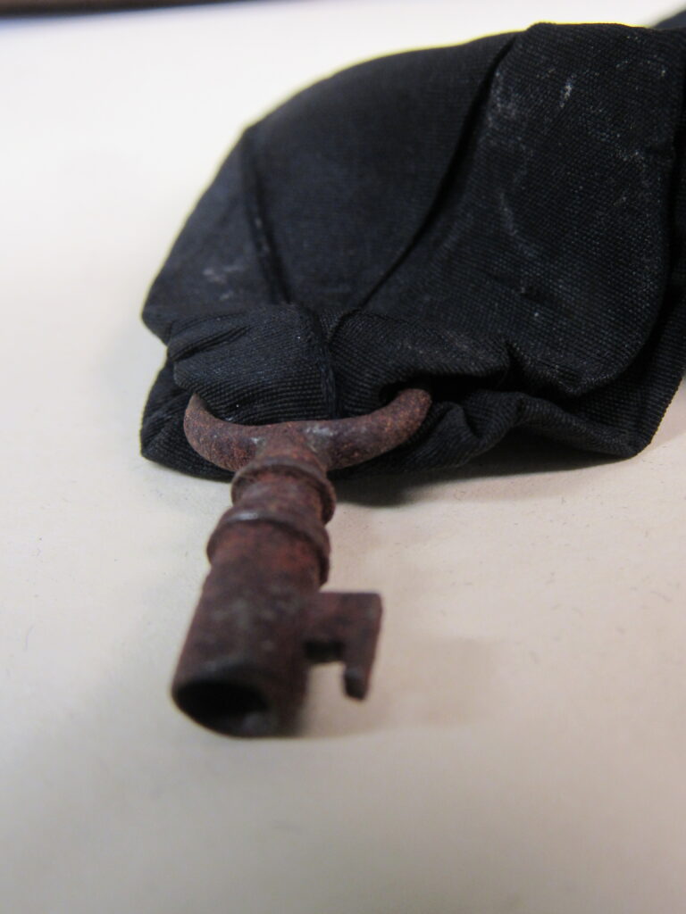 Chave de caixão, em ferro fundido, com vestígios de metal prateado, presa a tira de tecido de gorgorão de seda. Na parte superior do objeto, aro em formato oval, vazado, contendo fita larga (fúnebre) transpassada, em tecido preto (gorgorão de seda), com as extremidades do tecido recortadas em V e com resquícios de cera de vela branca em diversos pontos. Corpo da chave oco, de formato cilíndrico, com leve afunilamento na parte central próxima ao aro, ornado por três frisos em anel, dispostos um mais acima e dois deles sobrepostos em paralelo. Parte inferior com estrutura da tranca em formato geométrico quadrangular com pequena extensão em metal para encaixe no caixão.