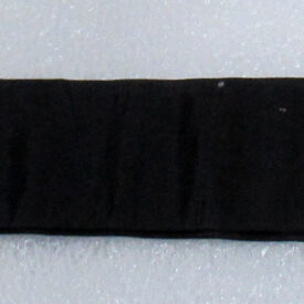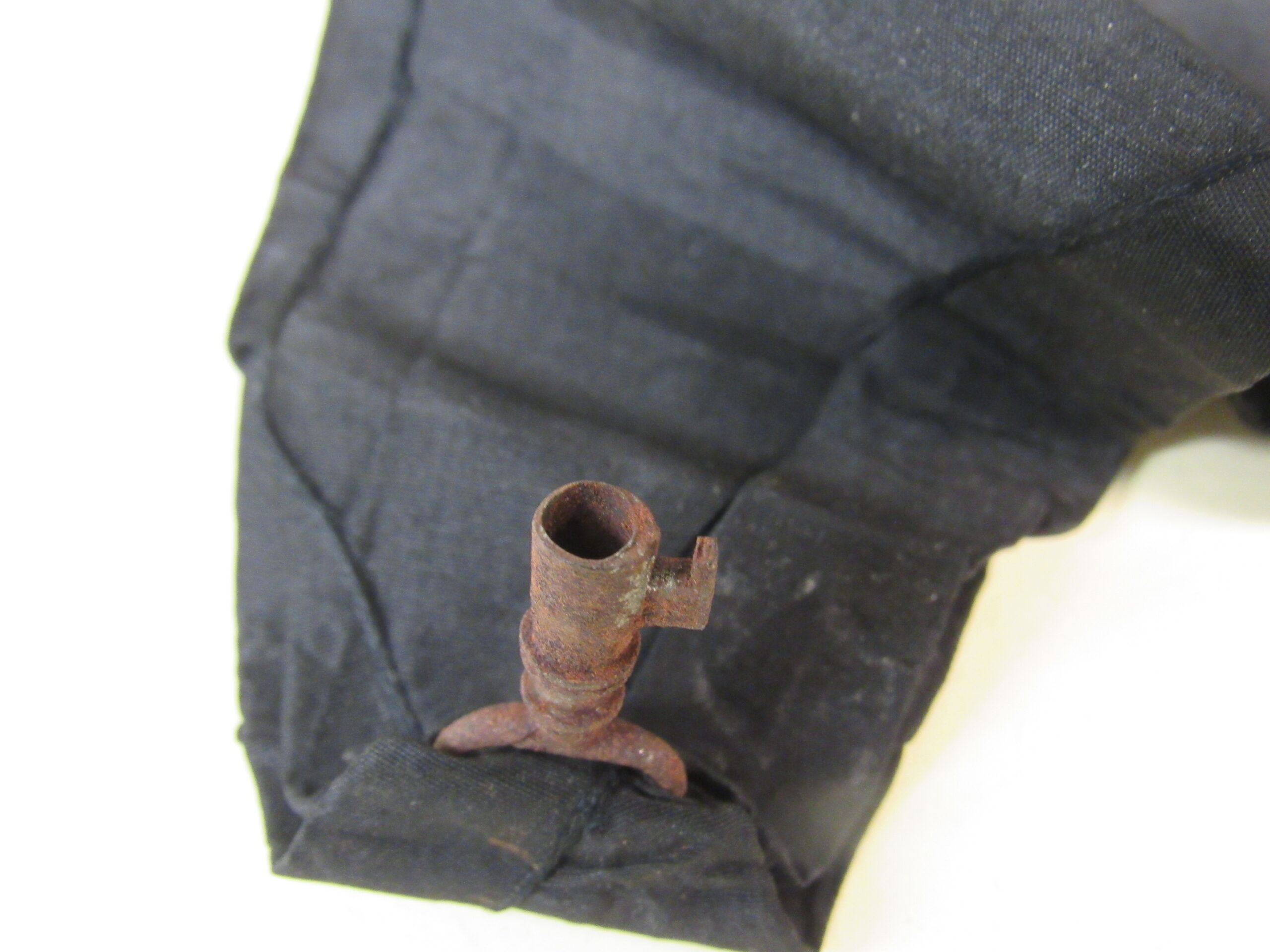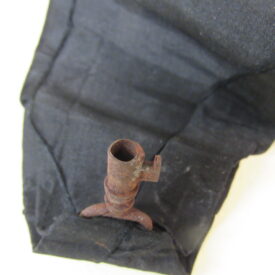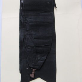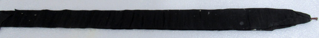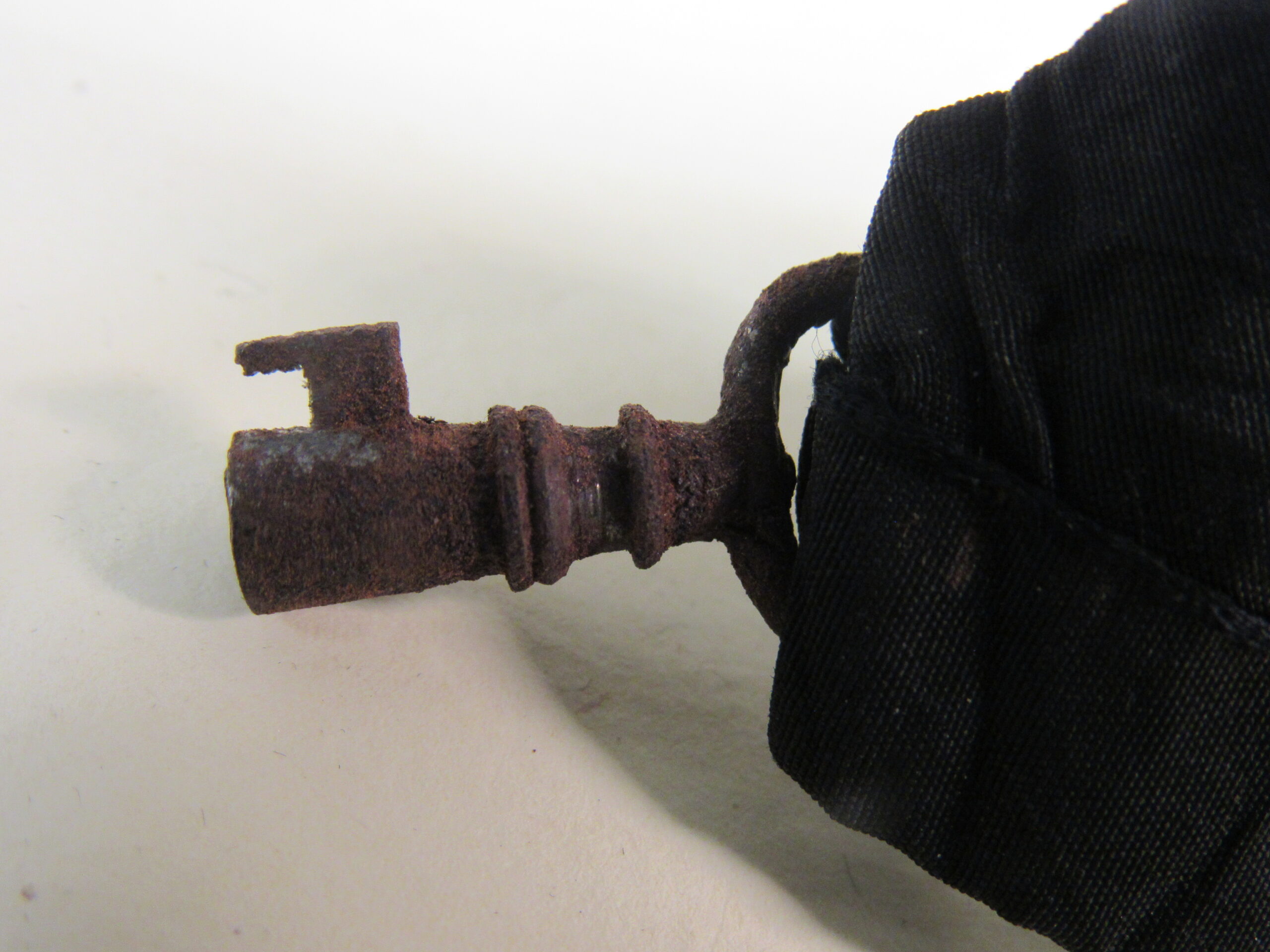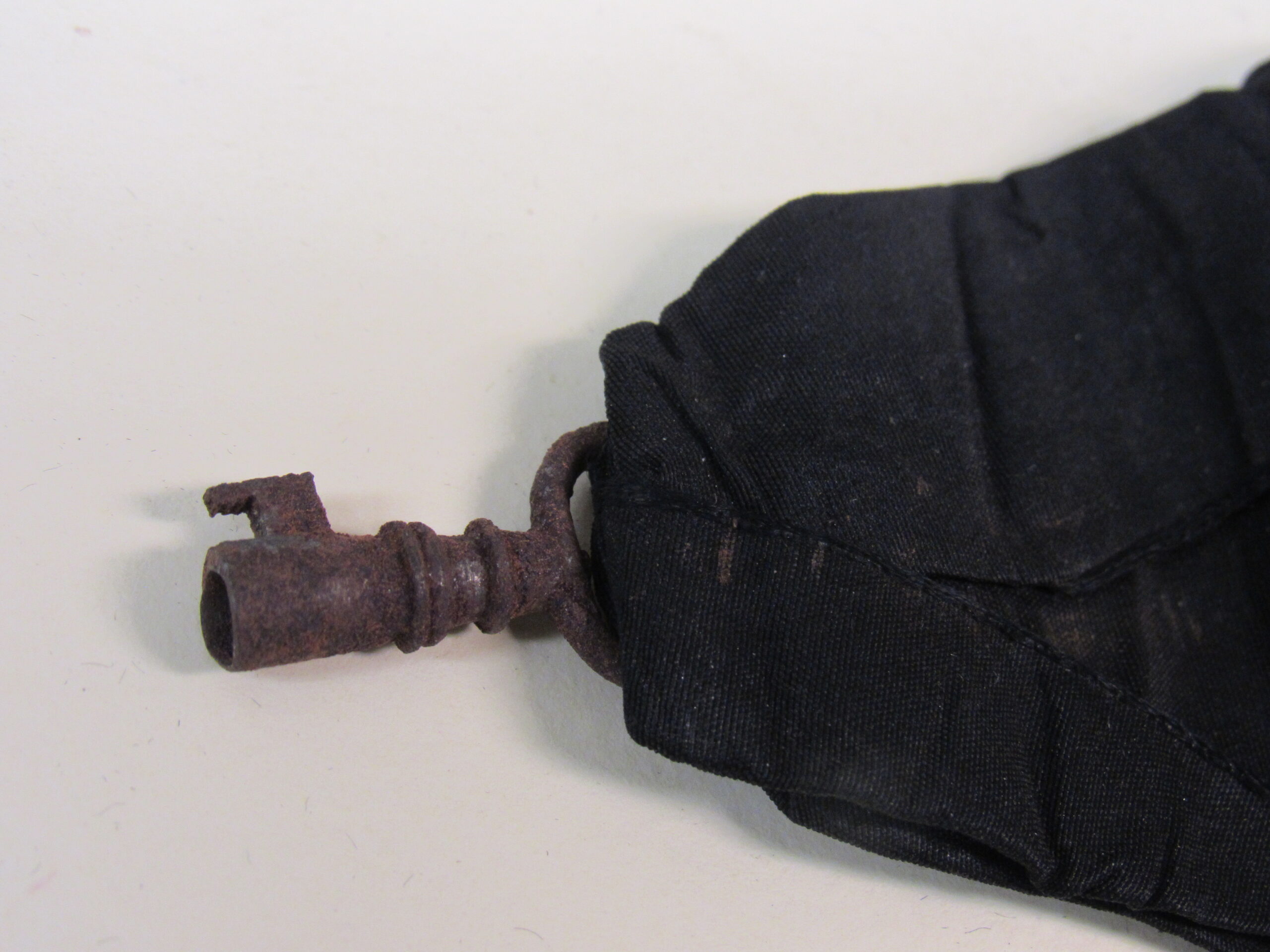 Chave de caixão, em ferro fundido, com vestígios de metal prateado, presa a tira de tecido de gorgorão de seda. Na parte superior do objeto, aro em formato oval, vazado, contendo fita larga (fúnebre) transpassada, em tecido preto (gorgorão de seda), com as extremidades do tecido recortadas em V e com resquícios de cera de vela branca em diversos pontos. Corpo da chave oco, de formato cilíndrico, com leve afunilamento na parte central próxima ao aro, ornado por três frisos em anel, dispostos um mais acima e dois deles sobrepostos em paralelo. Parte inferior com estrutura da tranca em formato geométrico quadrangular com pequena extensão em metal para encaixe no caixão.