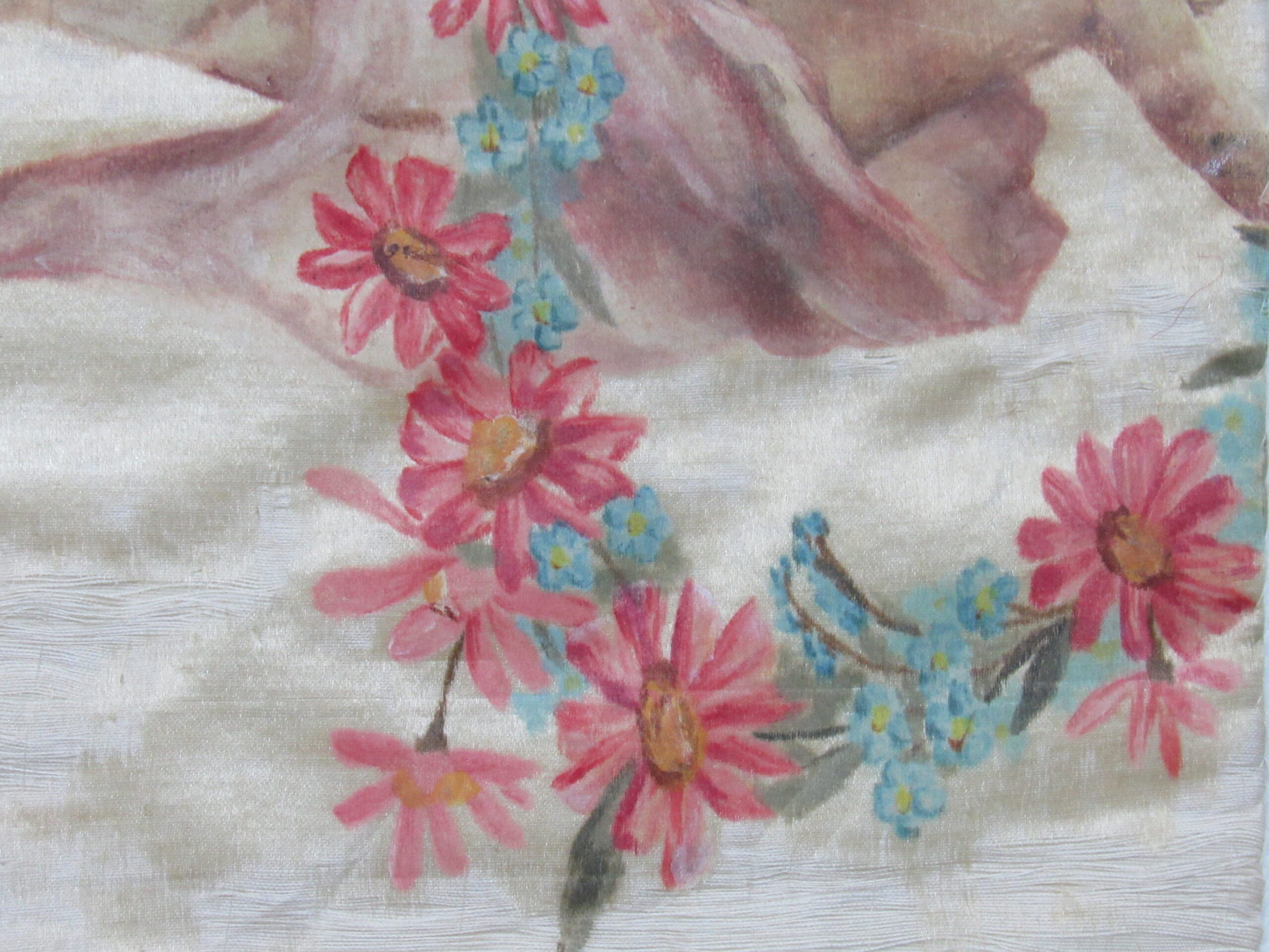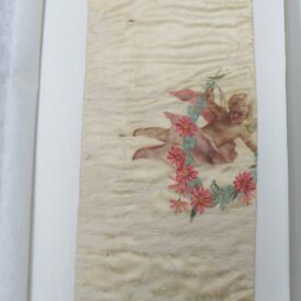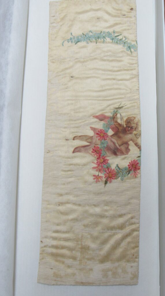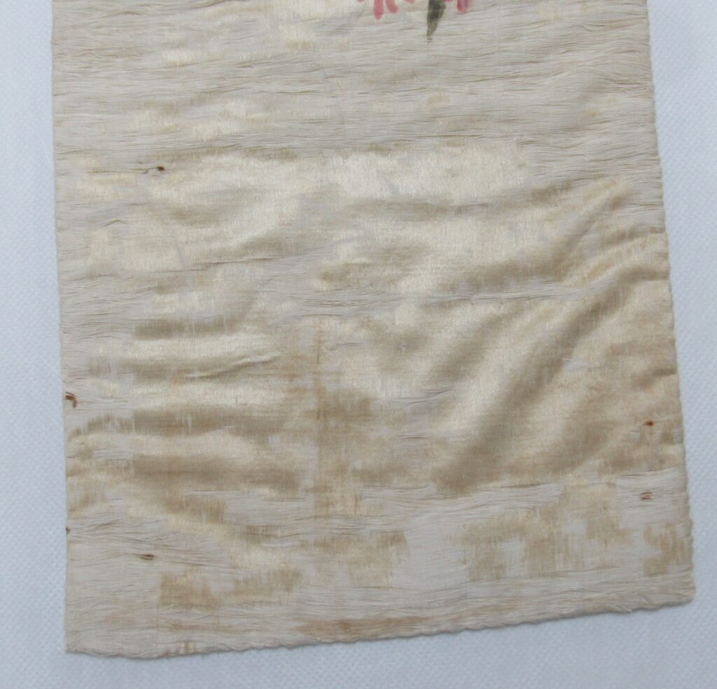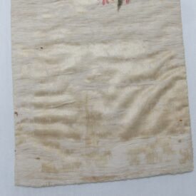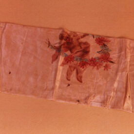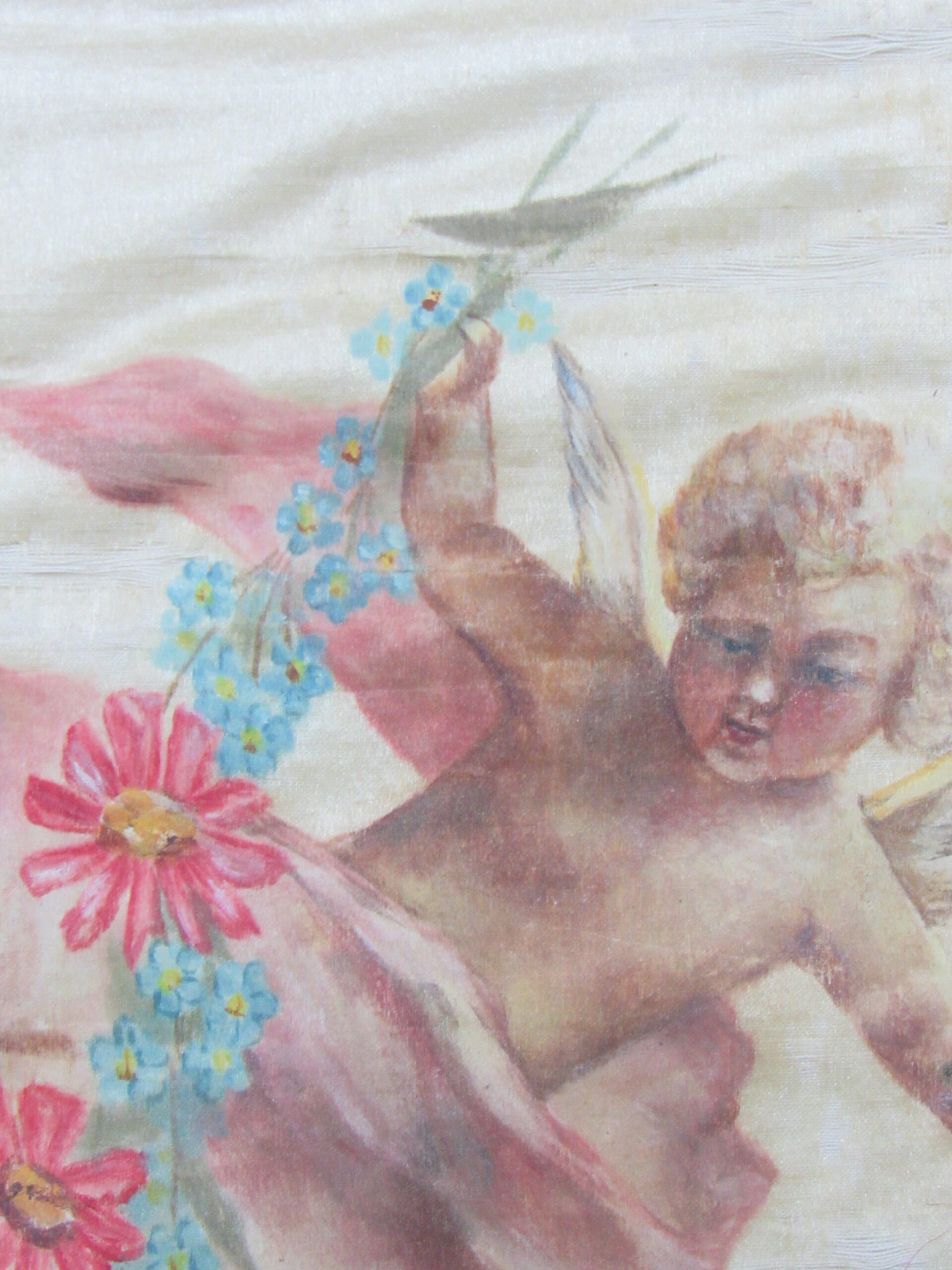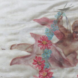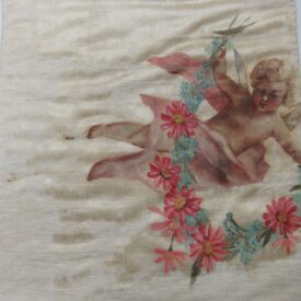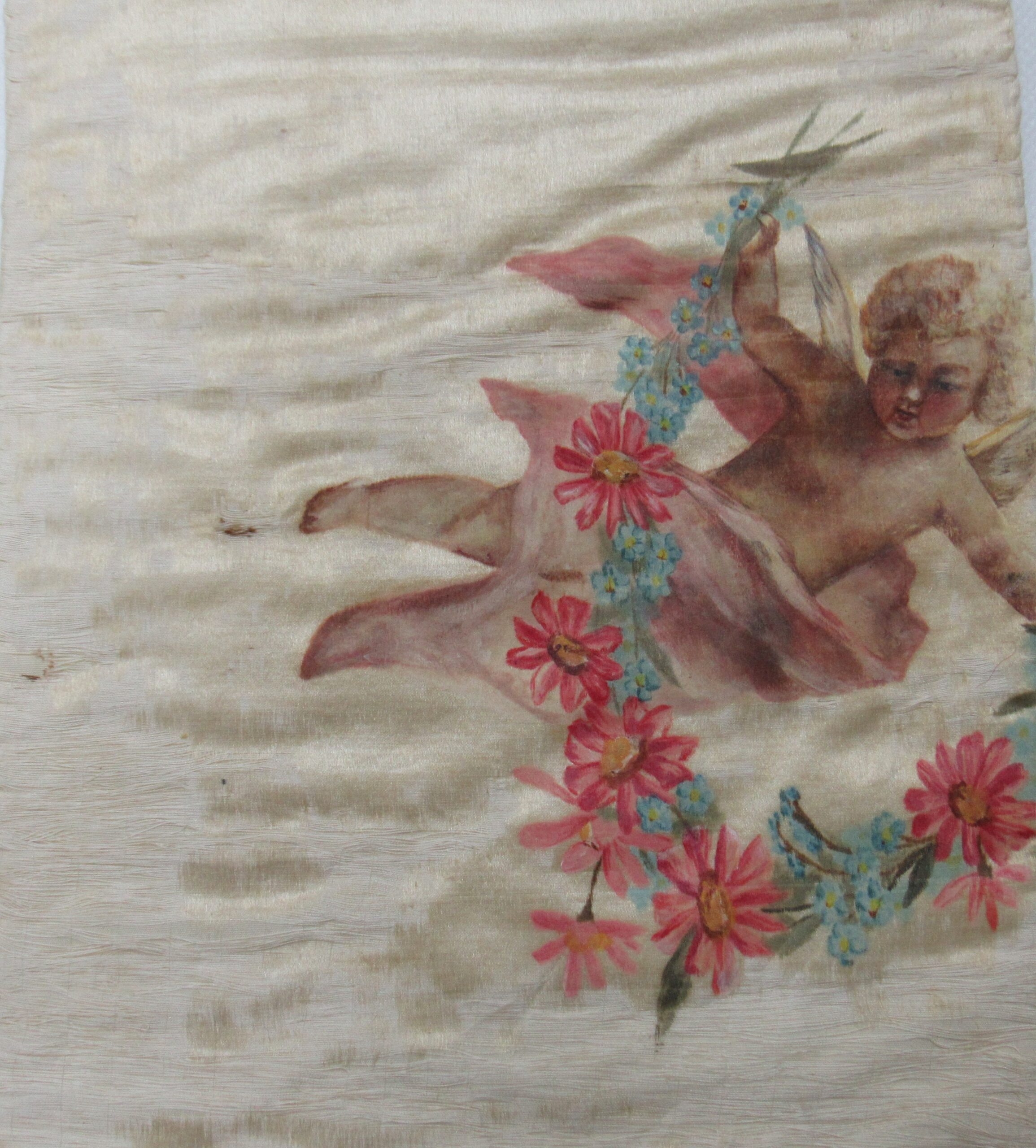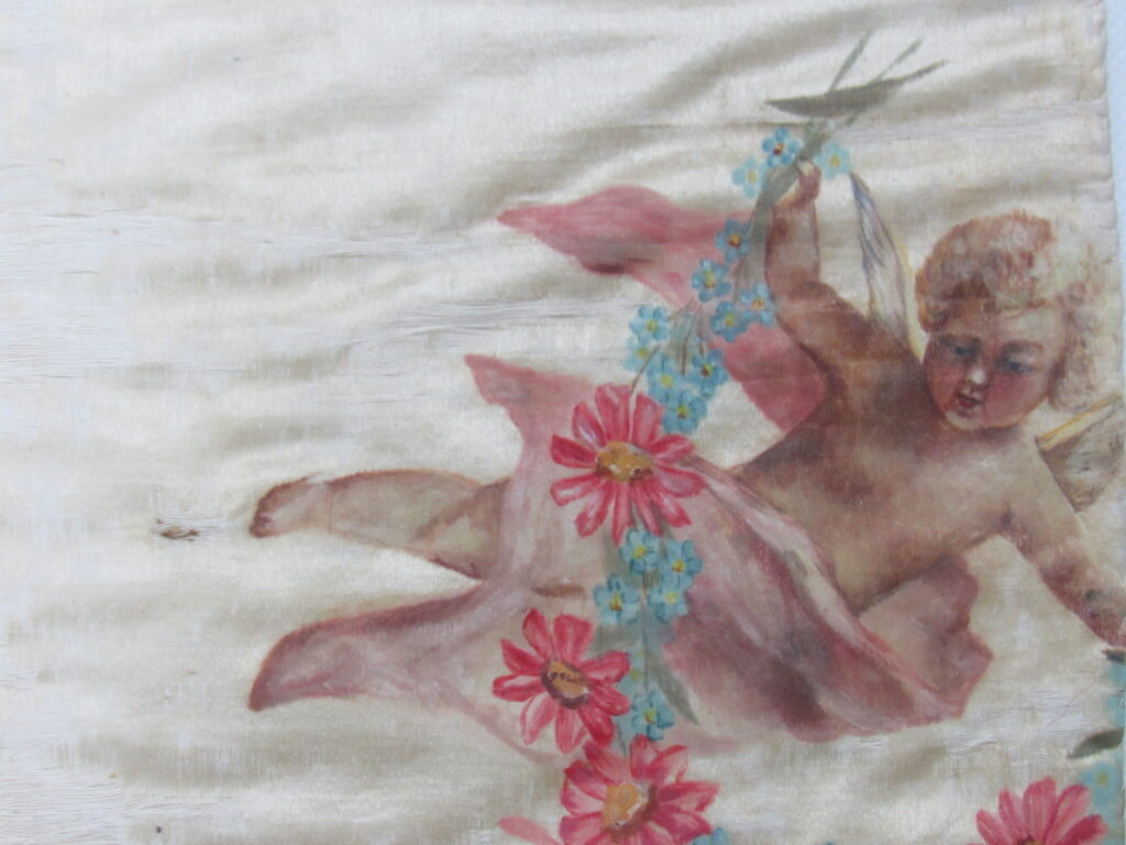 Conopeu (fragmento), confeccionado em tecido de seda na cor creme, com pintura decorativa. Objeto também conhecido pela designação de Cortina ou Véu de Sacrário. Peça de formato alongado, apresentando, a meio, próximo à lateral à direita, à guisa de ornamentação, pintura policrômica constituída por figura de criança representando um anjo em atitude de voo, com o corpo desnudo envolvido por faixa de tecido esvoaçante, em tom de rosa, que lhe cobre as partes, tendo os braços abertos e segurando, com ambas as mãos, uma guirlanda de flores em tons de azul, rosa e vermelho. Mais acima desta cena, aparece uma guirlanda de flores azuis, também pintada. A seda é forrada em tecido de algodão cru.