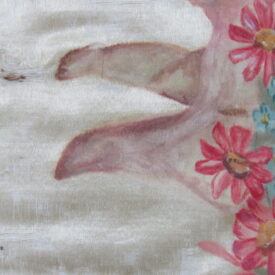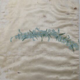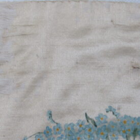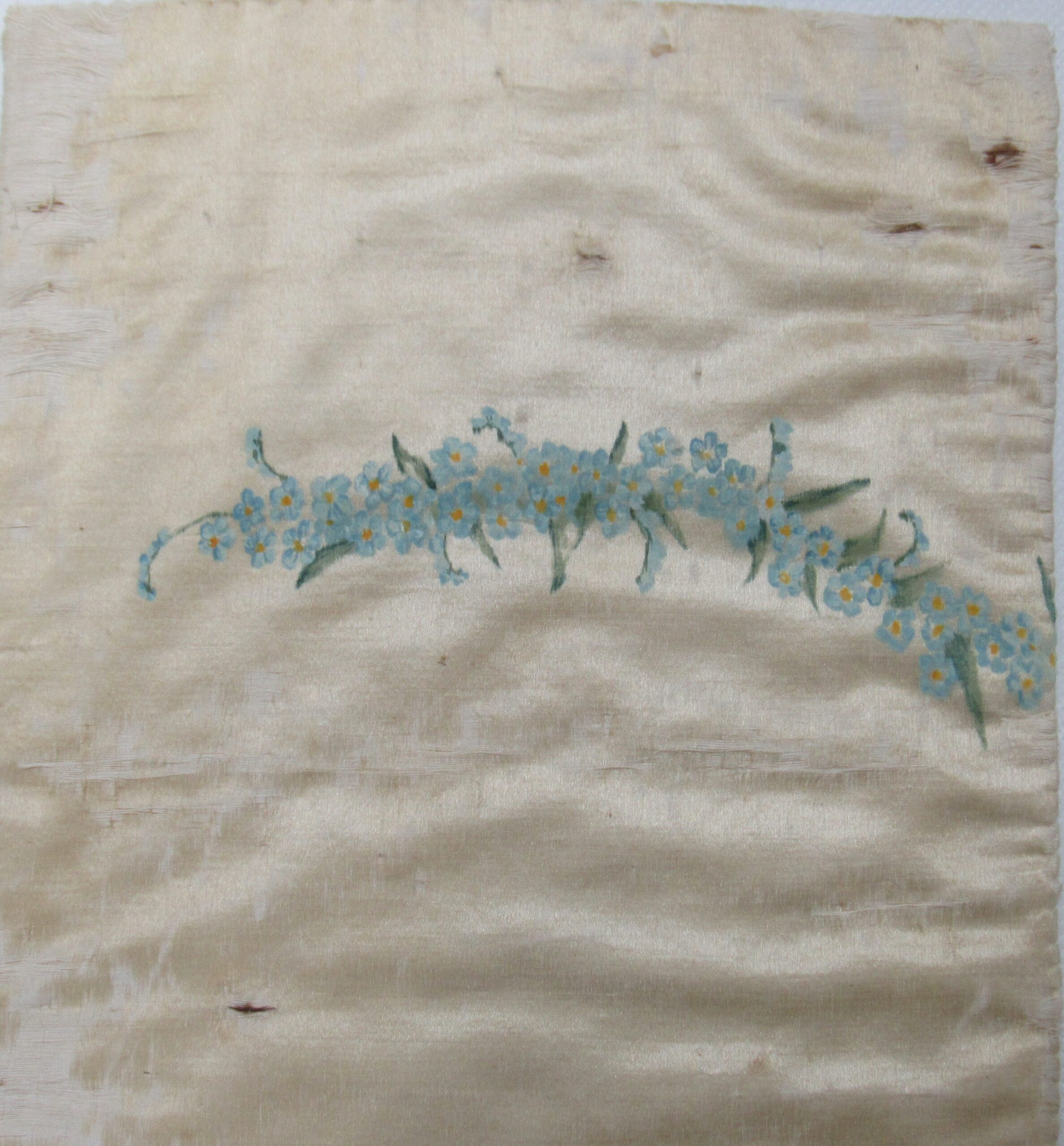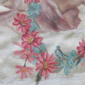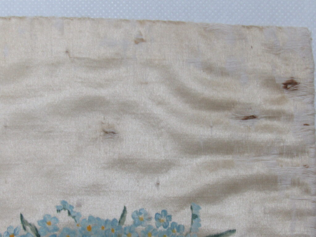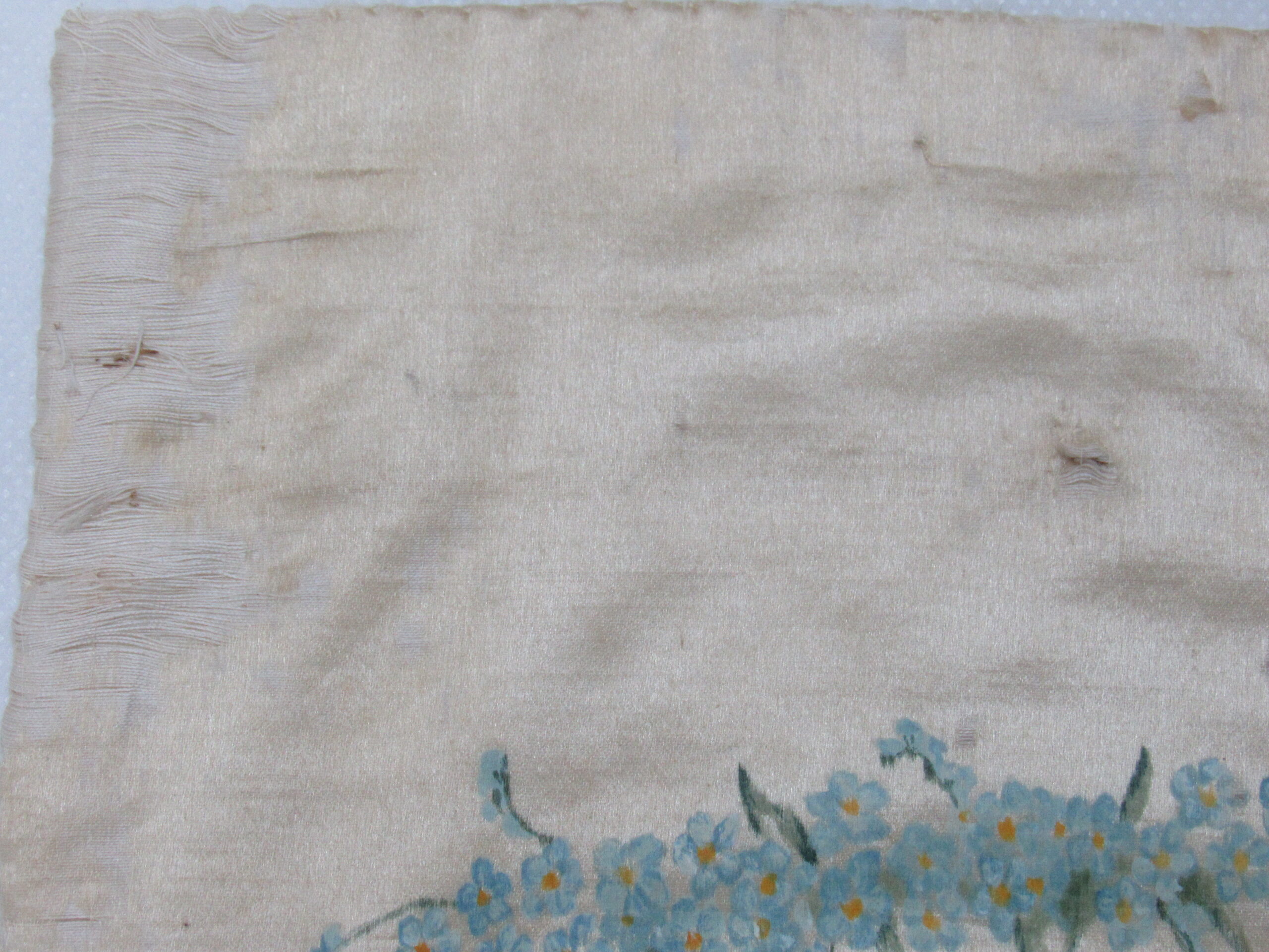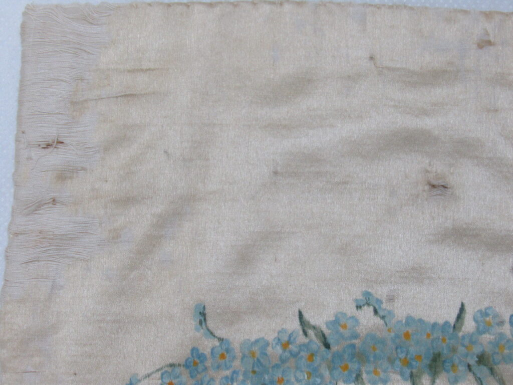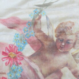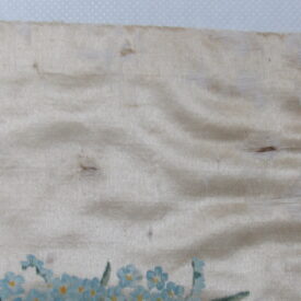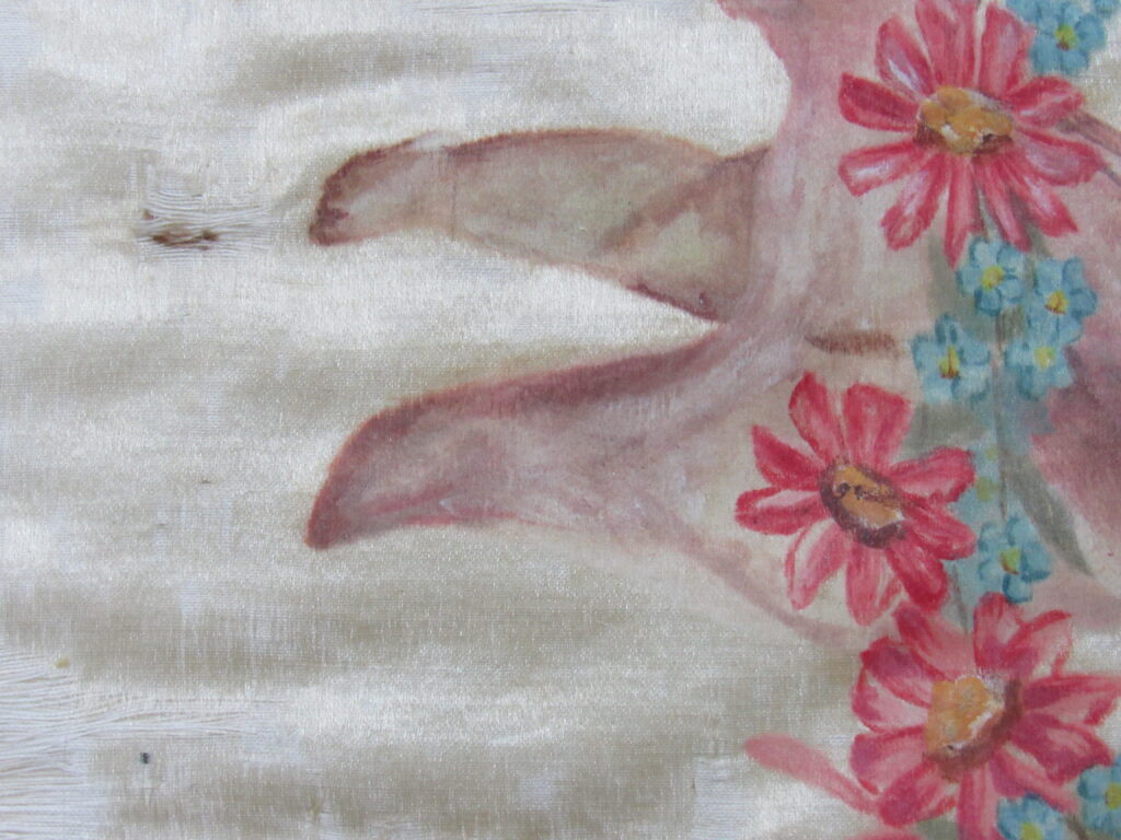Conopeu (fragmento), confeccionado em tecido de seda na cor creme, com pintura decorativa. Objeto também conhecido pela designação de Cortina ou Véu de Sacrário. Peça de formato alongado, apresentando, a meio, próximo à lateral à direita, à guisa de ornamentação, pintura policrômica constituída por figura de criança representando um anjo em atitude de voo, com o corpo desnudo envolvido por faixa de tecido esvoaçante, em tom de rosa, que lhe cobre as partes, tendo os braços abertos e segurando, com ambas as mãos, uma guirlanda de flores em tons de azul, rosa e vermelho. Mais acima desta cena, aparece uma guirlanda de flores azuis, também pintada. A seda é forrada em tecido de algodão cru.