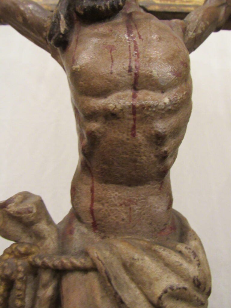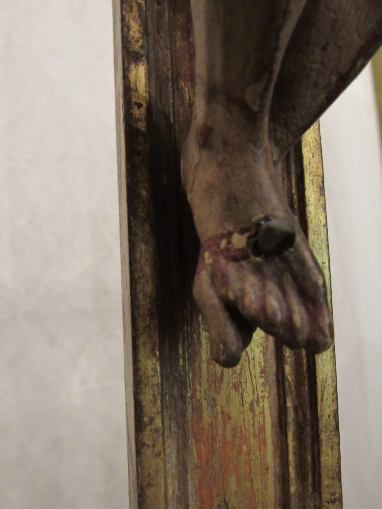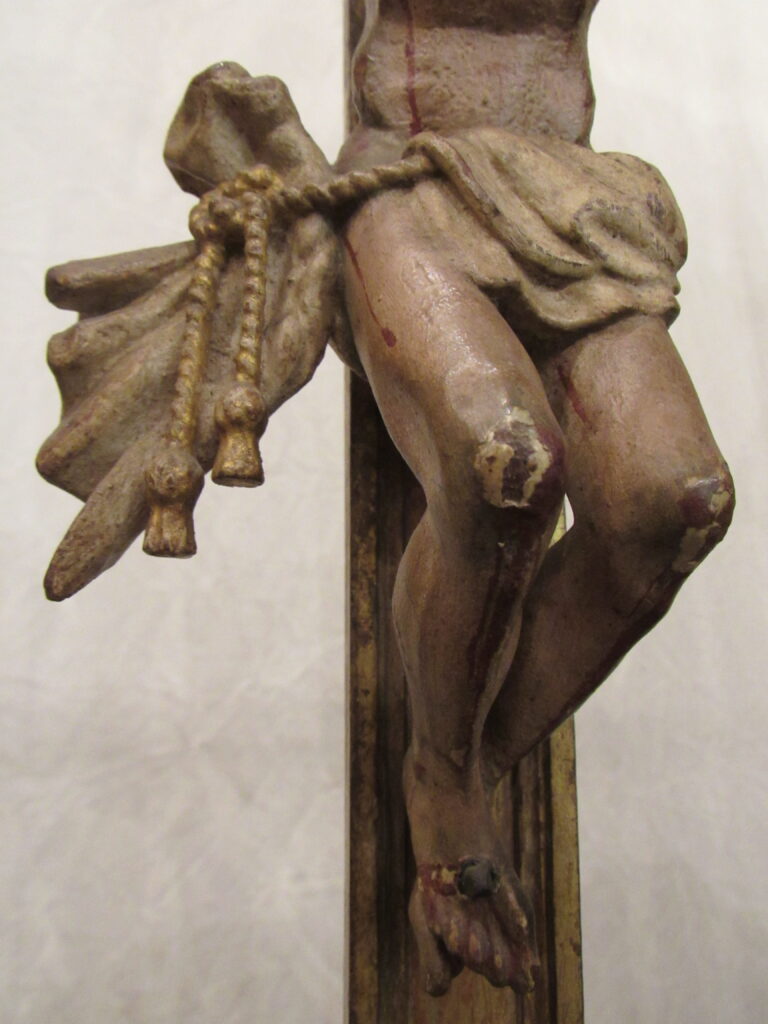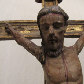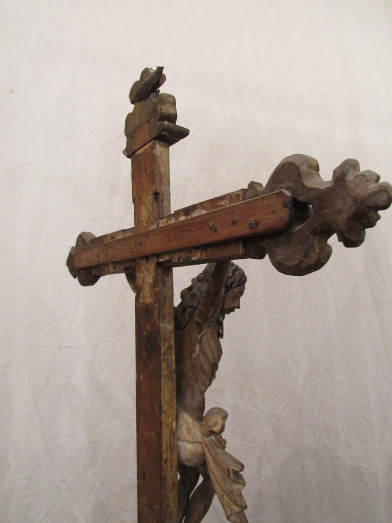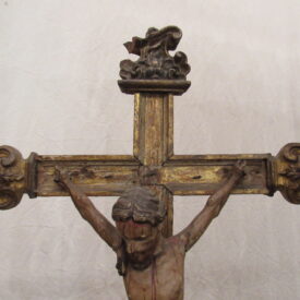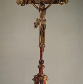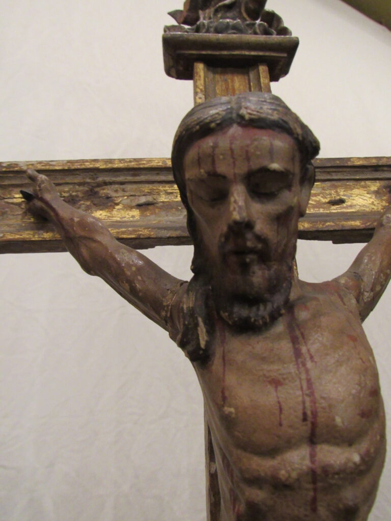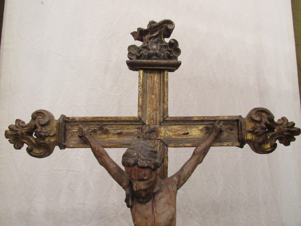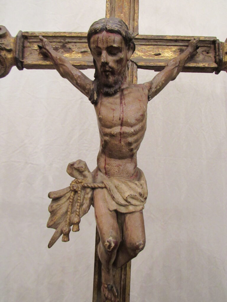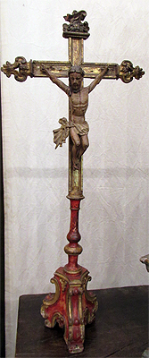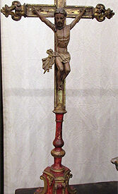 Crucifixo, em madeira torneada e esculpida, pintada e dourada, contendo imagem em madeira esculpida, pintada e dourada representando o Cristo Crucificado, também denominado Nosso Senhor do Bonfim. Figura masculina, posta na cruz, com a cabeça inclinada à sua direita, cabelos castanhos semilongos e lisos, com mecha caída à frente do ombro direito; orelha esquerda aparente, sobrancelhas castanhas pintadas, olhos fechados, nariz arrebitado, boca fechada e barba castanha curta. Braços estendidos e presos à cruz através de cravos (em madeira). Musculatura do corpo definida. Perizônio envolto na cintura, amarrado por cordão dourado. Panejamento movimentado. Pernas flexionadas, tendo o pé direito sobre o esquerdo, com cravo transpassado. Ao longo do corpo, marcas de sangue das feridas, representadas através de tinta vermelha, na testa, pescoço, ombros, peito, quadris, joelhos e pés. O corpo está preso à cruz dourada, com florões nas ponteiras, suportada por coluna torneada e peanha em tripé, com motivos decorativos esculpidos em volutas, pintada de vermelho e dourada.