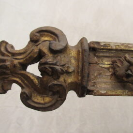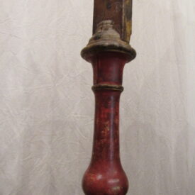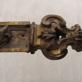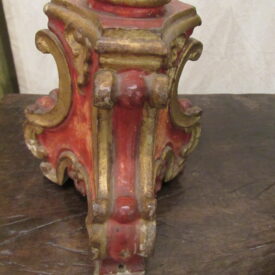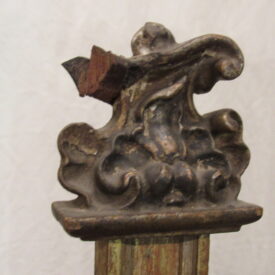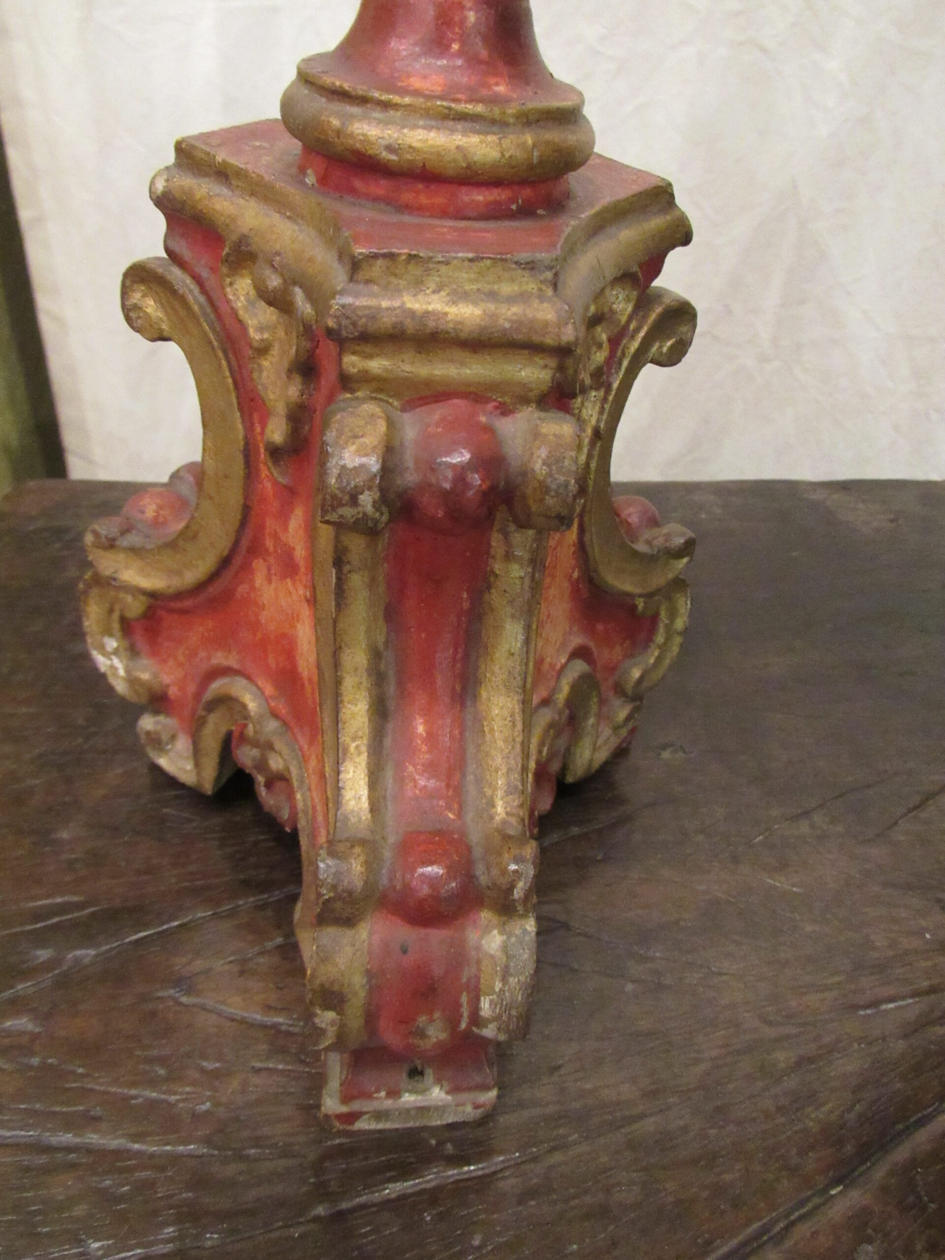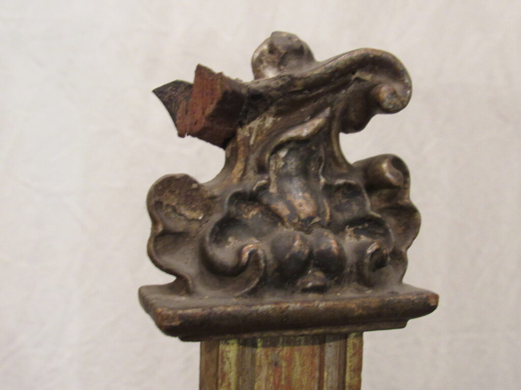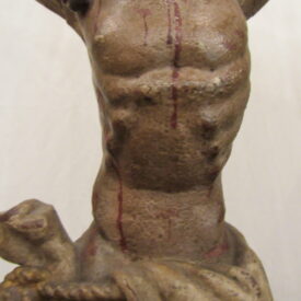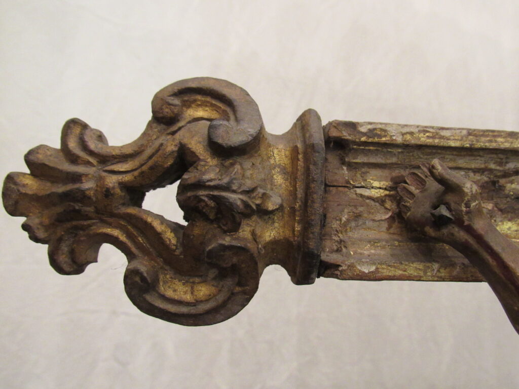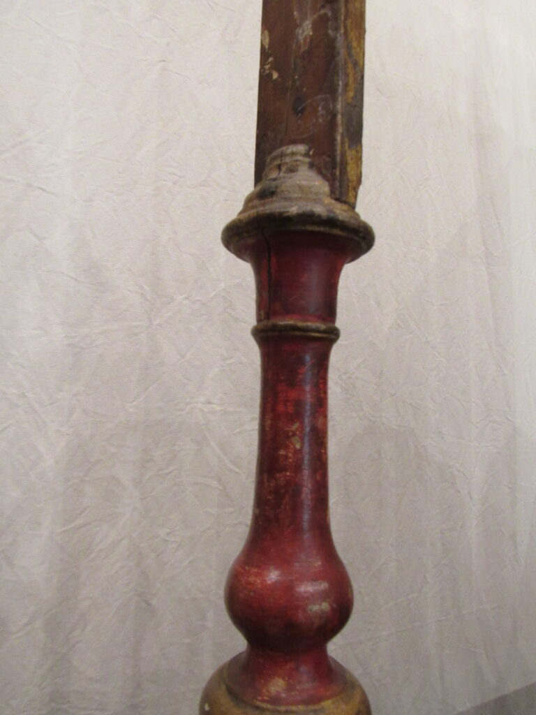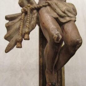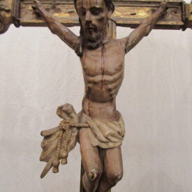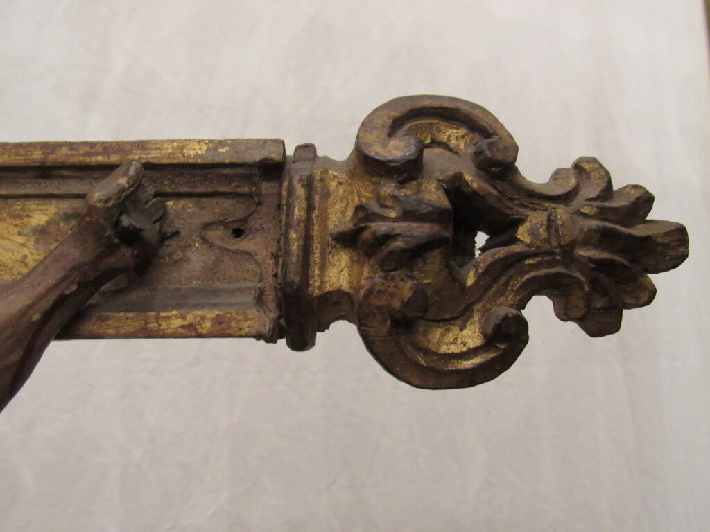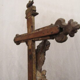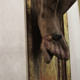 Crucifixo, em madeira torneada e esculpida, pintada e dourada, contendo imagem em madeira esculpida, pintada e dourada representando o Cristo Crucificado, também denominado Nosso Senhor do Bonfim. Figura masculina, posta na cruz, com a cabeça inclinada à sua direita, cabelos castanhos semilongos e lisos, com mecha caída à frente do ombro direito; orelha esquerda aparente, sobrancelhas castanhas pintadas, olhos fechados, nariz arrebitado, boca fechada e barba castanha curta. Braços estendidos e presos à cruz através de cravos (em madeira). Musculatura do corpo definida. Perizônio envolto na cintura, amarrado por cordão dourado. Panejamento movimentado. Pernas flexionadas, tendo o pé direito sobre o esquerdo, com cravo transpassado. Ao longo do corpo, marcas de sangue das feridas, representadas através de tinta vermelha, na testa, pescoço, ombros, peito, quadris, joelhos e pés. O corpo está preso à cruz dourada, com florões nas ponteiras, suportada por coluna torneada e peanha em tripé, com motivos decorativos esculpidos em volutas, pintada de vermelho e dourada.