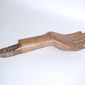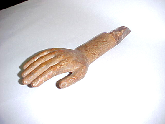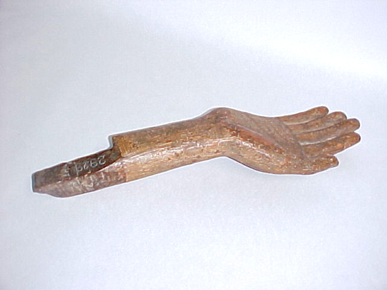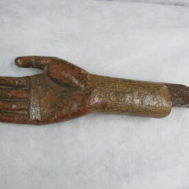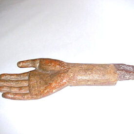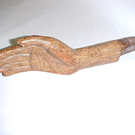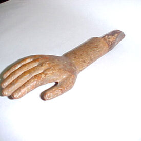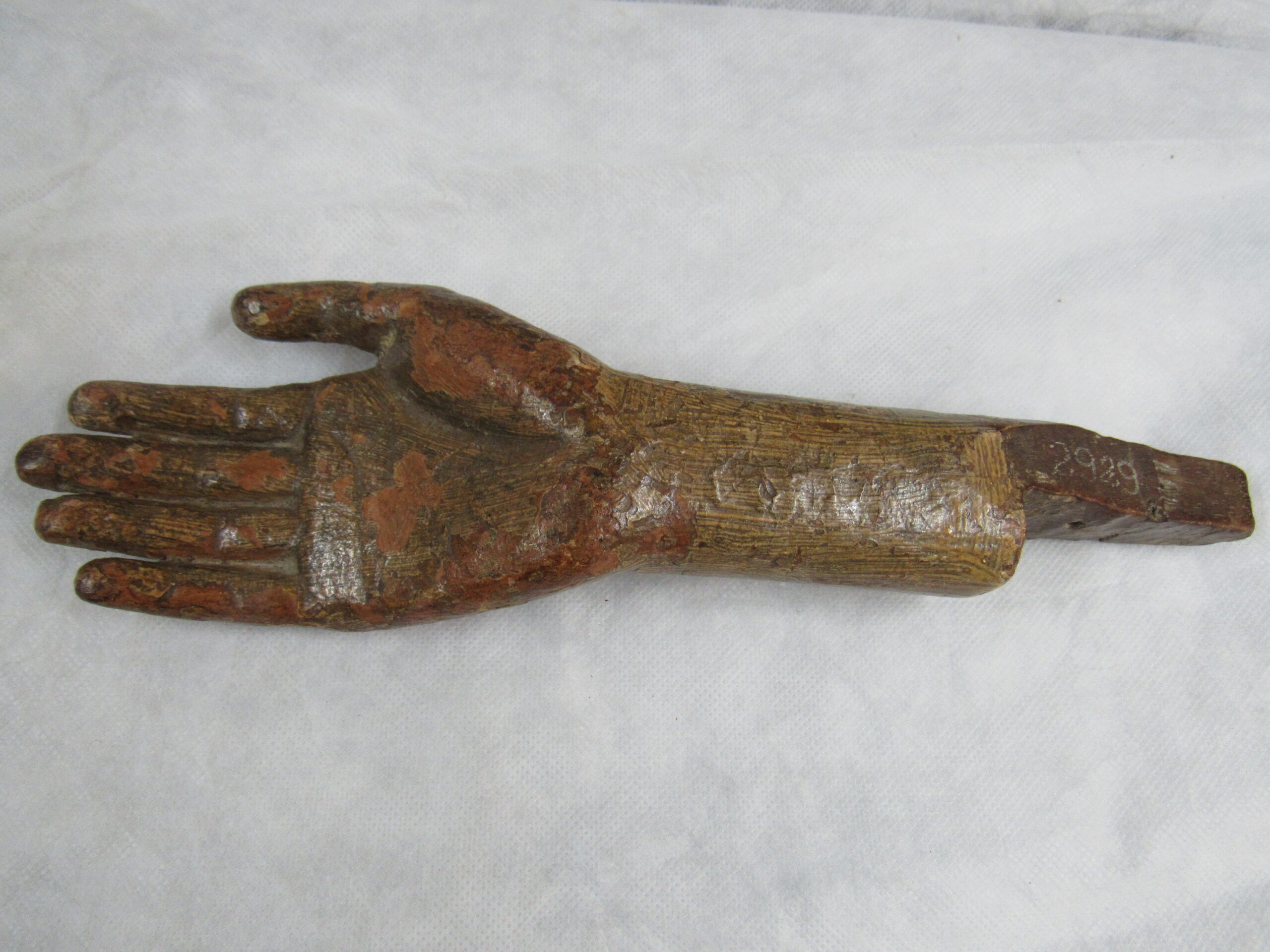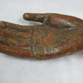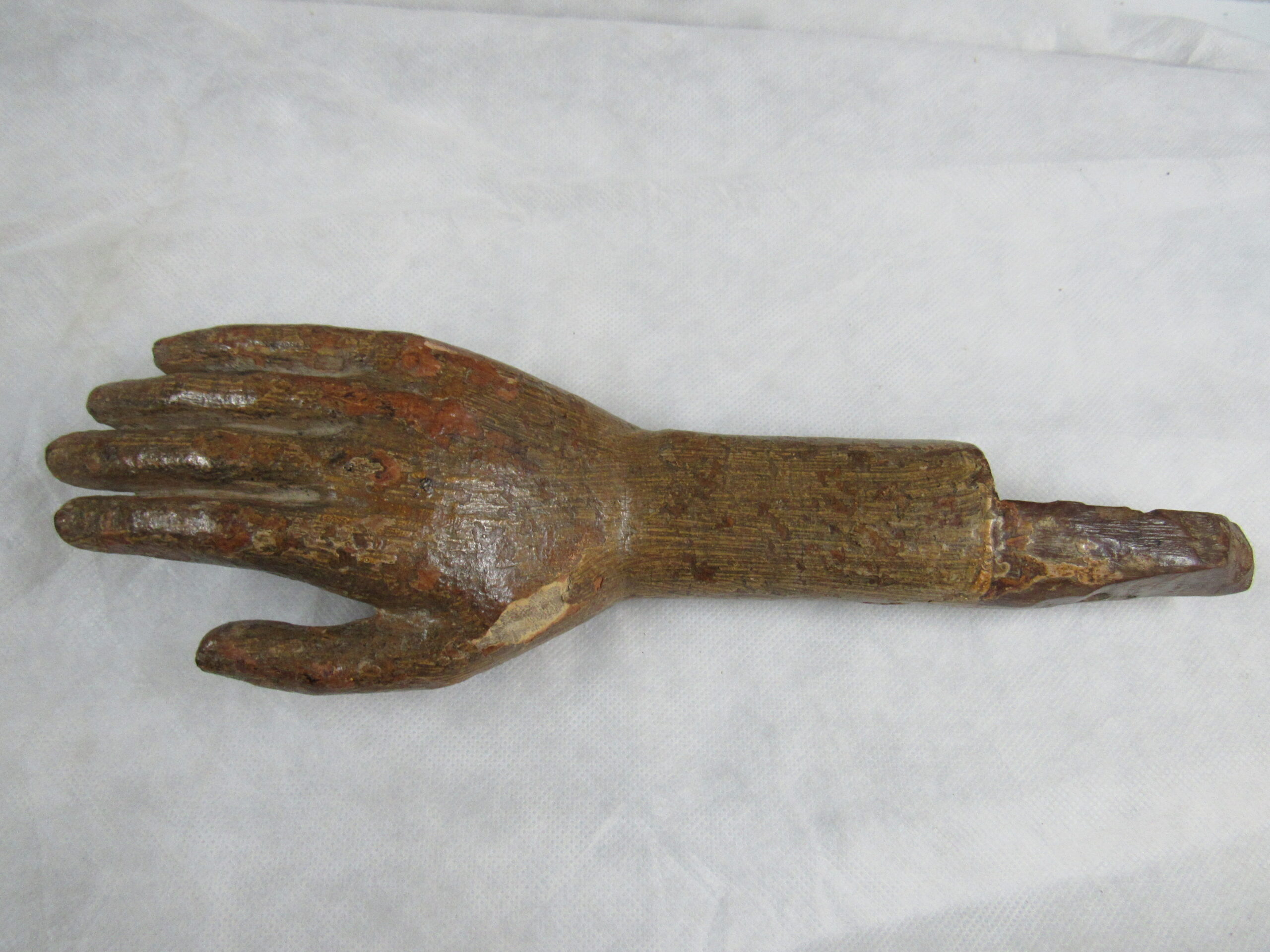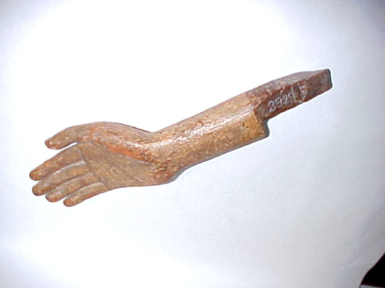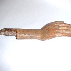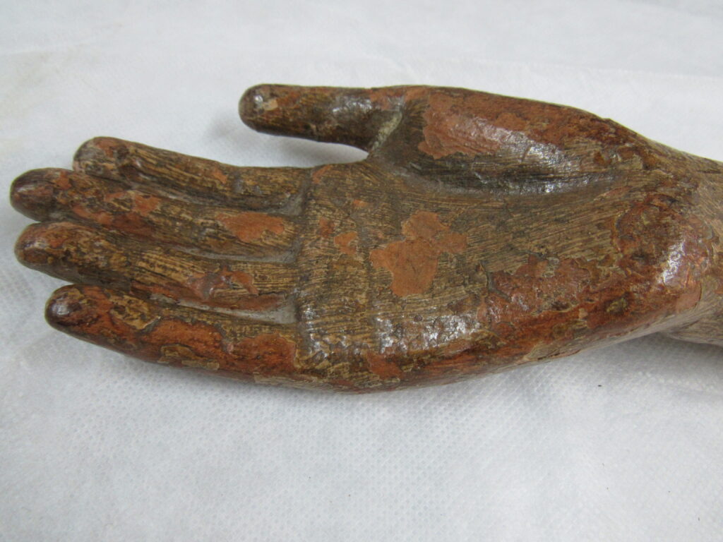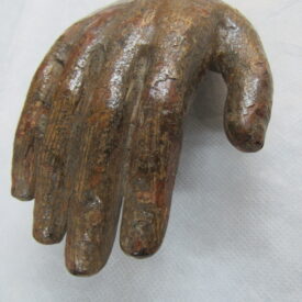 Escultura Religiosa de Roca (fragmento): mão, em madeira esculpida e pintada. Mão e pulso de imagem não identificada, com prolongamento de encaixe na estrutura do corpo da escultura religiosa. Mão espalmada e dedos em posição retilínea.