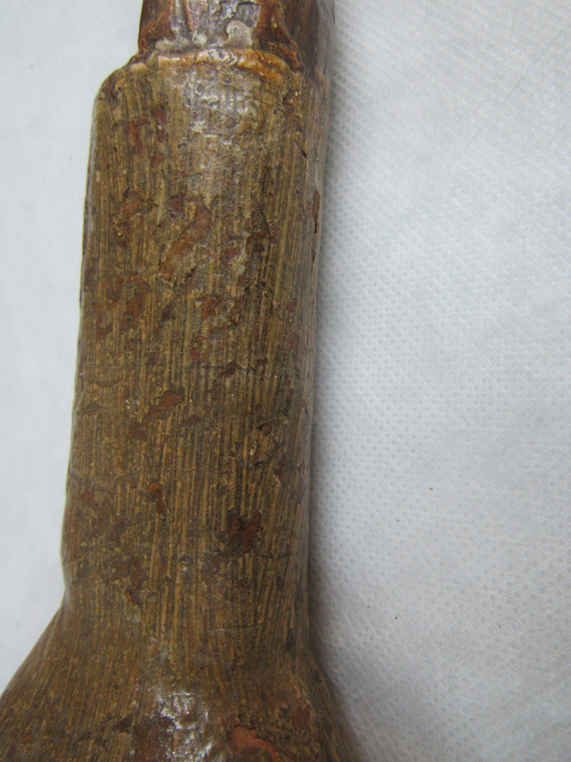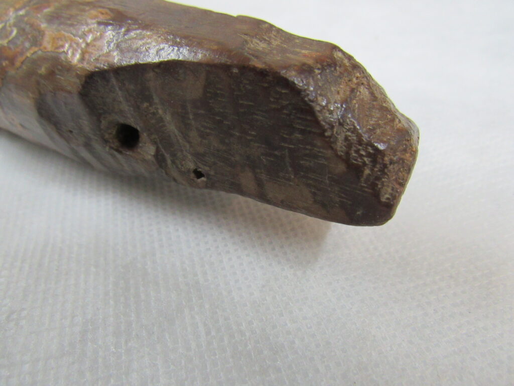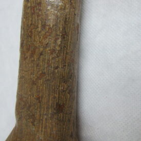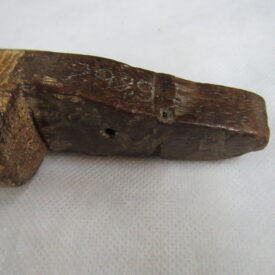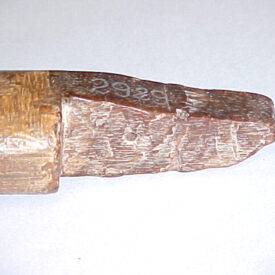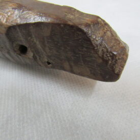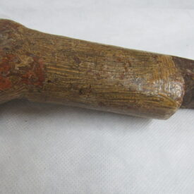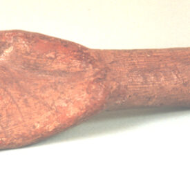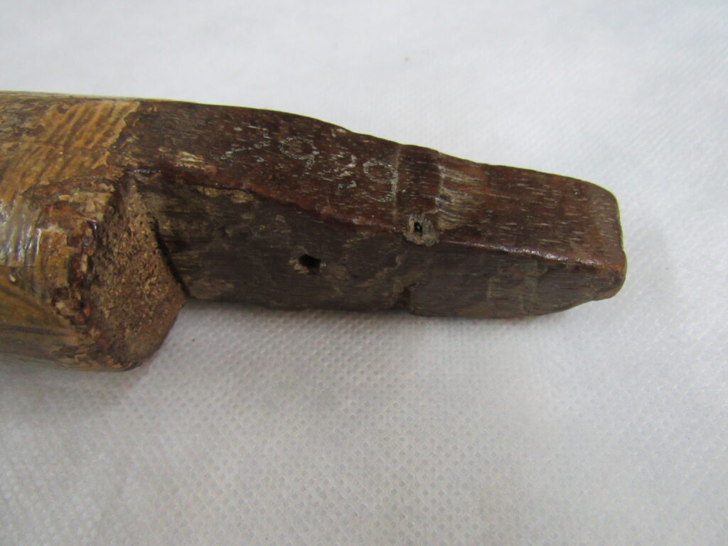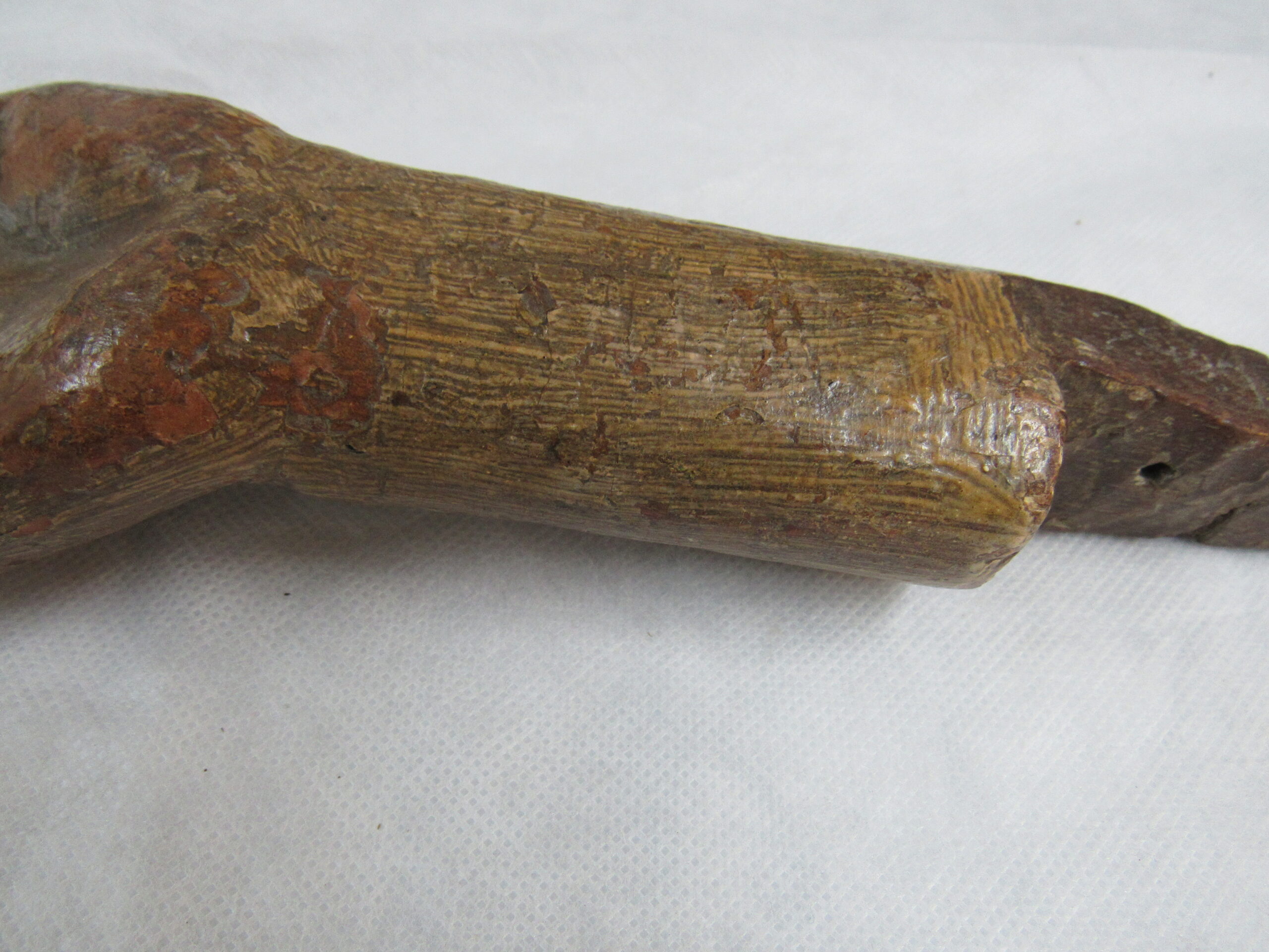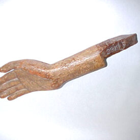 Escultura Religiosa de Roca (fragmento): mão, em madeira esculpida e pintada. Mão e pulso de imagem não identificada, com prolongamento de encaixe na estrutura do corpo da escultura religiosa. Mão espalmada e dedos em posição retilínea.