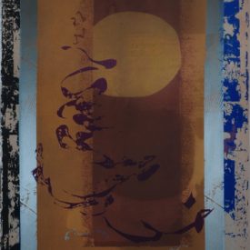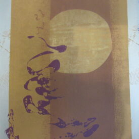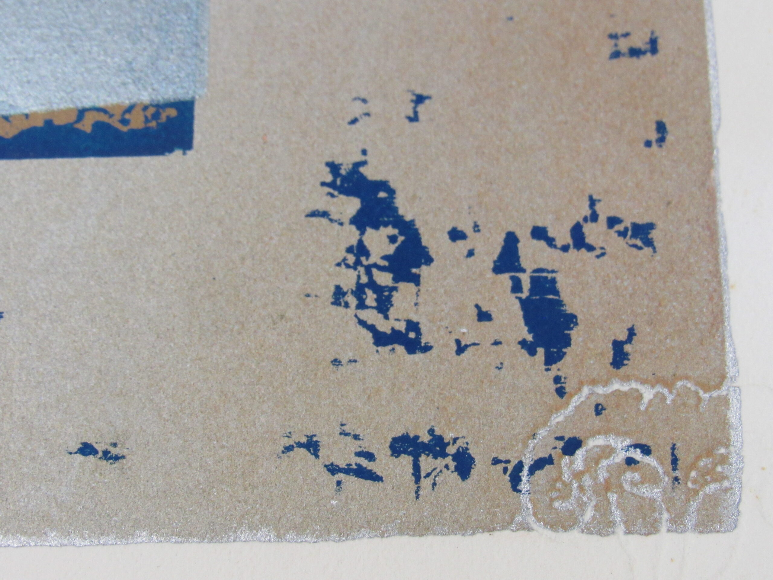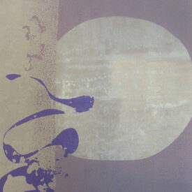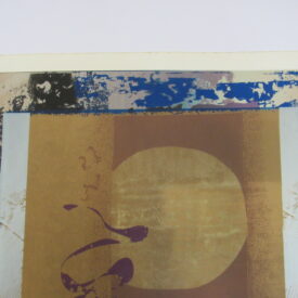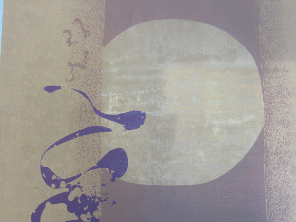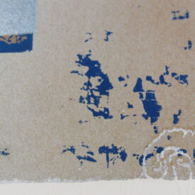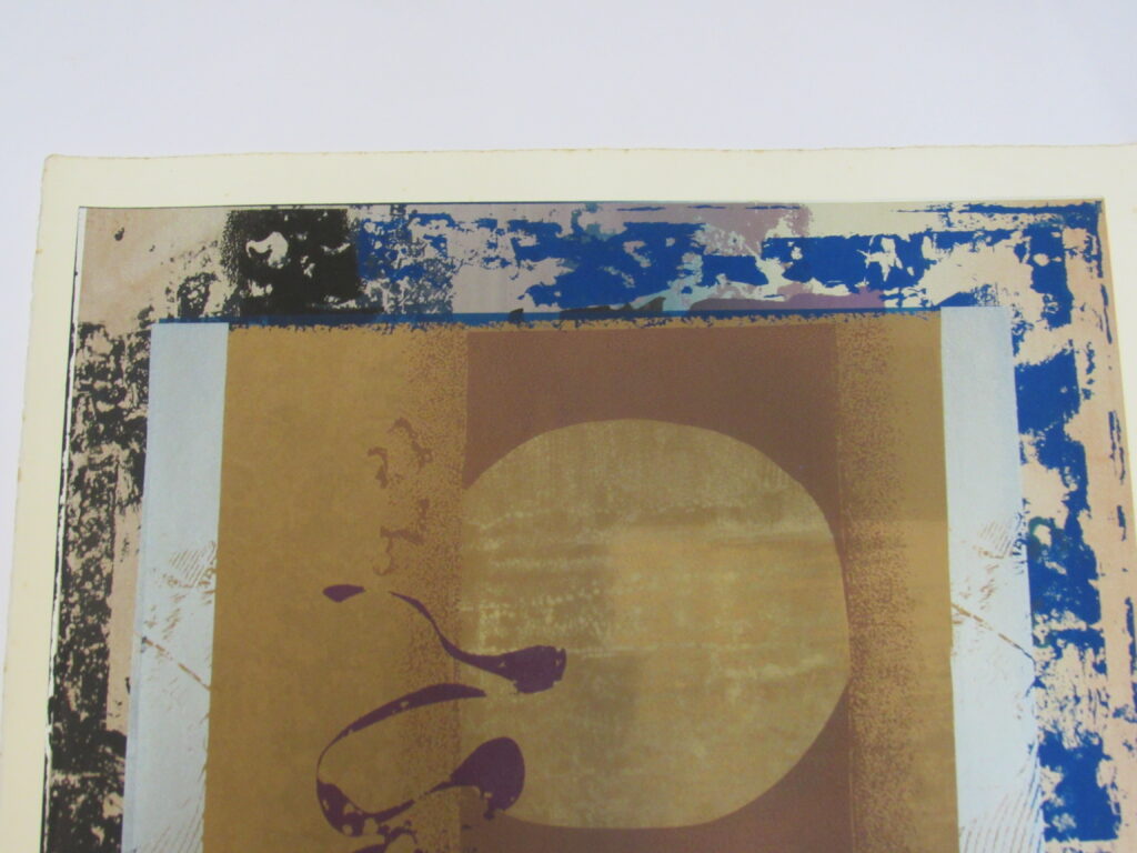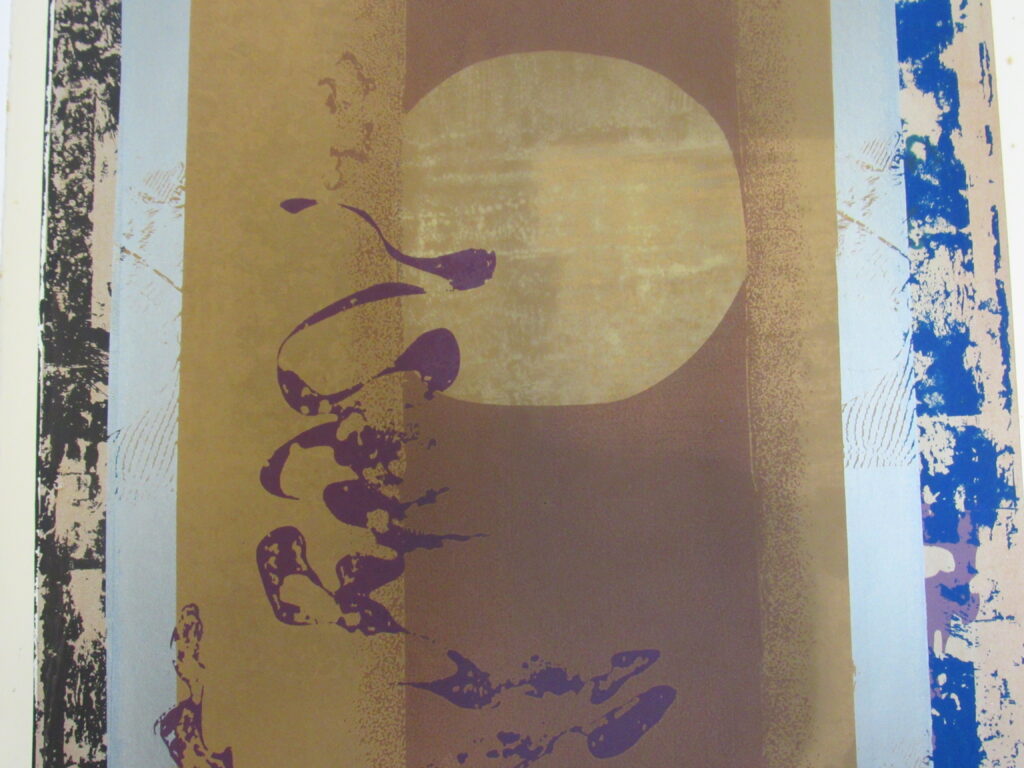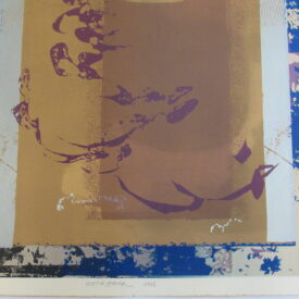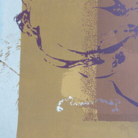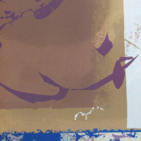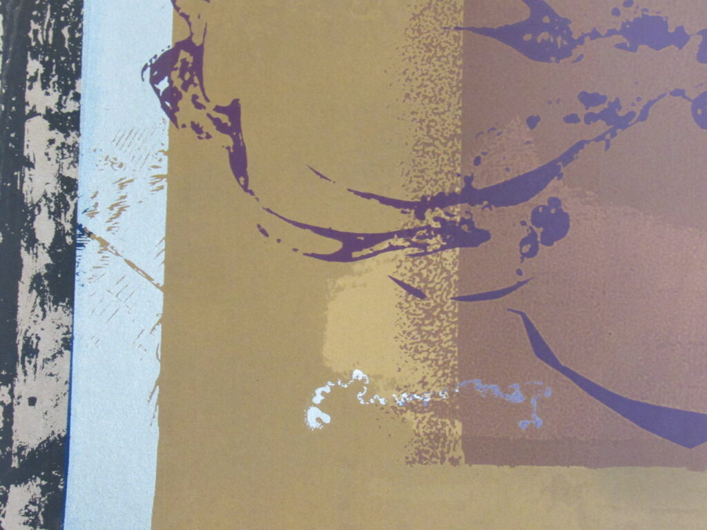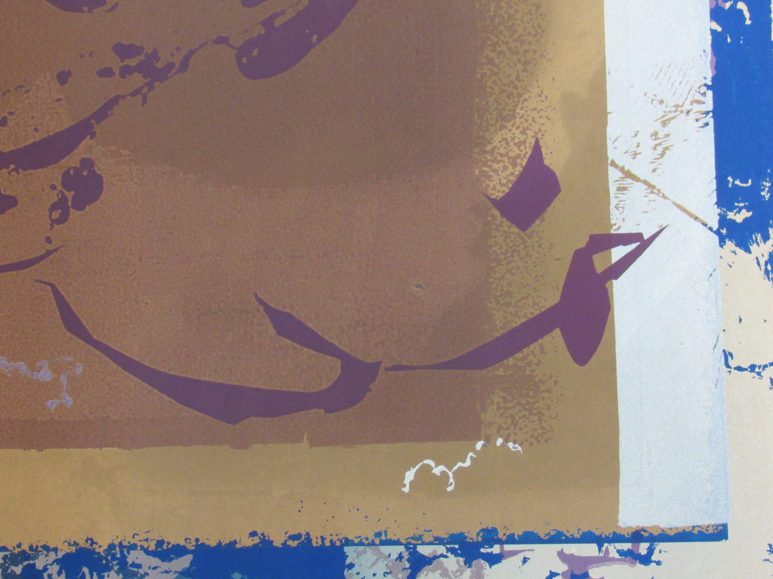 Estampa de estrutura vertical, com representação de desenho abstrato em tons roxo, preto, azul, castanho, amarelo ocre, cinza e branco. Ao centro, motivos abstratos em tom roxo que se entremeiam à esquerda de esfera representada em tom claro sob fundo castanho ladeado por colunas em tom amarelo ocre e cinza. Desenho central cercado por chamuscado em tom azul sob fundo branco, à direita do observador e, à esquerda, chamuscado em tom preto seguindo a mesma padronagem. Peça assinada (vide Marcas/Inscrições).