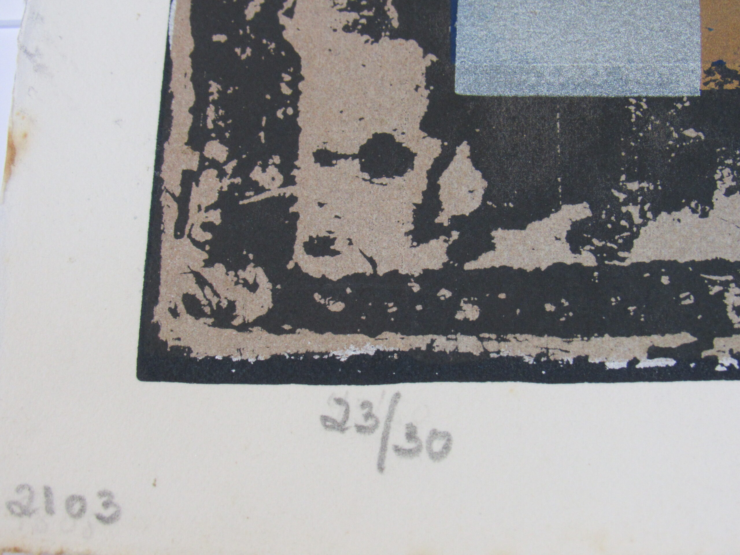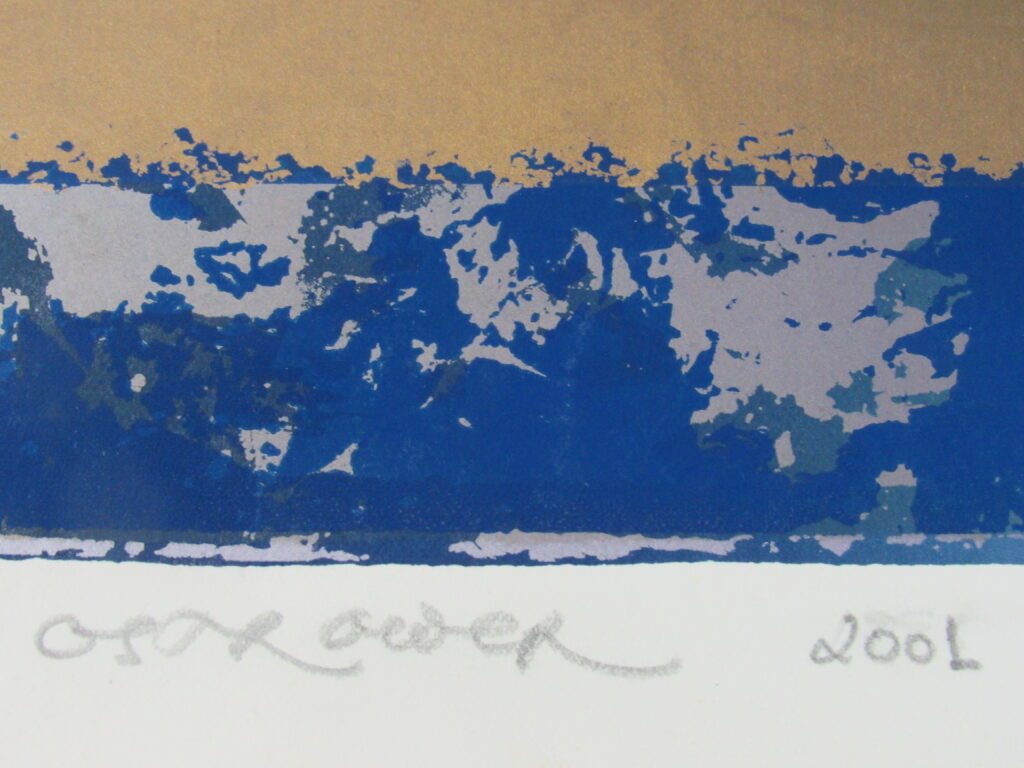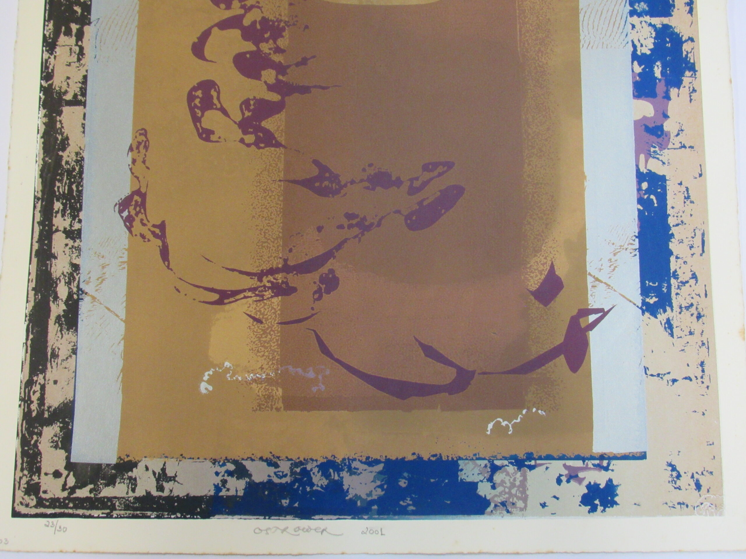 Inscrições a lápis: Na parte central, assinatura da artista e ano de criação da obra: "OSTROWER 2001". No canto inferior esquerdo: Tiragem: "23/30" e, logo abaixo, "2103".