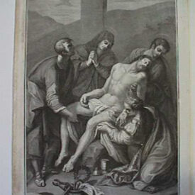 Inscrições existentes na Estampa, sob a representação iconográfica, impressas em letra cursiva maiúscula e minúscula: no canto inferior à esquerda do observador: Luigi Volpini dis.; no canto inferior à direita do observador: Ferd. Gregori inc.; ao centro, o título, em italiano: Gesú Cristo deposto dalla Croce