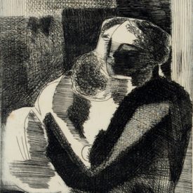 Estampa em preto-e-branco, de estrutura retangular verticalizada, em suporte papel, com representação de mãe e filho. Figura feminina jovem de rosto arredondado e traços geometrizados, em especial o nariz, tendo os cabelos presos e divididos ao meio, olhos e boca cerrados. A representada segura criança nos braços, esta de cabeça baixa e traja blusa de mangas compridas. Fundo do desenho composto por retângulos com riscos verticais e tramas, além de tracejado contendo linhas geometrizadas que geram distintas nuances em tom cinza. Na face frontal inferior, logo abaixo do desenho, inscrições à direita do observador, com nome da artista e data, e, à esquerda, números indicam a tiragem da gravura (vide marcas/inscrições). Peça assinada.