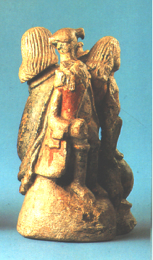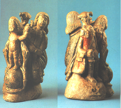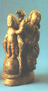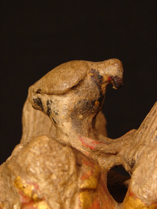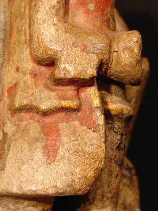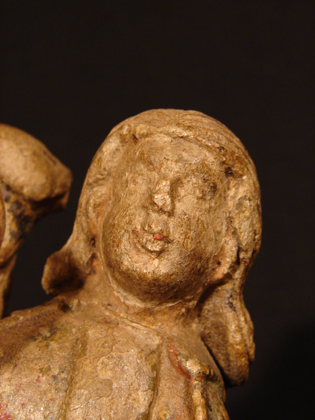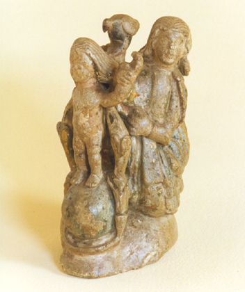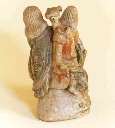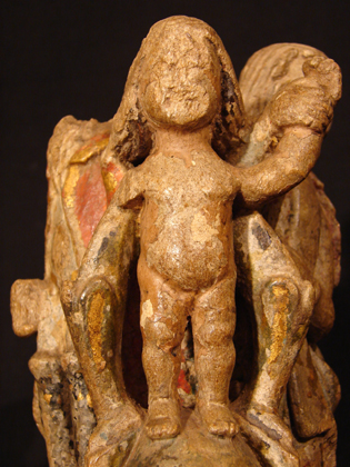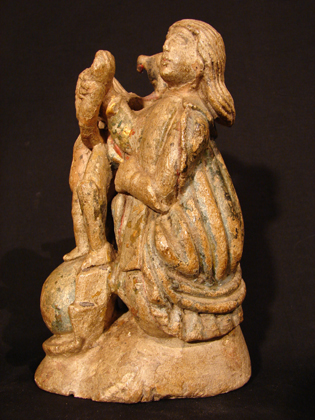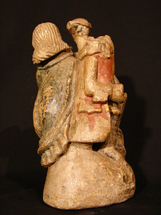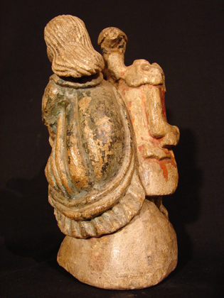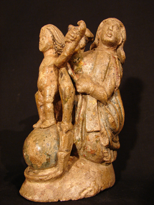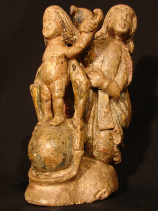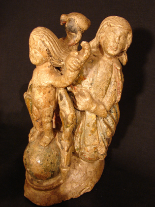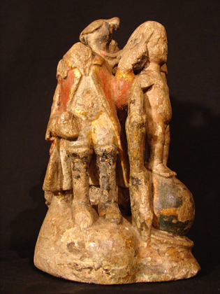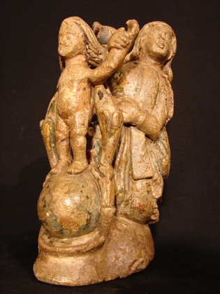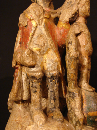 Grupo Escultórico Religioso, em pedra-sabão esculpida, pintada e dourada (purpurinada), representando a Sagrada Família. À frente, figura de criança representando o Menino Jesus, de pé, desnuda, com cabelos longos frisados e olhos esculpidos; braço direito quebrado (faltante) e braço esquerdo flexionado para cima; pés apoiados sobre o globo terrestre, em tom de azul. À direita do menino, figura feminina representando Nossa Senhora, de pé, com o corpo ligeiramente inclinado à sua esquerda, cabelos longos frisados, orelhas aparentes, olhos entalhados e boca fechada; traja túnica longa de mangas compridas e escapulário, sob manto na cor azul, com motivos decorativos florais em vermelho, verde e dourado; braço direito flexionado, com a mão segurando o braço esquerdo do menino; braço esquerdo flexionado, com a mão segurando o manto. Do lado direito, figura masculina, de pé, representando possivelmente São José, sem a cabeça, vestindo traje militar, com casaca aberta, vermelha e dourada, e botas pretas; braço direito flexionado, sem a mão (faltante); braço esquerdo flexionado para cima, sem a mão (faltante); pousada sobre seu ombro esquerdo, uma pomba sem rabo e com os pés apresentando vestígios de tinta vermelha. Embora pouco definido, uma espécie de festão de flores envolve o globo terrestre em seu polo inferior, ladeando-o e alçando-se, ladeando também o corpo do menino. Base de formato irregular.