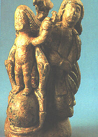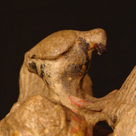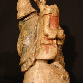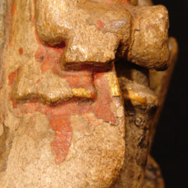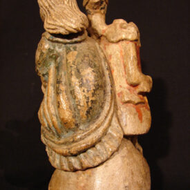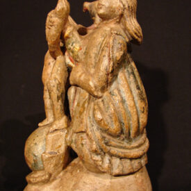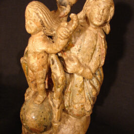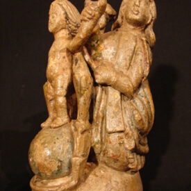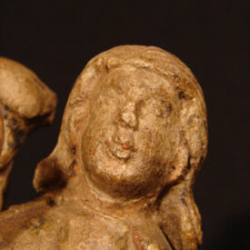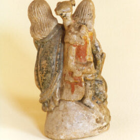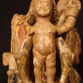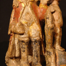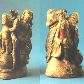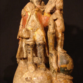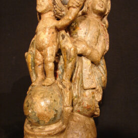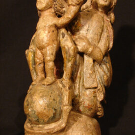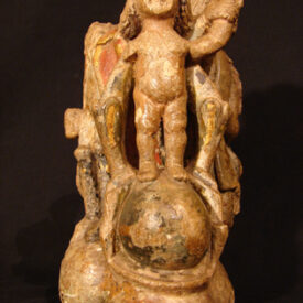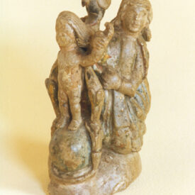 Grupo Escultórico Religioso, em pedra-sabão esculpida, pintada e dourada (purpurinada), representando a Sagrada Família. À frente, figura de criança representando o Menino Jesus, de pé, desnuda, com cabelos longos frisados e olhos esculpidos; braço direito quebrado (faltante) e braço esquerdo flexionado para cima; pés apoiados sobre o globo terrestre, em tom de azul. À direita do menino, figura feminina representando Nossa Senhora, de pé, com o corpo ligeiramente inclinado à sua esquerda, cabelos longos frisados, orelhas aparentes, olhos entalhados e boca fechada; traja túnica longa de mangas compridas e escapulário, sob manto na cor azul, com motivos decorativos florais em vermelho, verde e dourado; braço direito flexionado, com a mão segurando o braço esquerdo do menino; braço esquerdo flexionado, com a mão segurando o manto. Do lado direito, figura masculina, de pé, representando possivelmente São José, sem a cabeça, vestindo traje militar, com casaca aberta, vermelha e dourada, e botas pretas; braço direito flexionado, sem a mão (faltante); braço esquerdo flexionado para cima, sem a mão (faltante); pousada sobre seu ombro esquerdo, uma pomba sem rabo e com os pés apresentando vestígios de tinta vermelha. Embora pouco definido, uma espécie de festão de flores envolve o globo terrestre em seu polo inferior, ladeando-o e alçando-se, ladeando também o corpo do menino. Base de formato irregular.