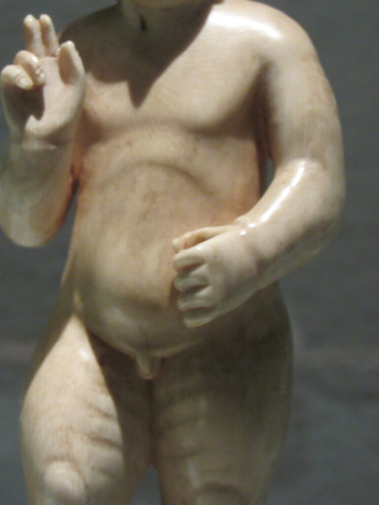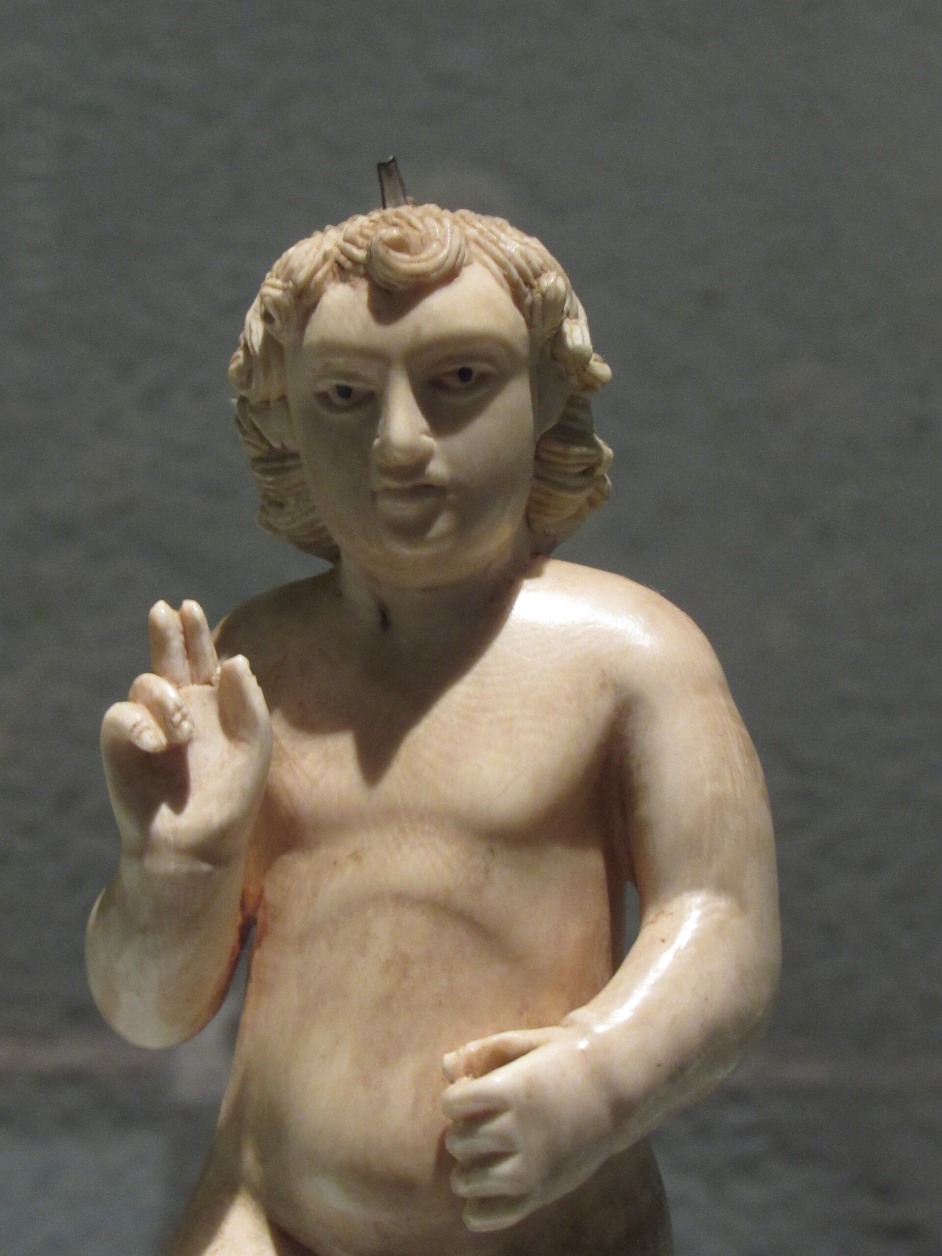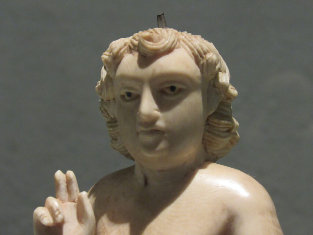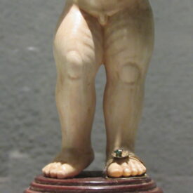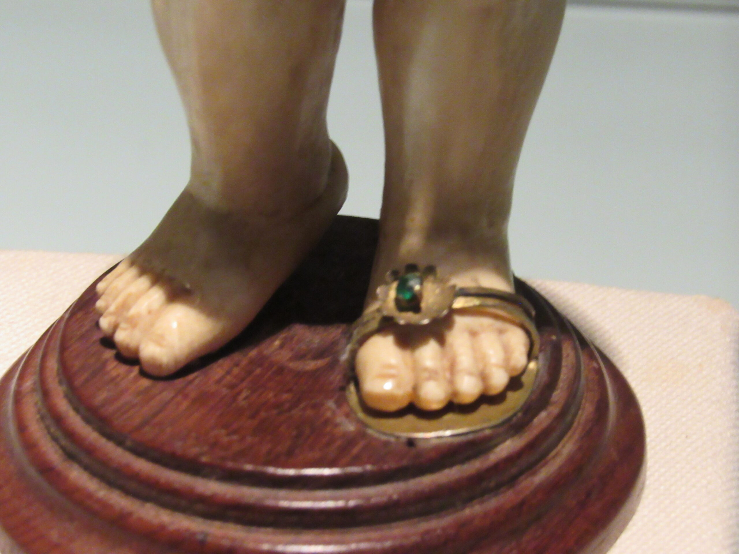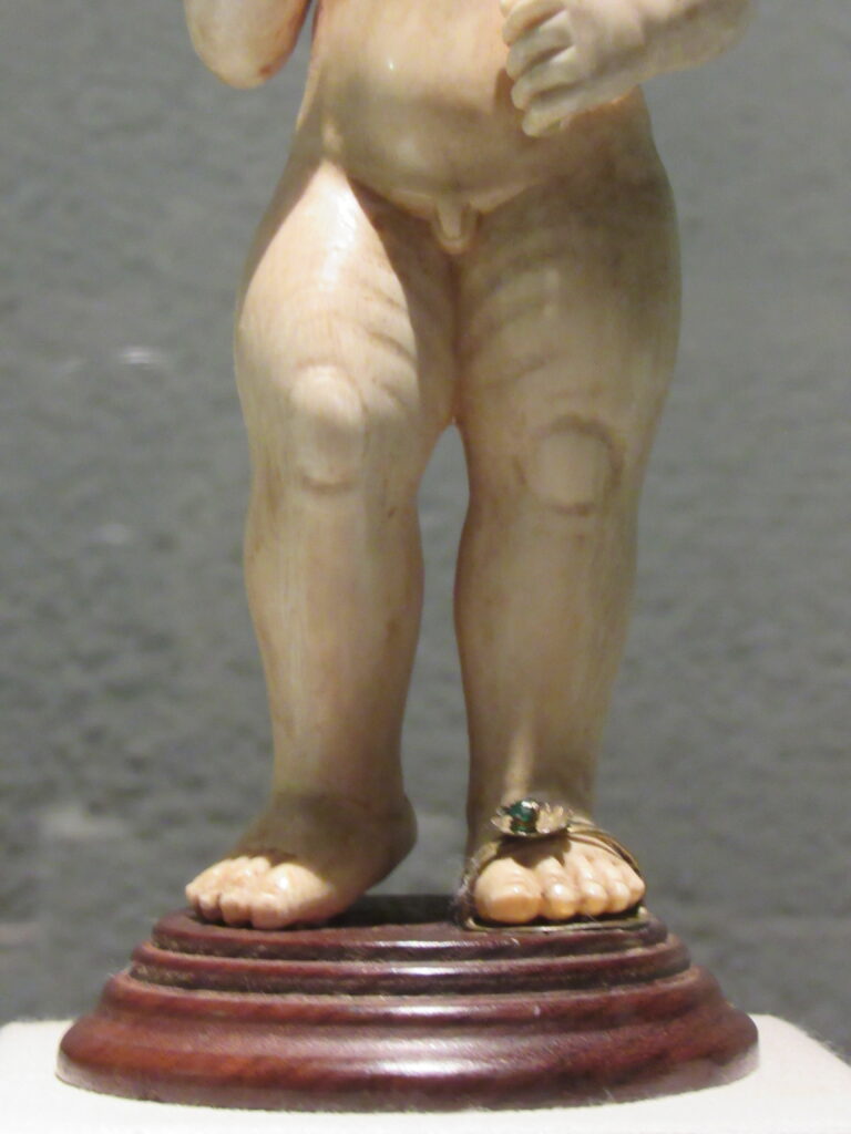 Imagem em marfim esculpido, latão martelado e repuxado, e madeira torneada, representando o Menino Jesus, Salvador do Mundo. Figura de criança, desnuda, de pé, de corpo roliço, com cabelos cacheados curtos, olhos azuis pintados, nariz comprido e boca cerrada. Braço direito flexionado, com a mão elevada, em posição de benção; braço esquerdo flexionado, com a mão posicionada na altura do abdômen; perna direita ligeiramente flexionada; perna esquerda estendida, com o pé calçado com sandália de duas tiras em latão, encimada por rosácea com botão em pedra verde ou vidro. Base circular, em madeira torneada, escalonada.