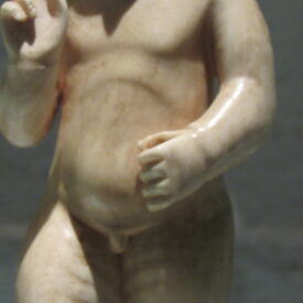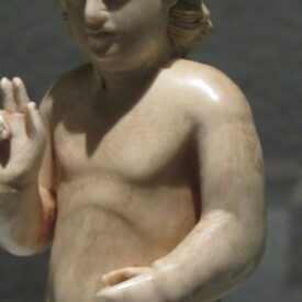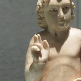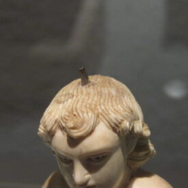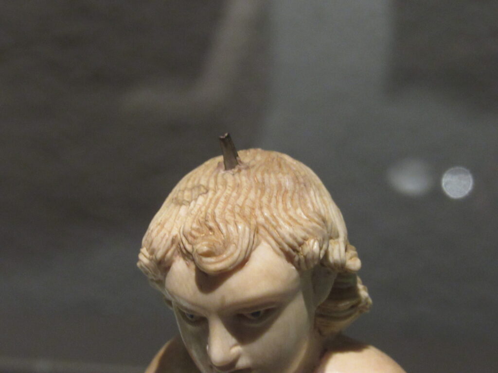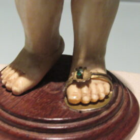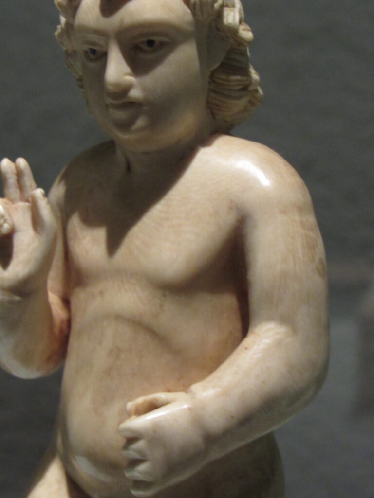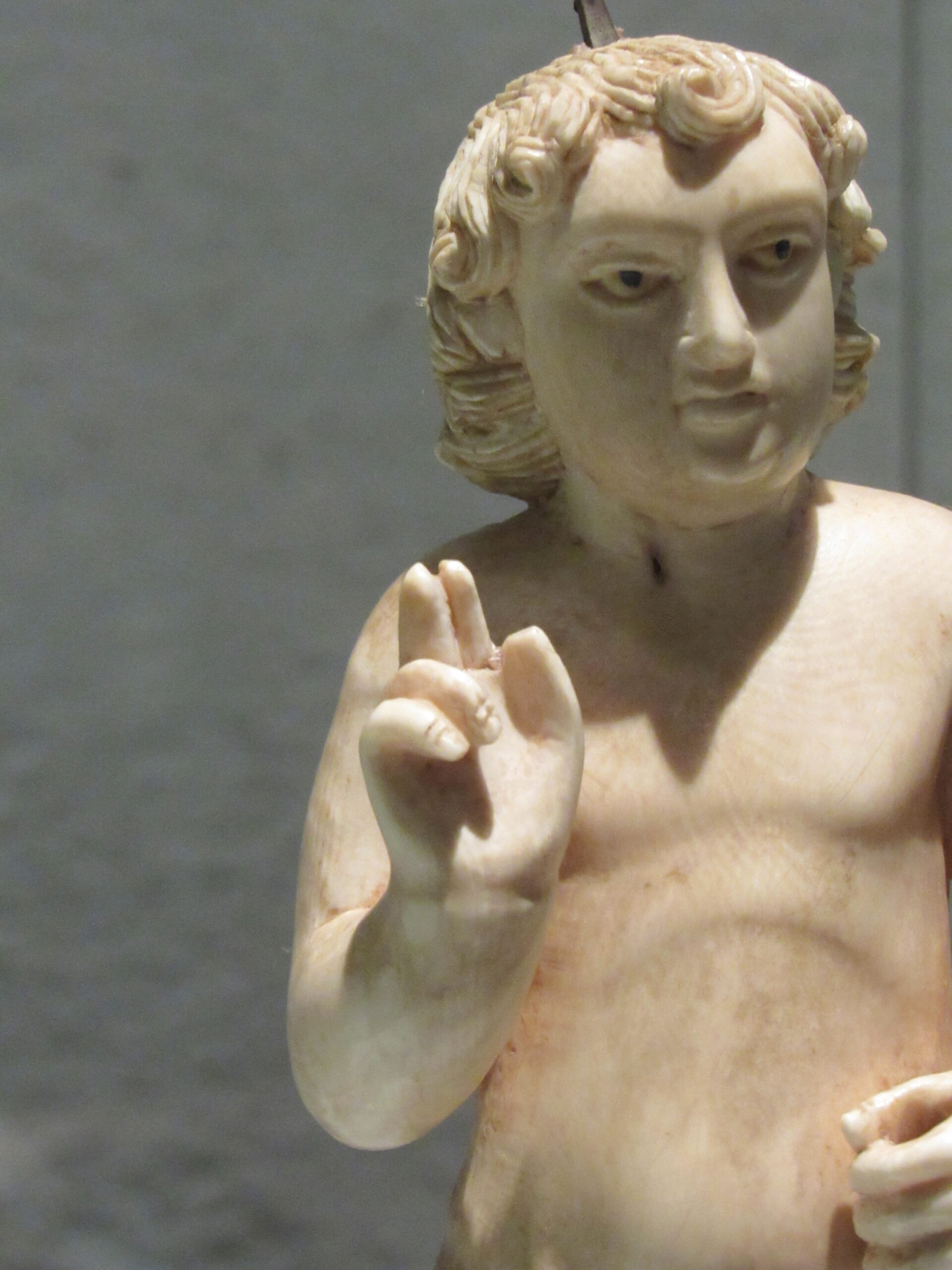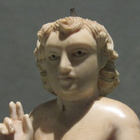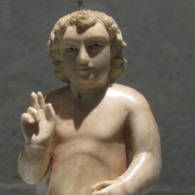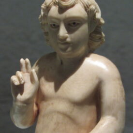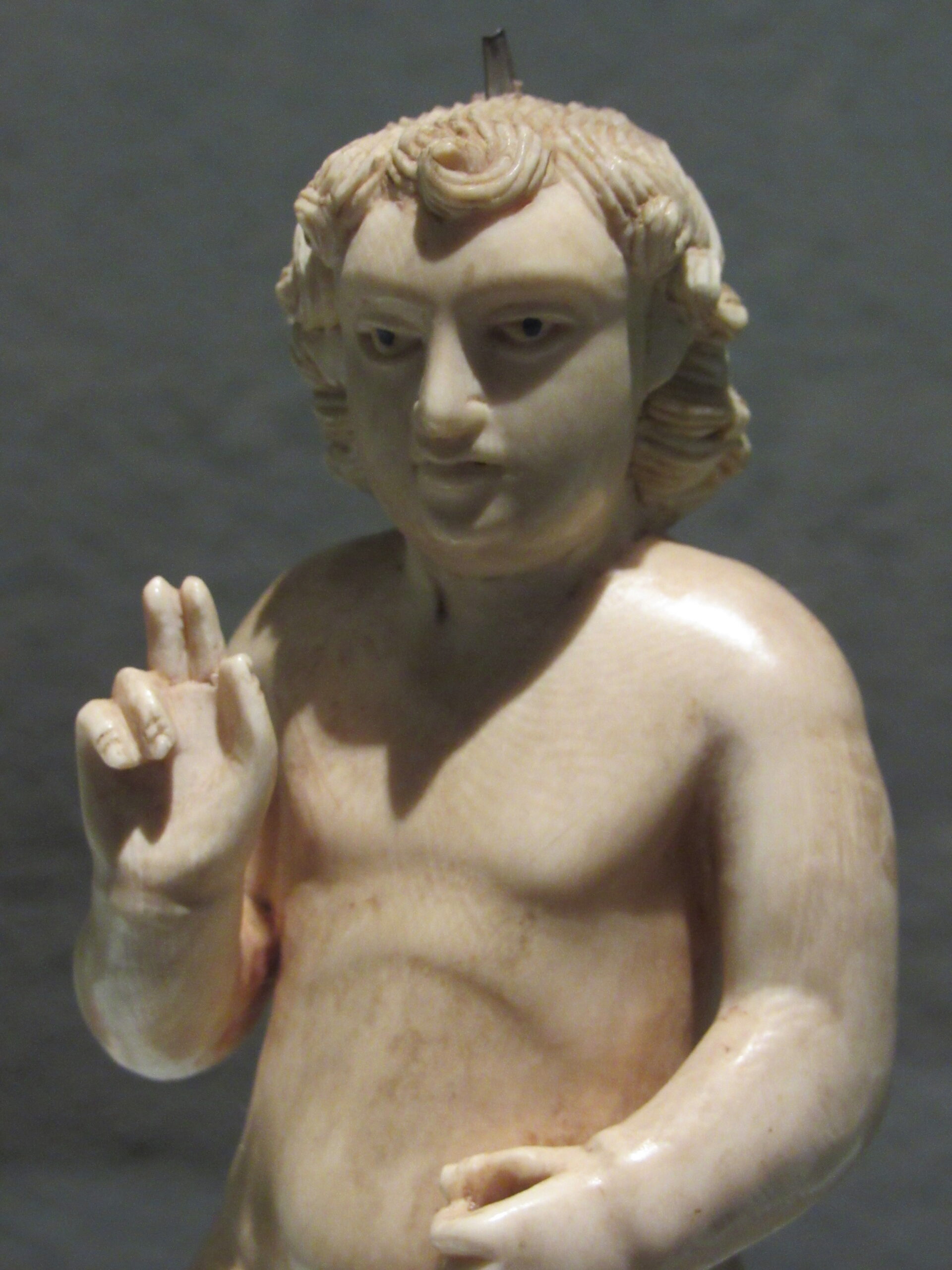 Imagem em marfim esculpido, latão martelado e repuxado, e madeira torneada, representando o Menino Jesus, Salvador do Mundo. Figura de criança, desnuda, de pé, de corpo roliço, com cabelos cacheados curtos, olhos azuis pintados, nariz comprido e boca cerrada. Braço direito flexionado, com a mão elevada, em posição de benção; braço esquerdo flexionado, com a mão posicionada na altura do abdômen; perna direita ligeiramente flexionada; perna esquerda estendida, com o pé calçado com sandália de duas tiras em latão, encimada por rosácea com botão em pedra verde ou vidro. Base circular, em madeira torneada, escalonada.
