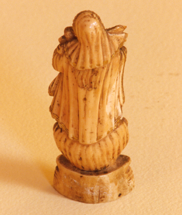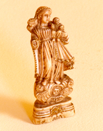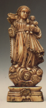 Imagem em marfim esculpido, com vestígios de pintura e douramento, representando Nossa Senhora do Rosário. Figura feminina, de pé, com a cabeça levemente inclinada para a esquerda, cabelos longos lisos, divididos ao meio, sob véu curto, com a borda em dourado, olhos castanhos pintados e boca cerrada. Traja túnica longa, de mangas compridas, sob manto com abertura frontal e barra em dourado, apoiado sobre os ombros. Panejamento movimentado. Braço direito flexionado, faltando a mão direita. Braço esquerdo flexionado, com mão esquerda segurando um menino. Perna direita ligeiramente flexionada. Pés calçados, aparentes. No colo de Nossa Senhora, do lado esquerdo, figura de criança, representando o Menino Jesus, assentado, trajando túnica longa, de mangas compridas, cabelos curtos, olhos esculpidos e boca cerrada; braço direito flexionado para cima, com dedos em posição de benção; braço esquerdo flexionado, com mão segurando globo terrestre; pernas flexionadas; pés calçados, aparentes. Sob os pés de Nossa Senhora, nuvem estilizada com três querubins, de cabelos curtos, olhos esculpidos, bocas cerradas e asas. Base irregular escalonada, com rosácea na parte frontal, em tom dourado. Ausência da mão direita da Nossa Senhora.