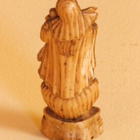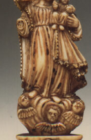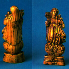 Imagem em marfim esculpido, com vestígios de pintura e douramento, representando Nossa Senhora do Rosário. Figura feminina, de pé, com a cabeça levemente inclinada para a esquerda, cabelos longos lisos, divididos ao meio, sob véu curto, com a borda em dourado, olhos castanhos pintados e boca cerrada. Traja túnica longa, de mangas compridas, sob manto com abertura frontal e barra em dourado, apoiado sobre os ombros. Panejamento movimentado. Braço direito flexionado, faltando a mão direita. Braço esquerdo flexionado, com mão esquerda segurando um menino. Perna direita ligeiramente flexionada. Pés calçados, aparentes. No colo de Nossa Senhora, do lado esquerdo, figura de criança, representando o Menino Jesus, assentado, trajando túnica longa, de mangas compridas, cabelos curtos, olhos esculpidos e boca cerrada; braço direito flexionado para cima, com dedos em posição de benção; braço esquerdo flexionado, com mão segurando globo terrestre; pernas flexionadas; pés calçados, aparentes. Sob os pés de Nossa Senhora, nuvem estilizada com três querubins, de cabelos curtos, olhos esculpidos, bocas cerradas e asas. Base irregular escalonada, com rosácea na parte frontal, em tom dourado. Ausência da mão direita da Nossa Senhora.