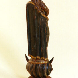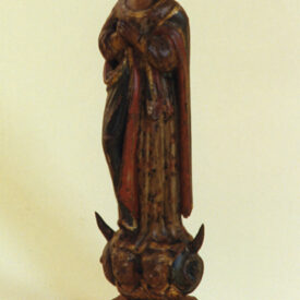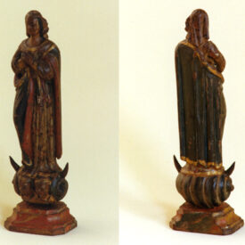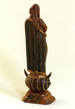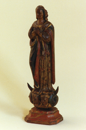 Imagem em madeira (cedro) esculpida, pintada e dourada (purpurinado), representando Nossa Senhora da Conceição. Figura feminina, de pé, com cabelos pretos semilongos envoltos por véu curto, olhos pretos pintados e boca cerrada. Traja túnica longa, de mangas compridas, com gola arredondada, em tom bege, com motivos decorativos florais, barra em dourado, sob manto azul com parte interna em vermelho, apoiado sobre o ombro esquerdo. Panejamento pouco movimentado. Braços flexionados; mãos em posição de oração; perna direita ligeiramente flexionada. Sob os pés de Nossa Senhora, nuvem estilizada com dois querubins, com os cabelos louros curtos, olhos pretos pintados e bocas fechadas; possuem asas douradas. Ladeando a nuvem, aparecem os cornos da lua. Base quadrangular, com os ângulos chanfrados, escalonada, em tom vermelho e amarelo (marmorizados).