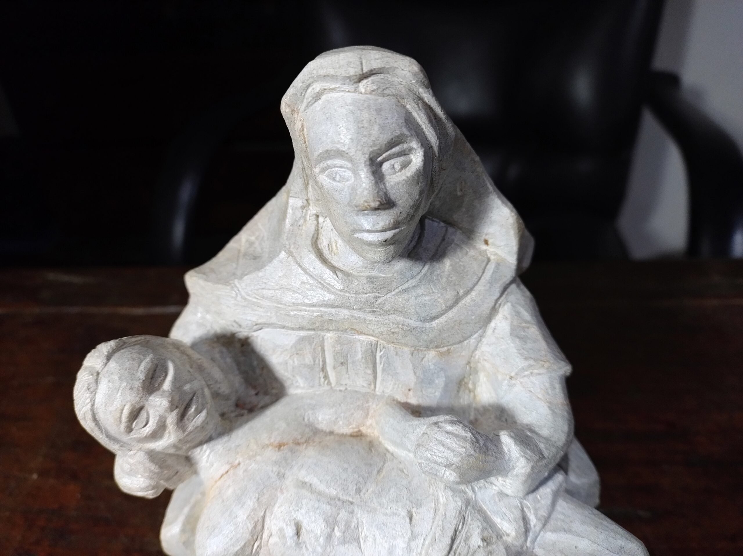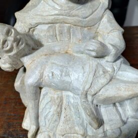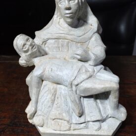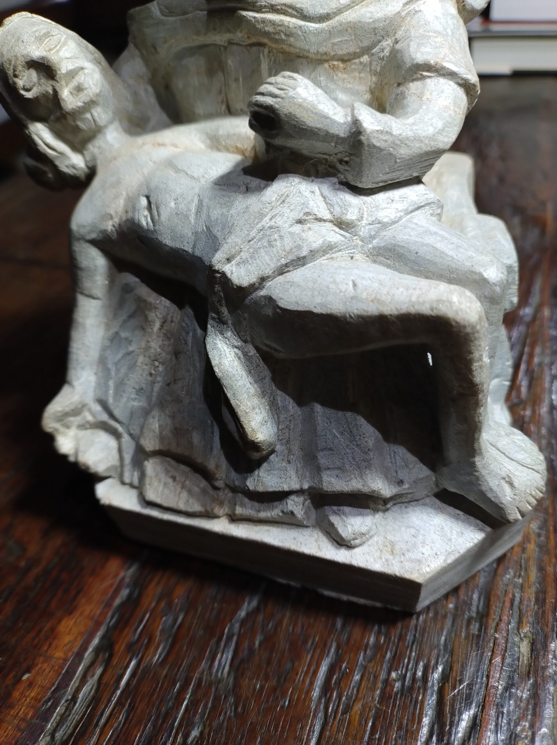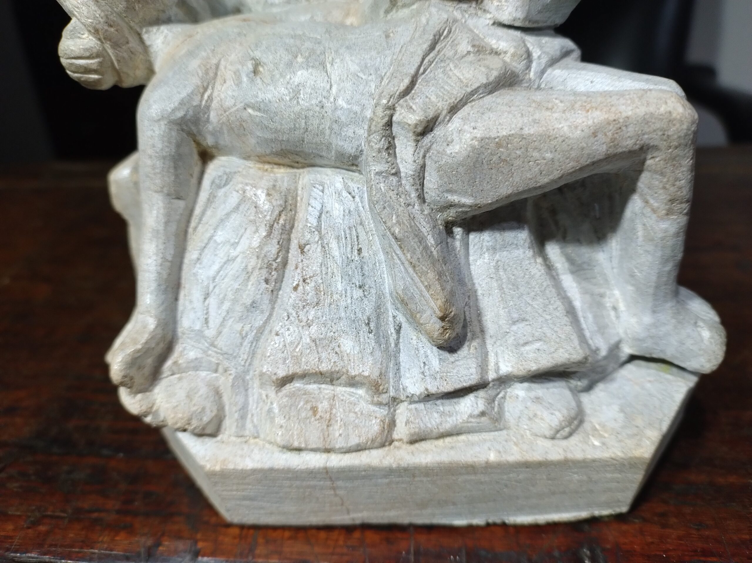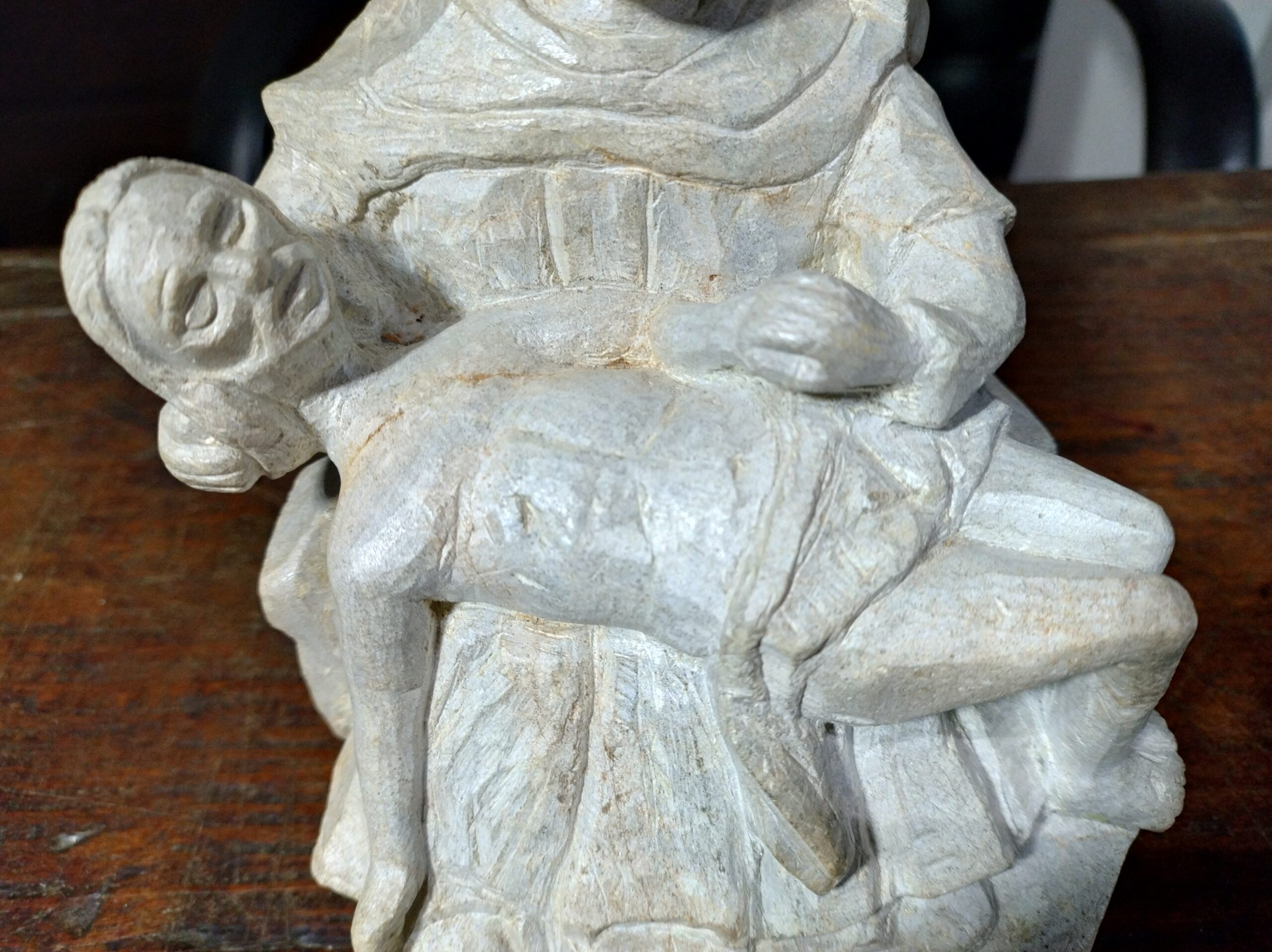 Imagem esculpida em pedra-sabão, sem policromia, representando Nossa Senhora das Dores. Figura feminina, assentada sobre pequeno banco composto de tijolos, com a cabeça levemente inclinada à sua direita e envolta por véu curto. Apresenta testa larga, rosto ovalado, com olhos e sobrancelhas delineados, nariz comprido e fino, e boca de lábios espessos semiaberta. Traja túnica longa, de mangas compridas, com panejamento de pregas bem demarcadas, simulando movimentação e volumetria. Com seu braço direito segura a cabeça de Cristo e tem sua mão esquerda sobre a mão dele. Pernas juntas com pés calçados aparentes. Sobre seu colo, figura masculina desfalecida, representando Cristo, com corpo desnudo trajando apenas o perizônio. Tem seu braço direito voltado para baixo sobre a túnica de Nossa Senhora, e pernas flexionadas paralelamente para baixo com os pés sobre a base. Parte posterior do banco esculpida em três níveis com representação de tijolos na parte central. Base sextavada. Peça assinada pelo artista no fundo.