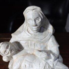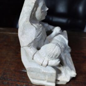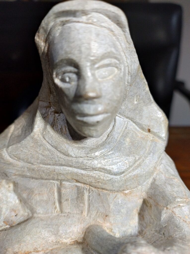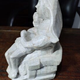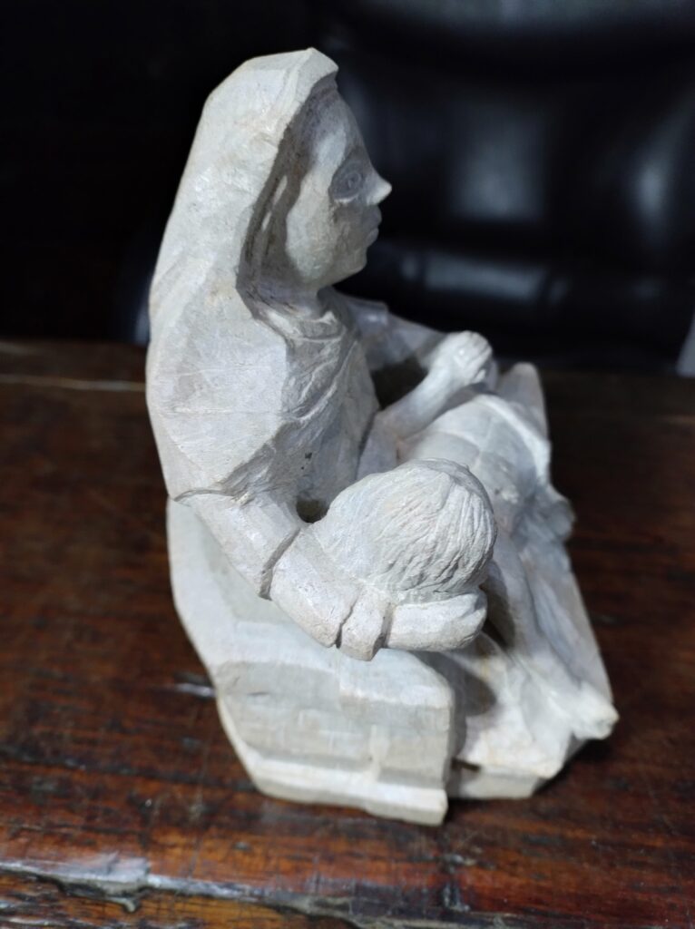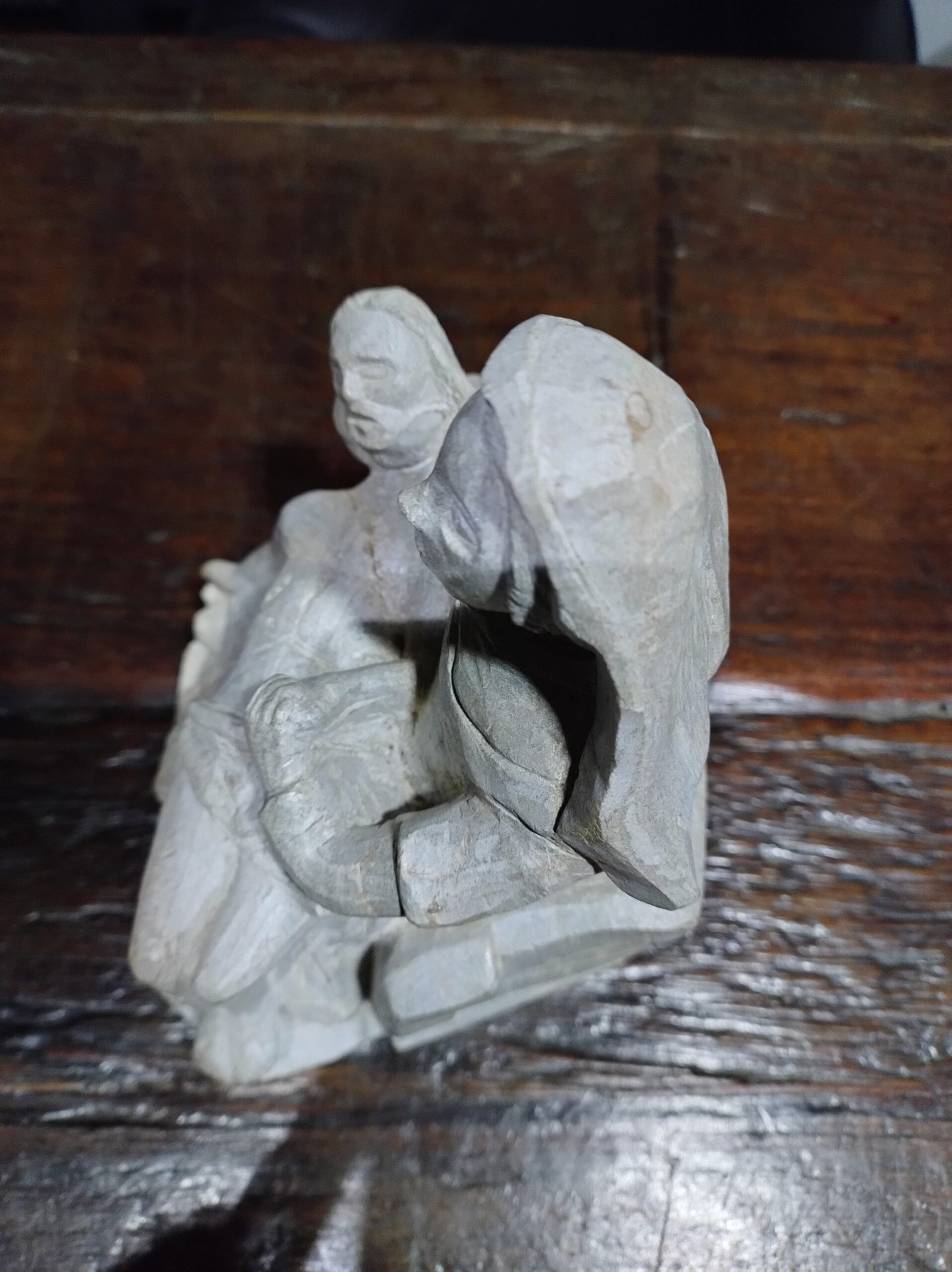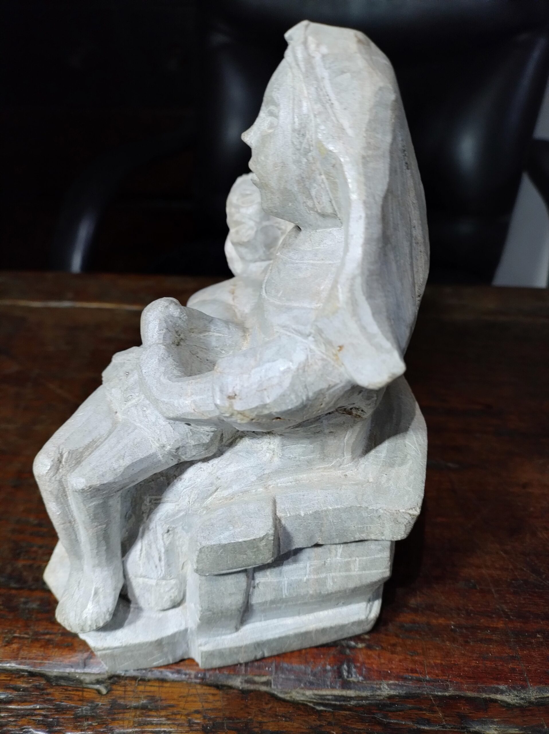 Imagem esculpida em pedra-sabão, sem policromia, representando Nossa Senhora das Dores. Figura feminina, assentada sobre pequeno banco composto de tijolos, com a cabeça levemente inclinada à sua direita e envolta por véu curto. Apresenta testa larga, rosto ovalado, com olhos e sobrancelhas delineados, nariz comprido e fino, e boca de lábios espessos semiaberta. Traja túnica longa, de mangas compridas, com panejamento de pregas bem demarcadas, simulando movimentação e volumetria. Com seu braço direito segura a cabeça de Cristo e tem sua mão esquerda sobre a mão dele. Pernas juntas com pés calçados aparentes. Sobre seu colo, figura masculina desfalecida, representando Cristo, com corpo desnudo trajando apenas o perizônio. Tem seu braço direito voltado para baixo sobre a túnica de Nossa Senhora, e pernas flexionadas paralelamente para baixo com os pés sobre a base. Parte posterior do banco esculpida em três níveis com representação de tijolos na parte central. Base sextavada. Peça assinada pelo artista no fundo.