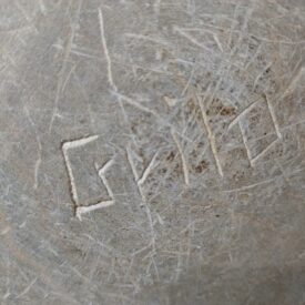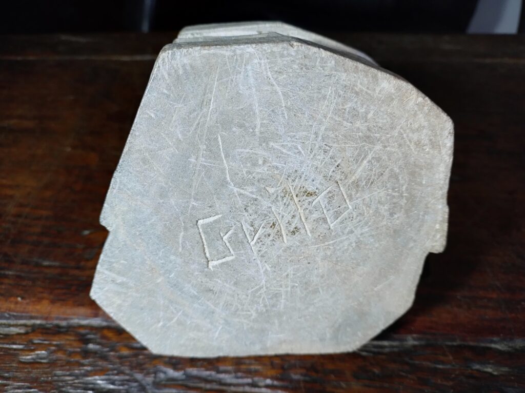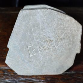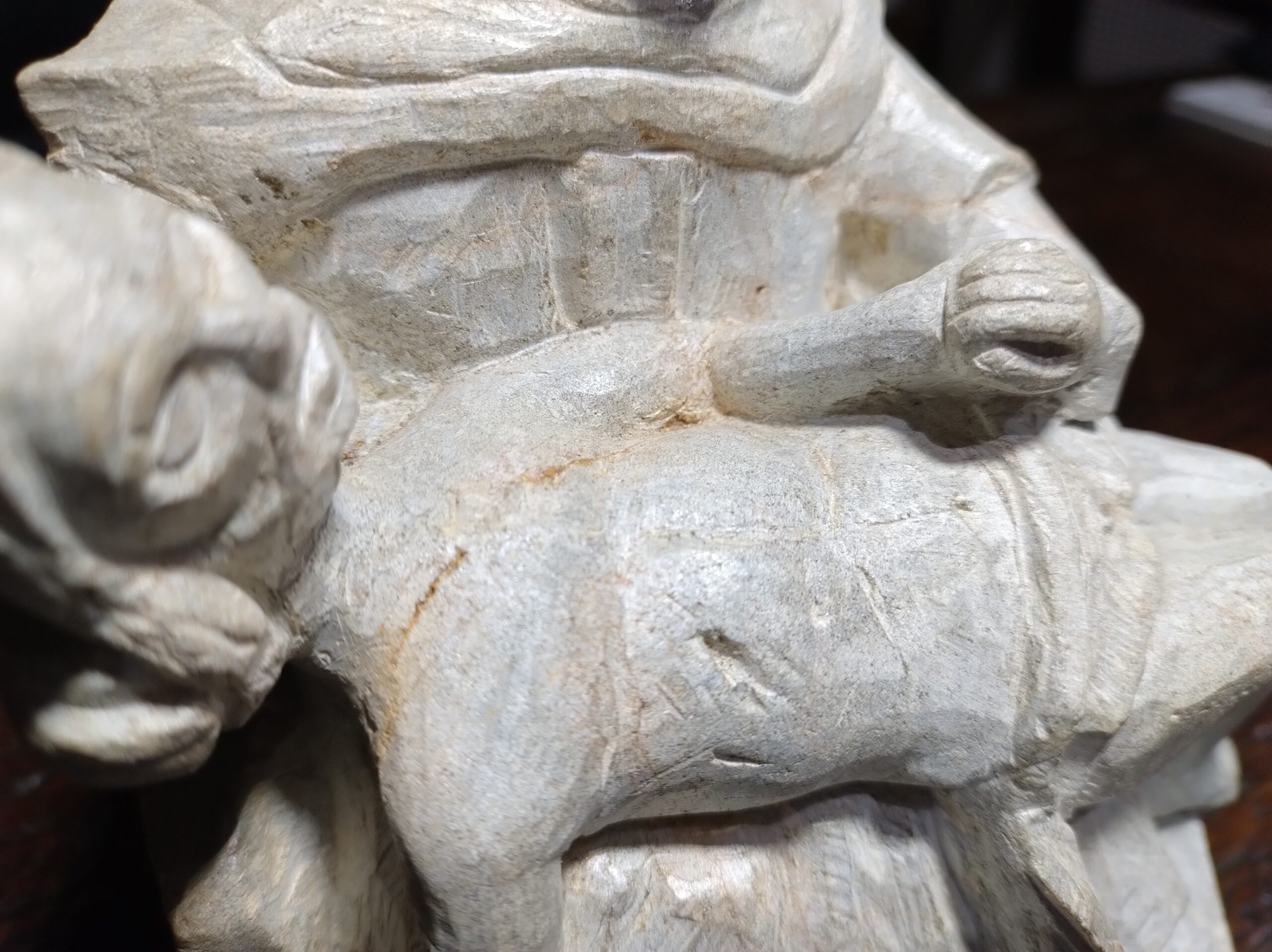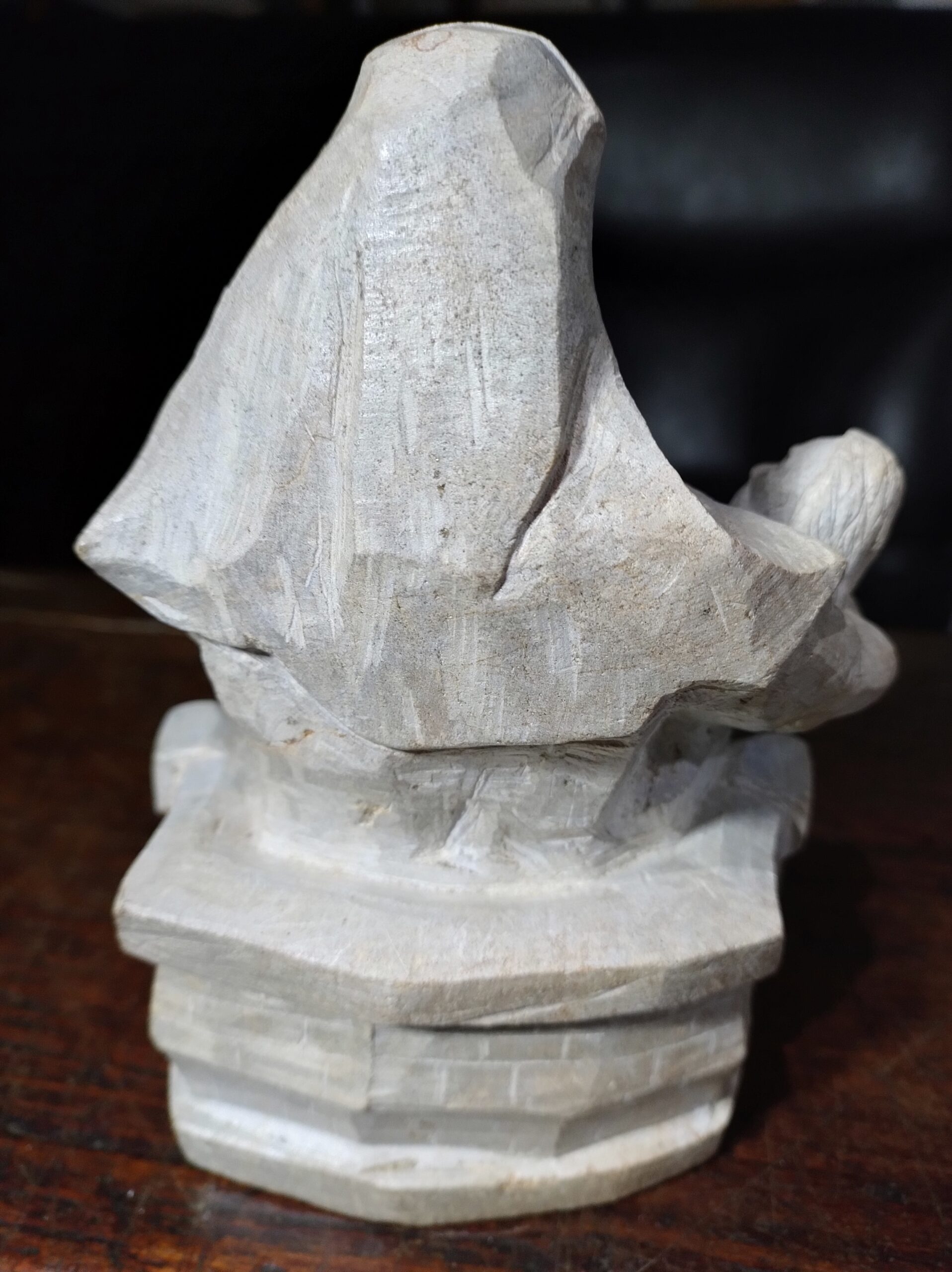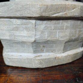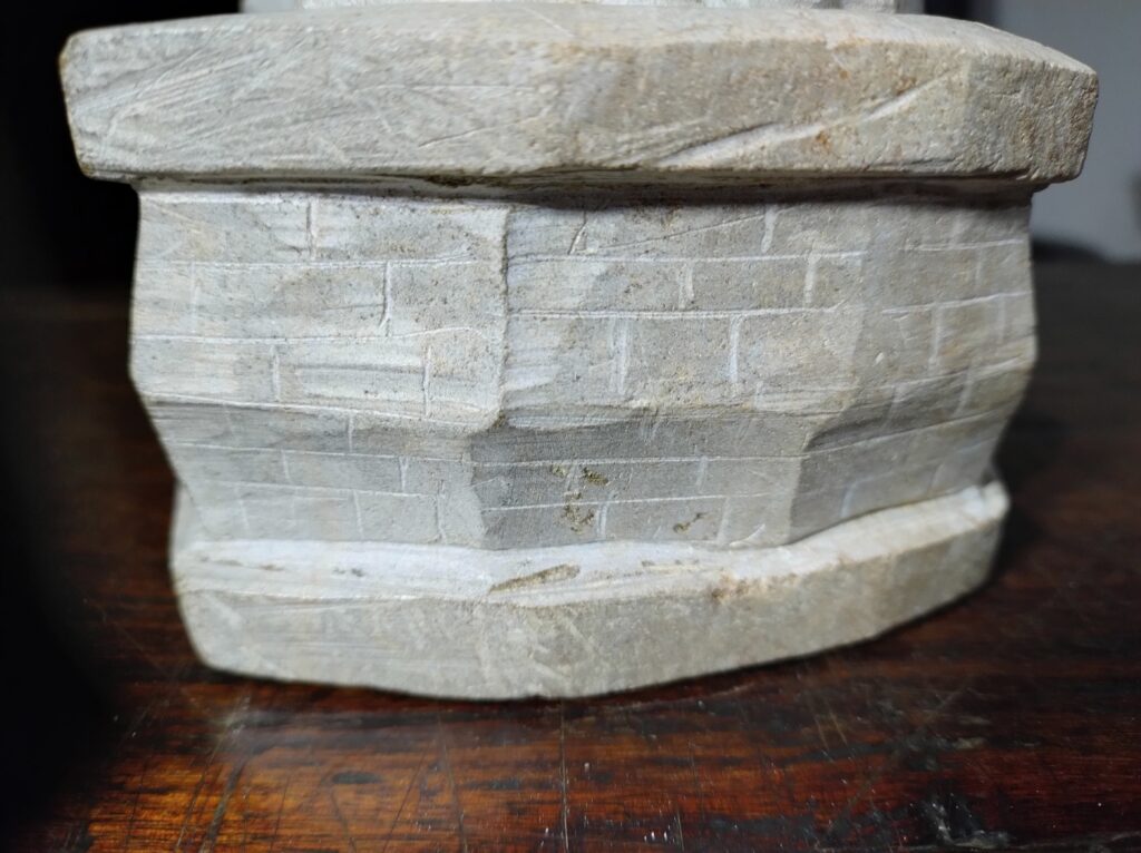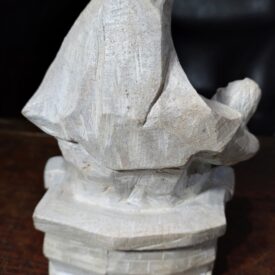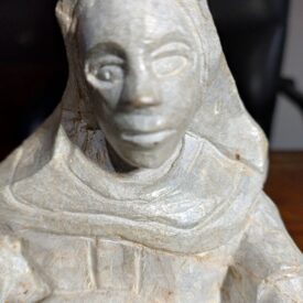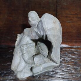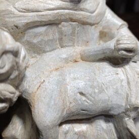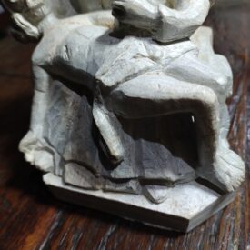 Imagem esculpida em pedra-sabão, sem policromia, representando Nossa Senhora das Dores. Figura feminina, assentada sobre pequeno banco composto de tijolos, com a cabeça levemente inclinada à sua direita e envolta por véu curto. Apresenta testa larga, rosto ovalado, com olhos e sobrancelhas delineados, nariz comprido e fino, e boca de lábios espessos semiaberta. Traja túnica longa, de mangas compridas, com panejamento de pregas bem demarcadas, simulando movimentação e volumetria. Com seu braço direito segura a cabeça de Cristo e tem sua mão esquerda sobre a mão dele. Pernas juntas com pés calçados aparentes. Sobre seu colo, figura masculina desfalecida, representando Cristo, com corpo desnudo trajando apenas o perizônio. Tem seu braço direito voltado para baixo sobre a túnica de Nossa Senhora, e pernas flexionadas paralelamente para baixo com os pés sobre a base. Parte posterior do banco esculpida em três níveis com representação de tijolos na parte central. Base sextavada. Peça assinada pelo artista no fundo.