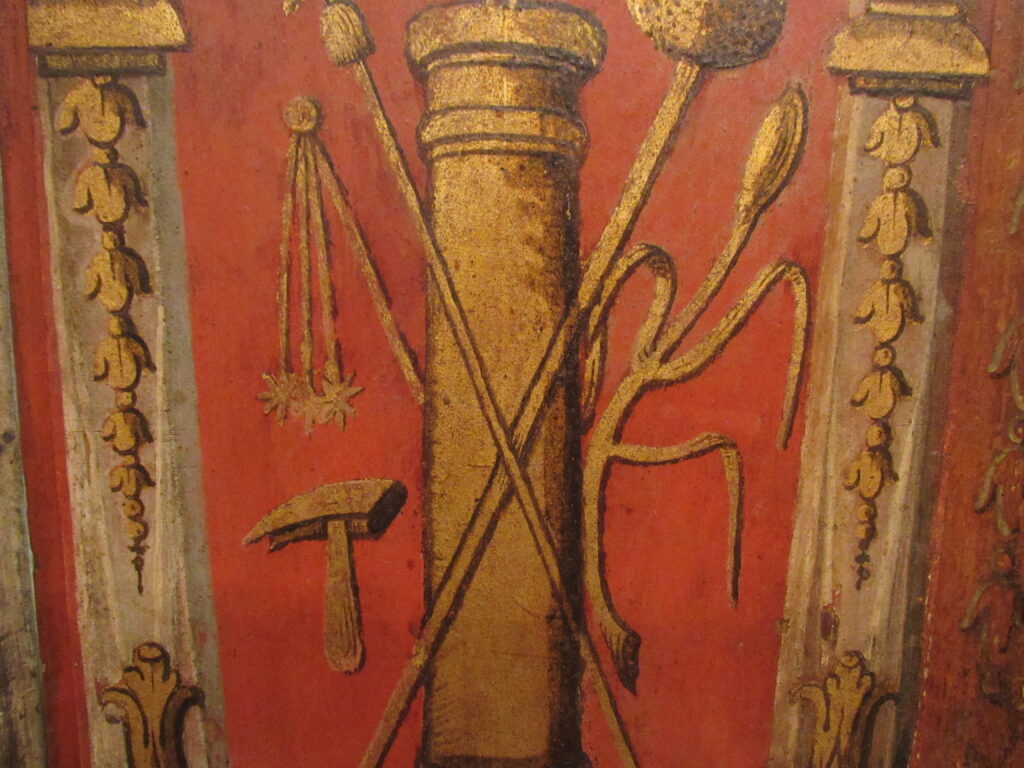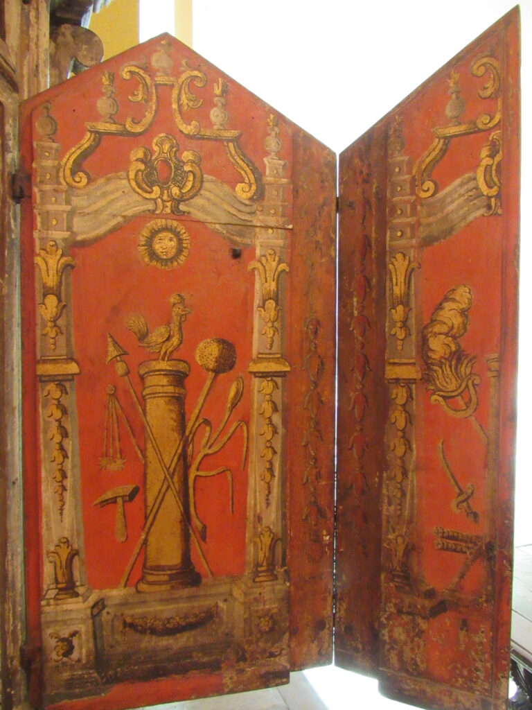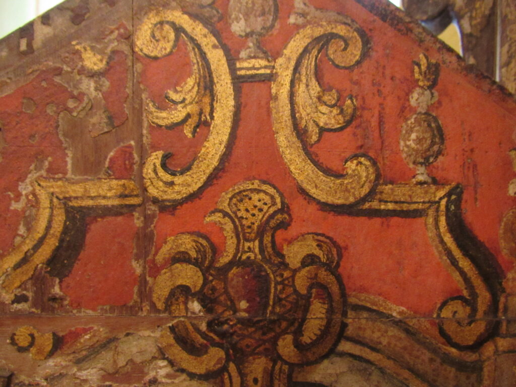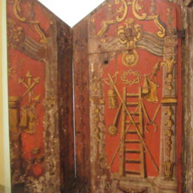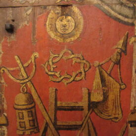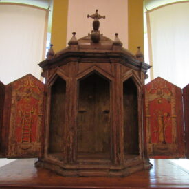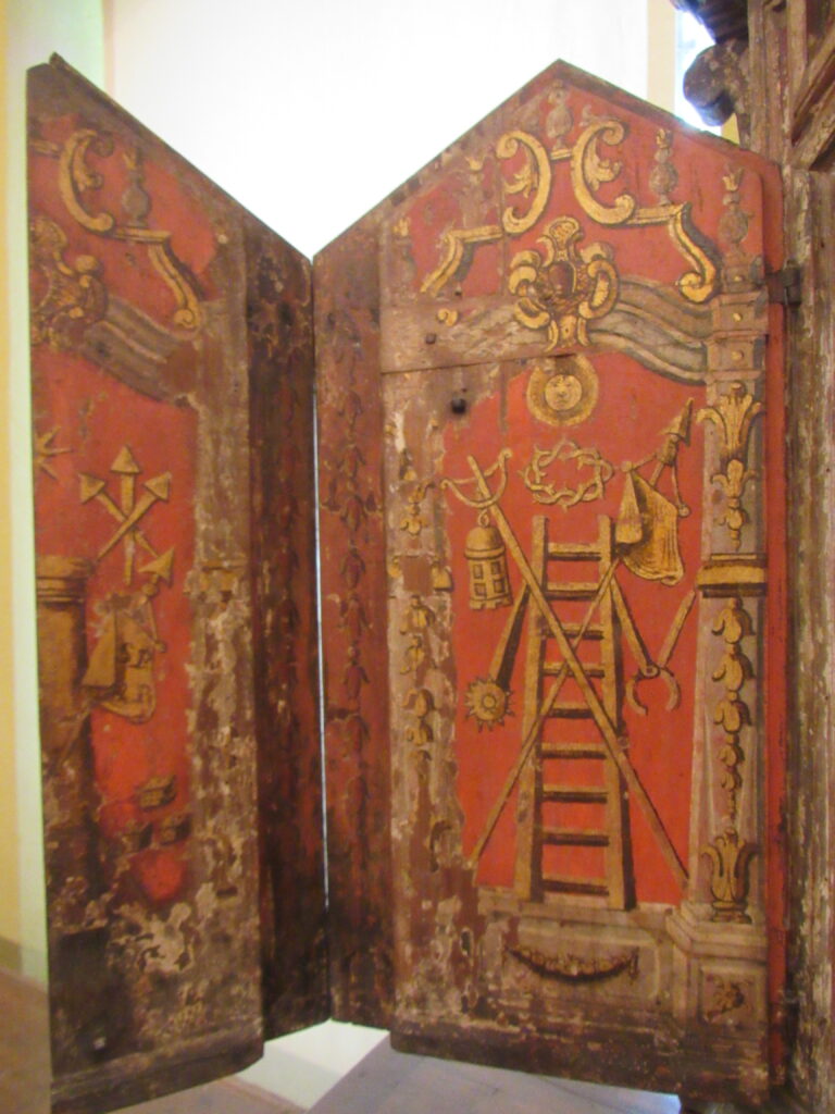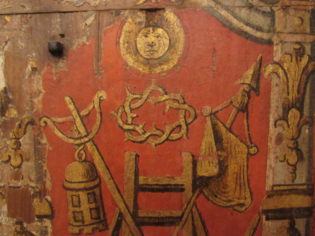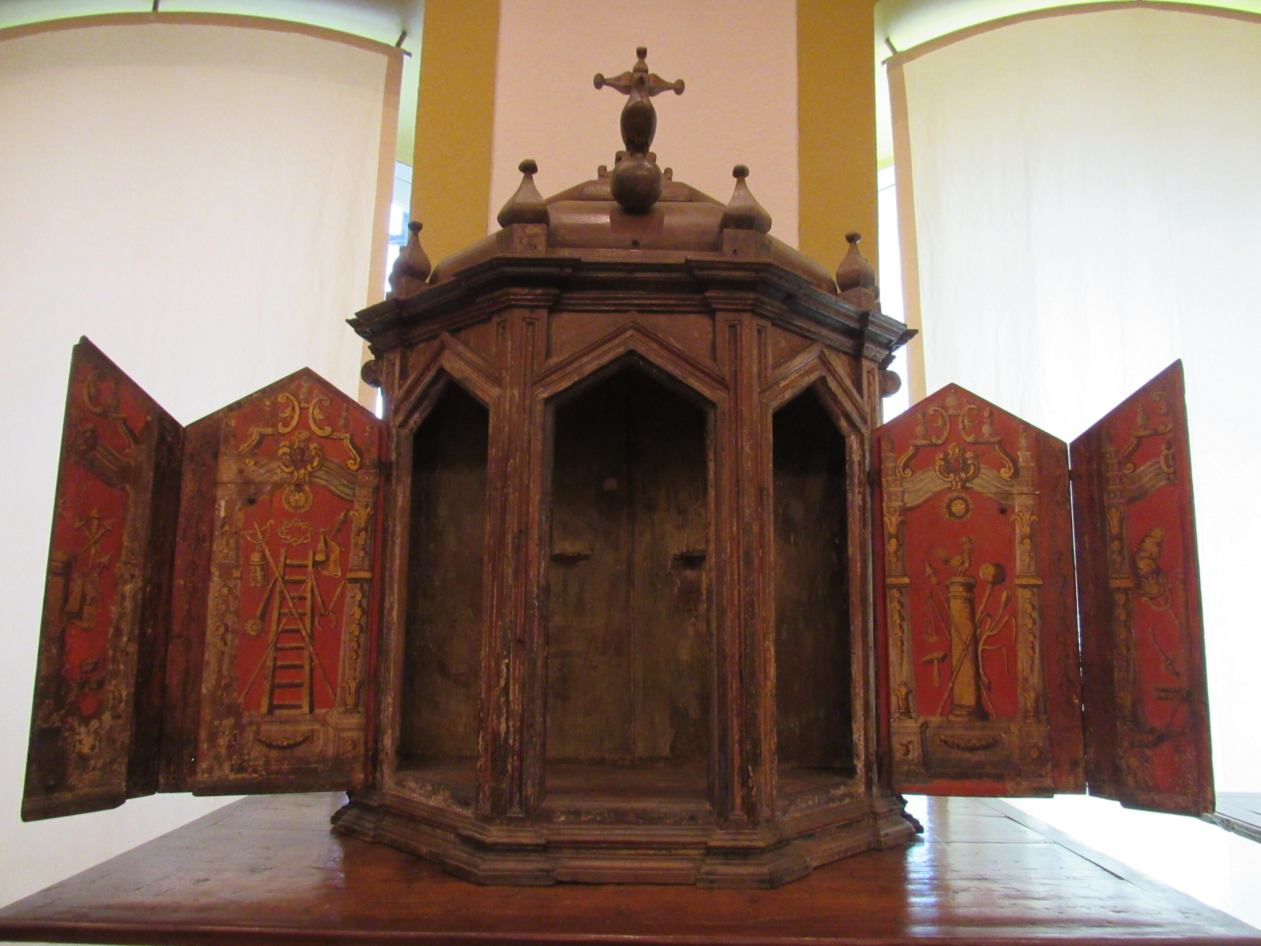 Oratório, confeccionado em madeira (pinho-de-riga) talhada e esculpida, pintada e dourada. Oratório constituído por caixa aberta na frente e nas laterais, com estrutura externa perfilada e entalhada, base escalonada, com vestígios de pintura externa (paisagens com motivos orientais - pagodes, salgueiros e clarões - sobre almofadas, contornadas por guirlandas). Porta composta por duas folhas e duas meias-folhas com os bordos superiores angulosos, almofadadas e emolduradas, unidas aos pares e presas ao fundo da caixa e umas às outras por dobradiças de metal. Tramela na face externa das portas. Cúpula com arremate superior e em forma de cruz com braços afunilados com terminações de lóbulos e ave pousada sobre globo; cimalha com coruchéus. Abertura dos nichos em arcos angulares. Costas lisas, sem acabamento e sem pintura. O oratório tem o fundo liso, sem acabamento e sem pintura. Dentro desse espaço, duas bases para imagens. Face interna das portas pintadas de vermelho, preto e branco, e douradas, com pintura representando instrumentos da Paixão de Cristo moldurados por elementos arquitetônicos e motivos fitomórficos. Descrição das imagens pintadas na face interna das portas: na meia folha à esquerda, elementos arquitetônicos (coluna, parte de arco e de embasamento), elementos decorativos (medalhão com rocalhas e volutas), parte de coluna, três cravos, lança com estandarte com inscrição SPQR e três dados. Na folha à esquerda, elementos arquitetônicos (colunas, arco e embasamento), elementos decorativos (medalhão com rocalhas, volutas e sol), escada, haste com lanterna na extremidade, lança com tecido (toalha de Verônica com o rosto de Cristo?), coroa de espinhos, torquês e bastão (?). Na folha à direita, elementos arquitetônicos (colunas, arco e embasamento), elementos decorativos (medalhão com rocalhas, volutas, festão, motivos fitomórficos e sol), coluna com galo no topo, lança, haste com esponja na extremidade, feixe de cana, açoite e martelo. Na meia folha à direita, elementos arquitetônicos (coluna, parte de arco e de embasamento), elementos decorativos (parte de medalhão com rocalhas, volutas e motivos fitomórficos), parte de coluna, espada e parte de haste com chama na extremidade.