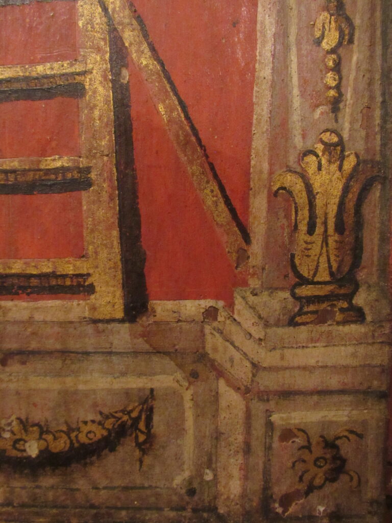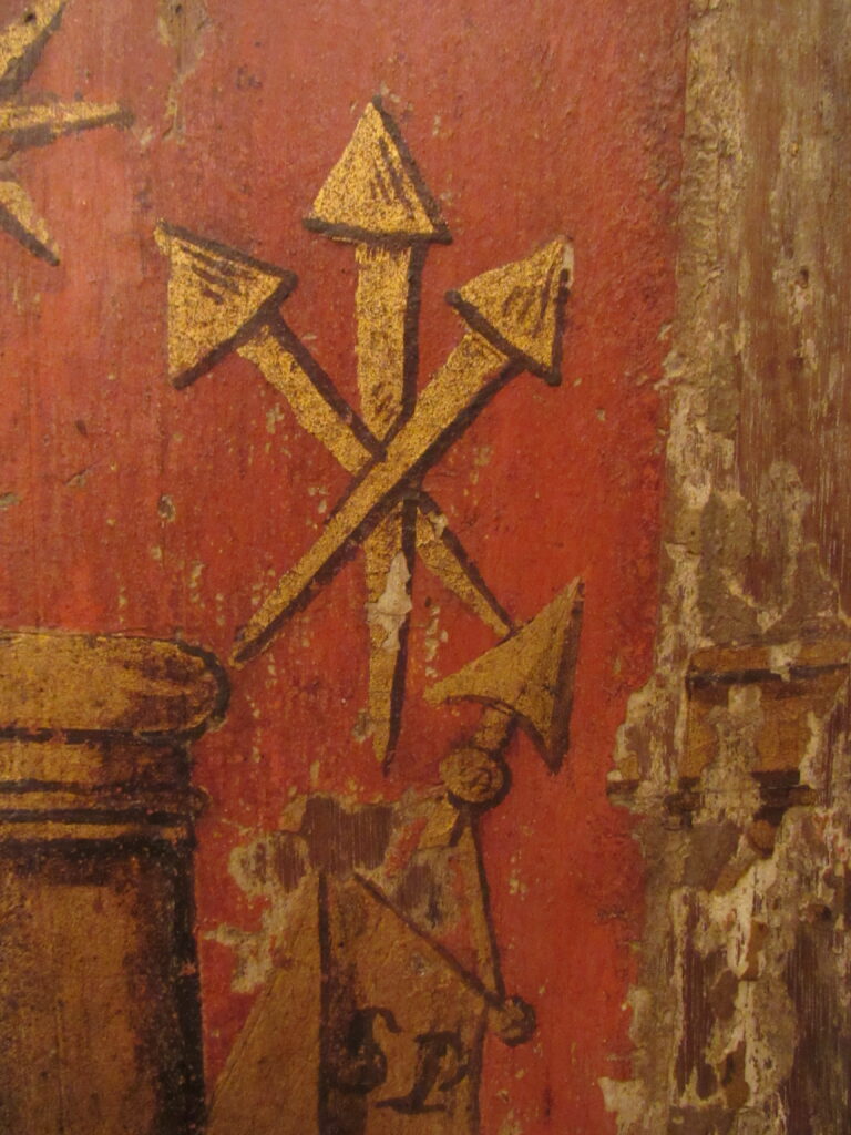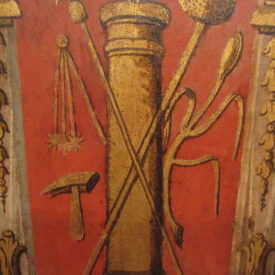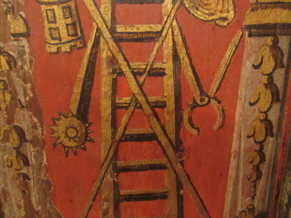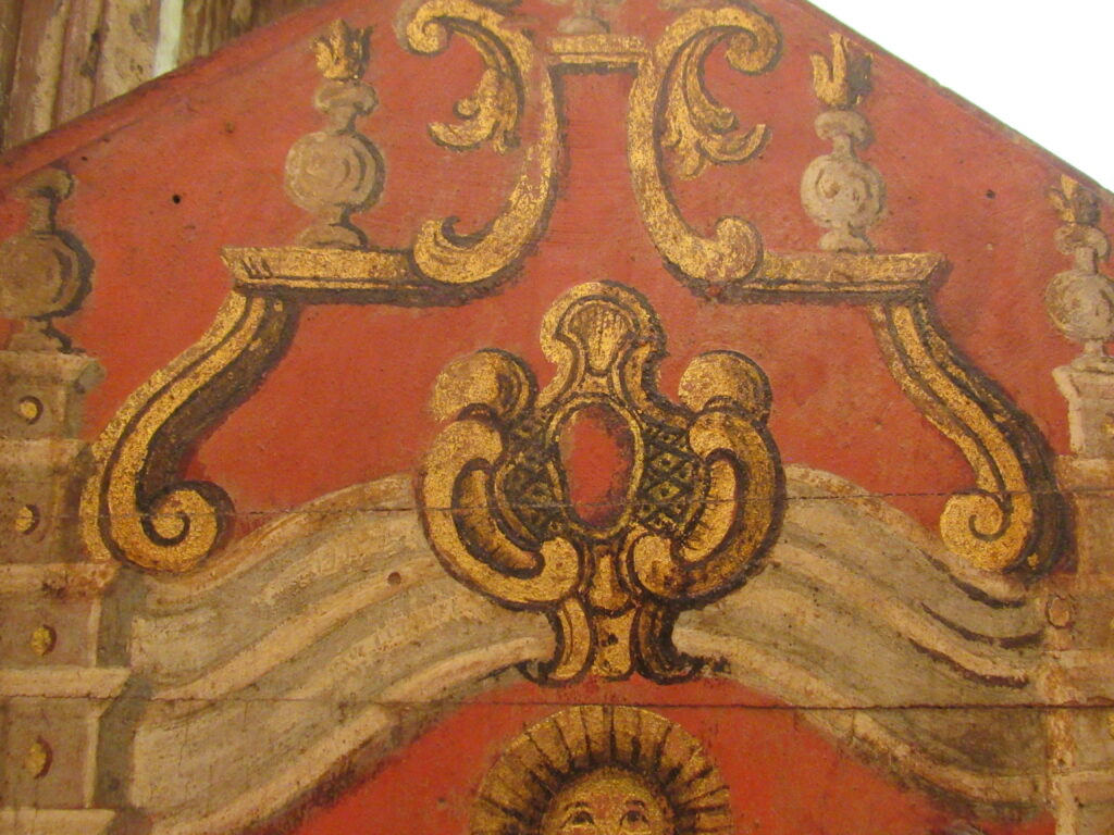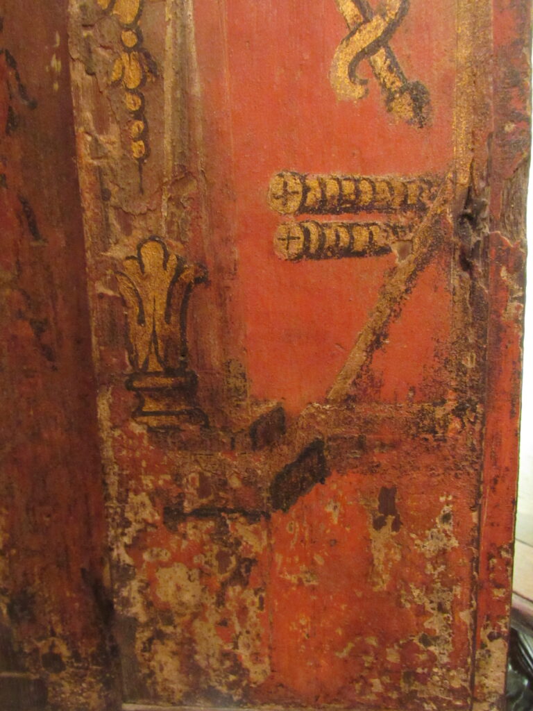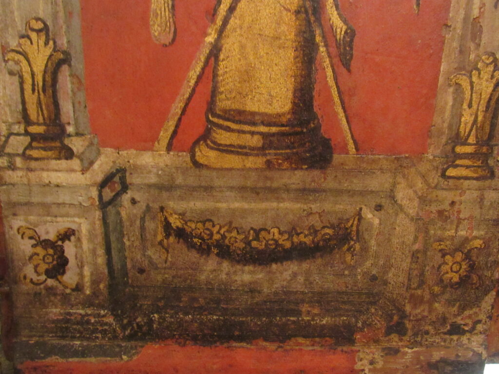 Oratório, confeccionado em madeira (pinho-de-riga) talhada e esculpida, pintada e dourada. Oratório constituído por caixa aberta na frente e nas laterais, com estrutura externa perfilada e entalhada, base escalonada, com vestígios de pintura externa (paisagens com motivos orientais - pagodes, salgueiros e clarões - sobre almofadas, contornadas por guirlandas). Porta composta por duas folhas e duas meias-folhas com os bordos superiores angulosos, almofadadas e emolduradas, unidas aos pares e presas ao fundo da caixa e umas às outras por dobradiças de metal. Tramela na face externa das portas. Cúpula com arremate superior e em forma de cruz com braços afunilados com terminações de lóbulos e ave pousada sobre globo; cimalha com coruchéus. Abertura dos nichos em arcos angulares. Costas lisas, sem acabamento e sem pintura. O oratório tem o fundo liso, sem acabamento e sem pintura. Dentro desse espaço, duas bases para imagens. Face interna das portas pintadas de vermelho, preto e branco, e douradas, com pintura representando instrumentos da Paixão de Cristo moldurados por elementos arquitetônicos e motivos fitomórficos. Descrição das imagens pintadas na face interna das portas: na meia folha à esquerda, elementos arquitetônicos (coluna, parte de arco e de embasamento), elementos decorativos (medalhão com rocalhas e volutas), parte de coluna, três cravos, lança com estandarte com inscrição SPQR e três dados. Na folha à esquerda, elementos arquitetônicos (colunas, arco e embasamento), elementos decorativos (medalhão com rocalhas, volutas e sol), escada, haste com lanterna na extremidade, lança com tecido (toalha de Verônica com o rosto de Cristo?), coroa de espinhos, torquês e bastão (?). Na folha à direita, elementos arquitetônicos (colunas, arco e embasamento), elementos decorativos (medalhão com rocalhas, volutas, festão, motivos fitomórficos e sol), coluna com galo no topo, lança, haste com esponja na extremidade, feixe de cana, açoite e martelo. Na meia folha à direita, elementos arquitetônicos (coluna, parte de arco e de embasamento), elementos decorativos (parte de medalhão com rocalhas, volutas e motivos fitomórficos), parte de coluna, espada e parte de haste com chama na extremidade.