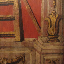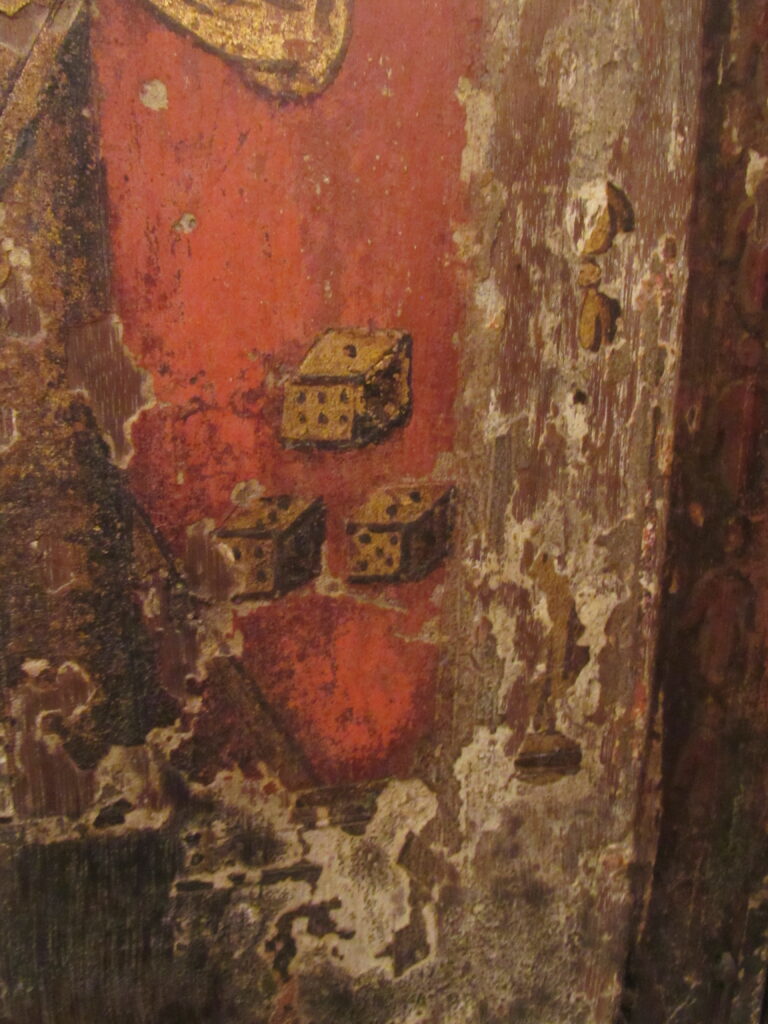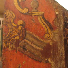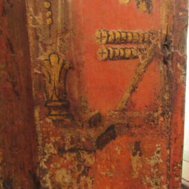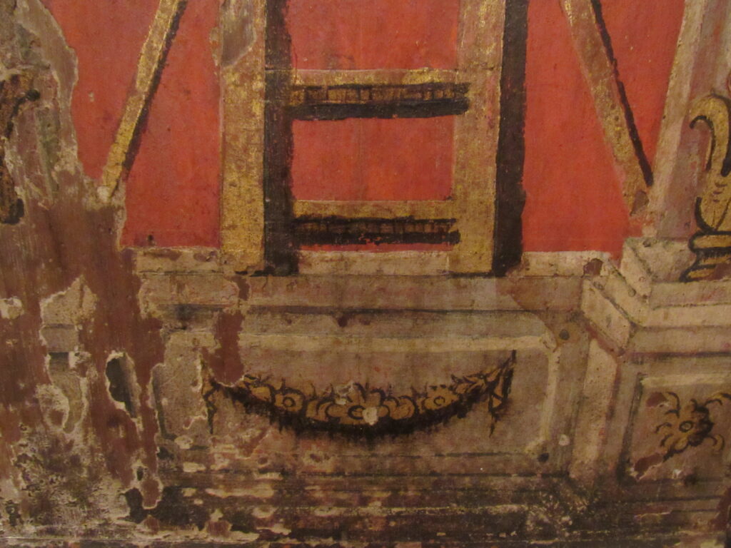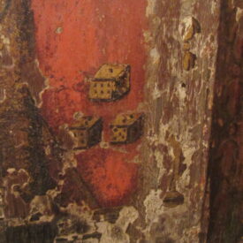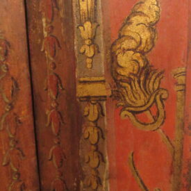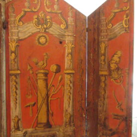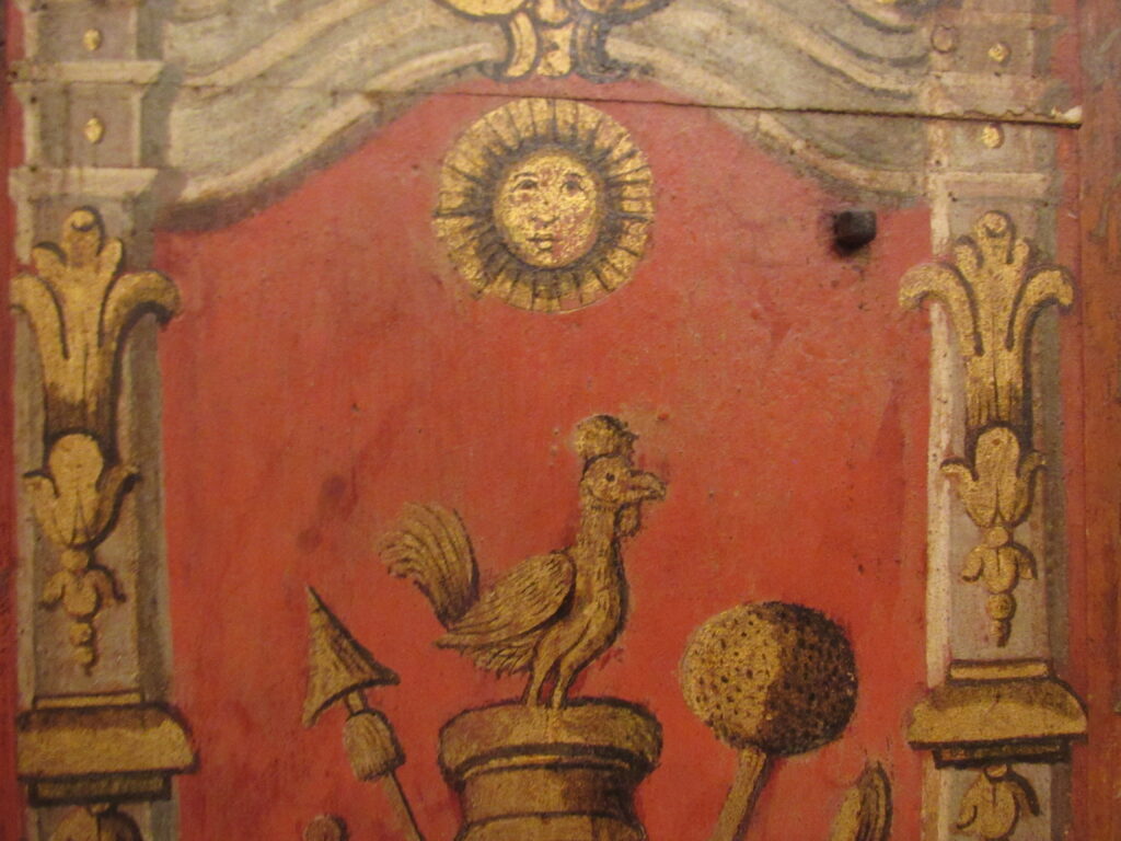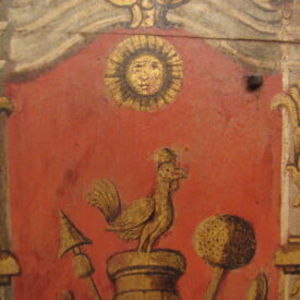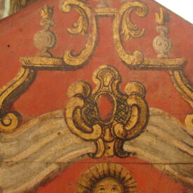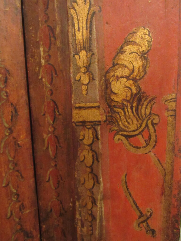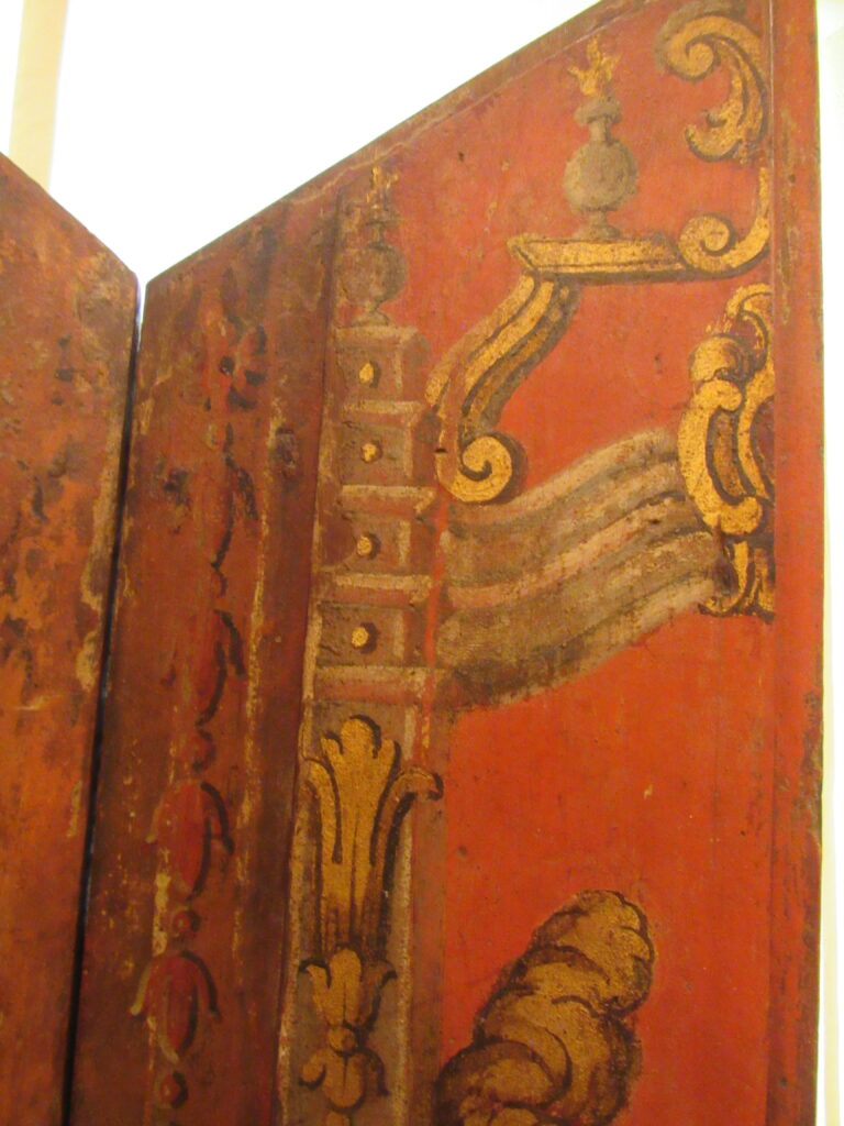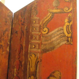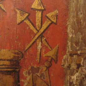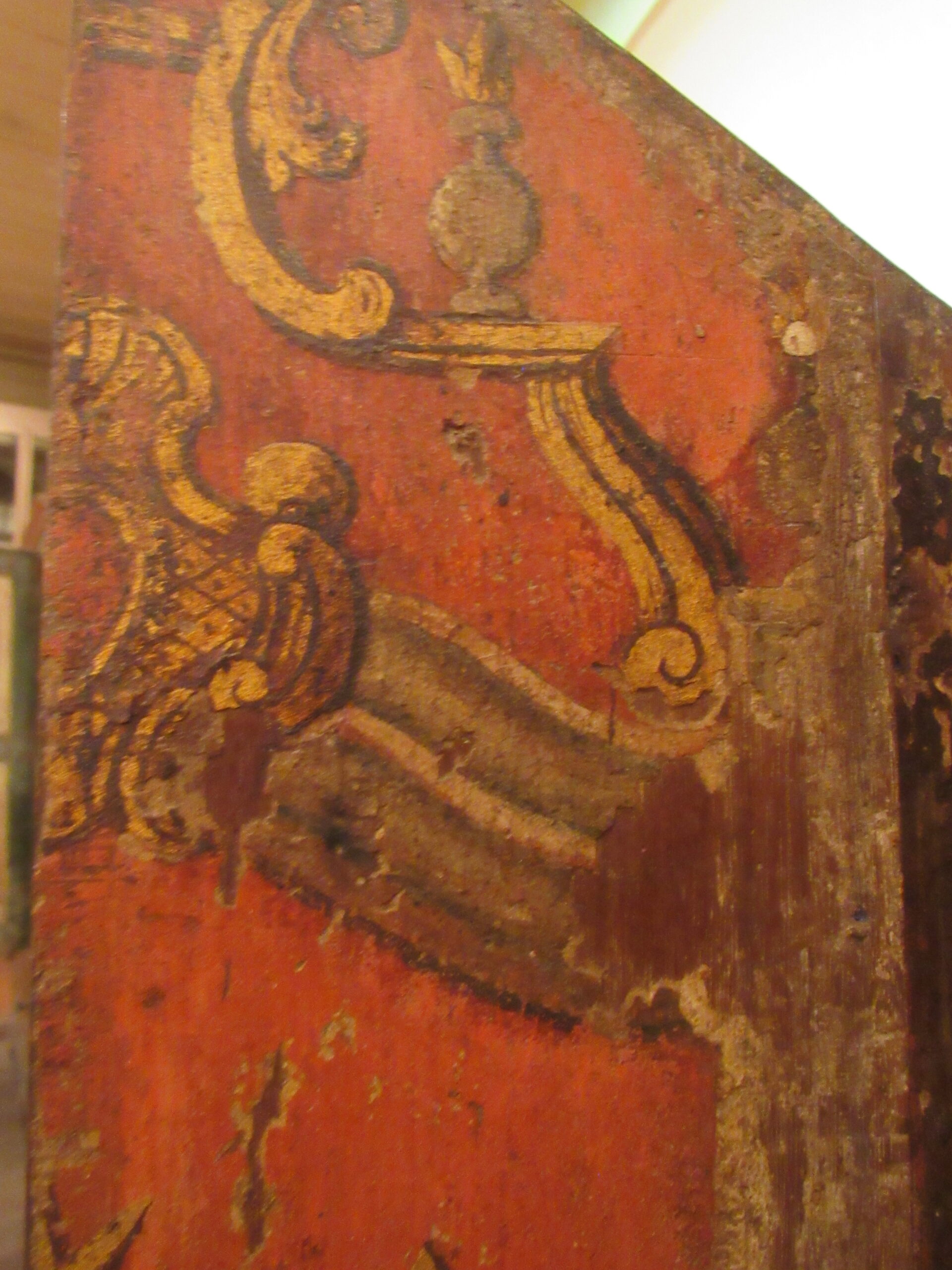 Oratório, confeccionado em madeira (pinho-de-riga) talhada e esculpida, pintada e dourada. Oratório constituído por caixa aberta na frente e nas laterais, com estrutura externa perfilada e entalhada, base escalonada, com vestígios de pintura externa (paisagens com motivos orientais - pagodes, salgueiros e clarões - sobre almofadas, contornadas por guirlandas). Porta composta por duas folhas e duas meias-folhas com os bordos superiores angulosos, almofadadas e emolduradas, unidas aos pares e presas ao fundo da caixa e umas às outras por dobradiças de metal. Tramela na face externa das portas. Cúpula com arremate superior e em forma de cruz com braços afunilados com terminações de lóbulos e ave pousada sobre globo; cimalha com coruchéus. Abertura dos nichos em arcos angulares. Costas lisas, sem acabamento e sem pintura. O oratório tem o fundo liso, sem acabamento e sem pintura. Dentro desse espaço, duas bases para imagens. Face interna das portas pintadas de vermelho, preto e branco, e douradas, com pintura representando instrumentos da Paixão de Cristo moldurados por elementos arquitetônicos e motivos fitomórficos. Descrição das imagens pintadas na face interna das portas: na meia folha à esquerda, elementos arquitetônicos (coluna, parte de arco e de embasamento), elementos decorativos (medalhão com rocalhas e volutas), parte de coluna, três cravos, lança com estandarte com inscrição SPQR e três dados. Na folha à esquerda, elementos arquitetônicos (colunas, arco e embasamento), elementos decorativos (medalhão com rocalhas, volutas e sol), escada, haste com lanterna na extremidade, lança com tecido (toalha de Verônica com o rosto de Cristo?), coroa de espinhos, torquês e bastão (?). Na folha à direita, elementos arquitetônicos (colunas, arco e embasamento), elementos decorativos (medalhão com rocalhas, volutas, festão, motivos fitomórficos e sol), coluna com galo no topo, lança, haste com esponja na extremidade, feixe de cana, açoite e martelo. Na meia folha à direita, elementos arquitetônicos (coluna, parte de arco e de embasamento), elementos decorativos (parte de medalhão com rocalhas, volutas e motivos fitomórficos), parte de coluna, espada e parte de haste com chama na extremidade.