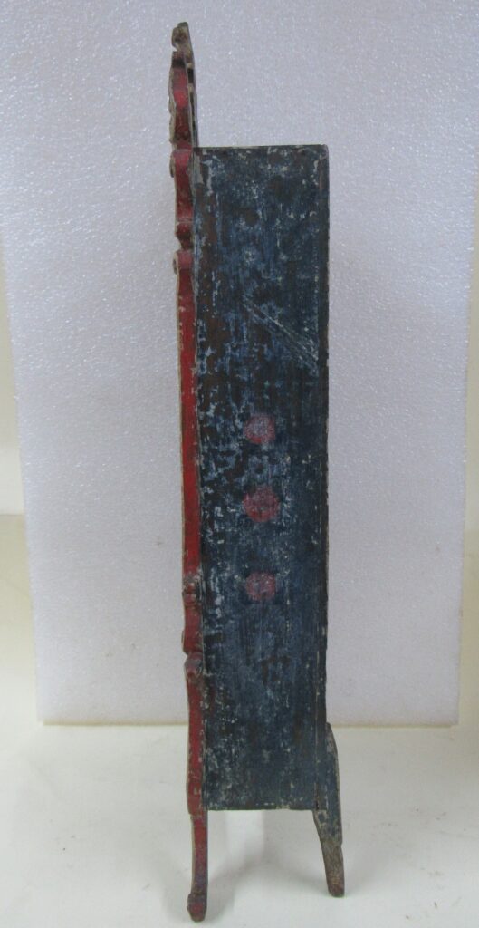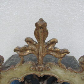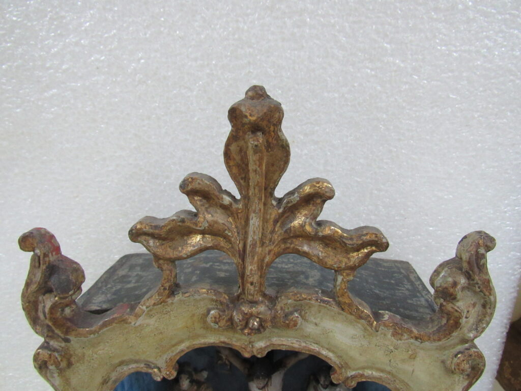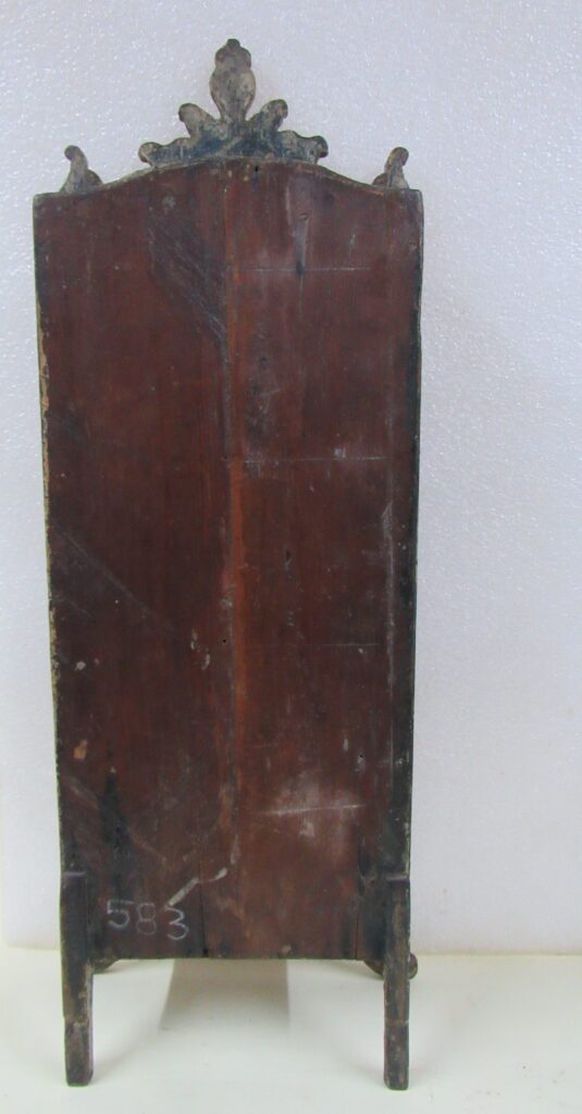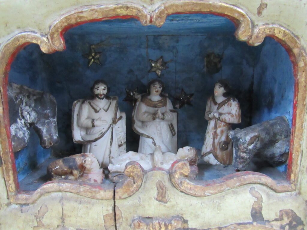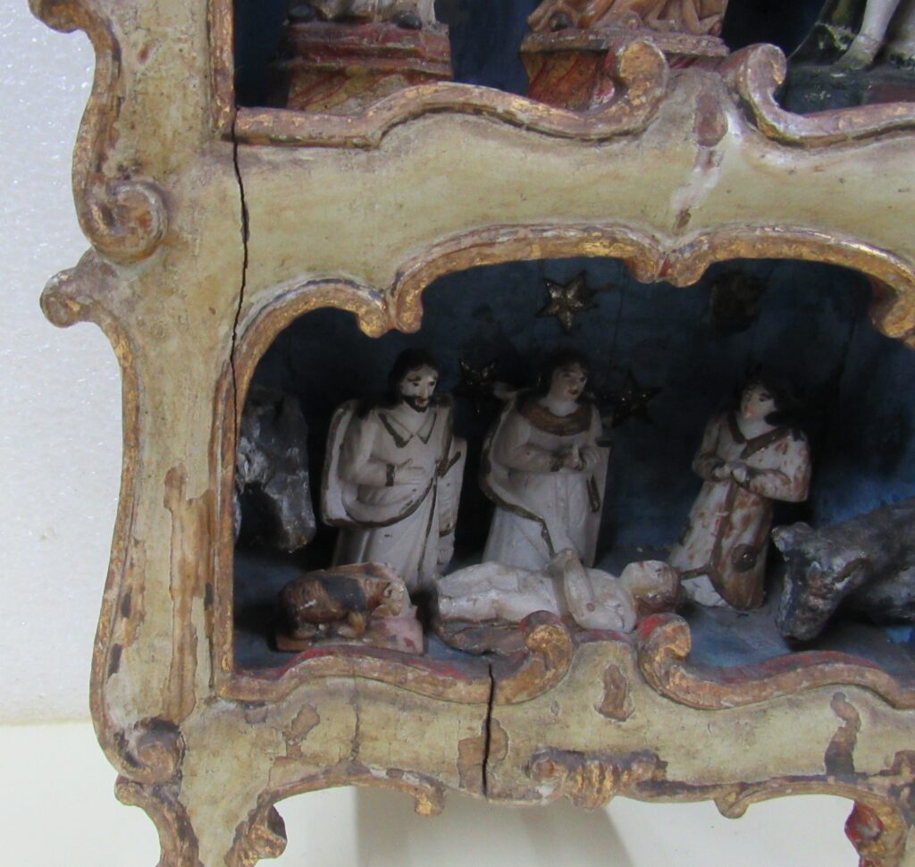 Oratório, em madeira talhada e esculpida, pintada e dourada, com Grupo Escultórico apresentando Cenas da Vida de Cristo, em pedra branca (talcita) esculpida, pintada e dourada. Oratório constituído por caixa de madeira, dividida na parte interna frontal em dois níveis, com estrutura externa perfilada e entalhada com motivos fitomórficos e volutas, apoiada sobre dois pés frontais em volutas e dois pés posteriores retilíneos, pintada na face frontal em tom de branco, e dourada (volutas e arremate superior). Faces laterais externas pintadas. Verso liso, sem acabamento e sem pintura, constituído por tábuas de madeira postas verticalmente, com janela central removível fixada por tramelas. O nível superior do oratório tem, internamente, o fundo e o teto pintados de azul, apresentando por ornamentação estrelas metálicas douradas aplicadas. Distribuídas neste espaço, sobre pedestais e bases de madeira trabalhadas, estão seis imagens em pedra branca, destacando-se o Cristo Crucificado ladeado por Nossa Senhora da Conceição e por São José com o Menino Jesus e, mais abaixo, Santo Antônio com o Menino Jesus, Santana Mestra com a Virgem Menina, e São Sebastião. Descrição das imagens esculpidas em pedra, contidas no nível superior do oratório: o Cristo Crucificado está representado por figura masculina presa à cruz, com o corpo seminu, trajando perizônio com a borda dourada, portando resplendor em metal amarelo e com a cabeça encimada por coroa de espinhos na cor verde. Possui cabelos, barba, sobrancelhas e olhos pintados em tons de castanho, a boca vermelha, além de escoriações em tinta vermelha nas mãos, braços, tórax e pernas. Cruz de haste delgada, acompanhando a altura interna do oratório, em madeira talhada e pintada de verde. À esquerda do Cristo, figura feminina representando Nossa Senhora das Mercês, de pé sobre nuvem estilizada e pousada sobre pedestal pintado em tons de branco e vermelho, marmorizado. Possui cabelos, sobrancelhas e olhos castanhos; a boca vermelha; vestimenta com frisos dourados na borda; sapatos pretos. À direita do Cristo, figura masculina, de pé, representando São José com o Menino Jesus apoiado sobre seu braço esquerdo. São José tem cabelos, barba, sobrancelhas e olhos castanhos; a boca vermelha; traja vestimenta bordejada de dourado; calça botas marrons. Está sem a mão direita e encontra-se apoiado sobre pedestal em tons de branco e vermelho, marmorizado. Menino Jesus com cabelos louros, sobrancelhas e olhos castanhos, a boca vermelha. Abaixo do Cristo, figuras femininas representam Santana Mestra e a Virgem Menina. Santana está sentada sobre cadeira pintada nos tons de vermelho e dourado, tendo a Virgem Menina de pé ao seu lado. Santana segura com sua mão direita um livro aberto, enquanto a Virgem apóia as duas mãos sobre o mesmo. Ambas têm pintura em tom avermelhado e encontram-se sobre pedestal em tons de branco e vermelho, marmorizado. À esquerda da Santana, figura masculina de pé, representando Santo Antônio com o Menino Jesus sobre livro vermelho apoiado em seu braço esquerdo. Santo Antônio possui cabelos, sobrancelhas e olhos castanhos; a boca vermelha; vestimenta com frisos dourados; sapatos. Apóia-se sobre pedestal pintado em tons de branco e vermelho, marmorizado. Menino Jesus com cabelos louros, sobrancelhas e olhos castanhos, a boca vermelha. À direita da Santana, figura masculina de pé, representando São Sebastião, corpo seminu, trajando perizônio com bordas em dourado, tendo flechas douradas transpassadas pelo corpo. Tem os braços amarrados a um tronco verde por cordas em dourado e está sem a mão direita. São Sebastião tem os cabelos, sobrancelhas e olhos castanhos, a boca vermelha e encontra-se apoiado sobre rocha estilizada, pintada de verde e pedestal pintado em tons de branco e vermelho, marmorizado. No nível inferior do Oratório, correspondente a um terço do alçado, encontra-se distribuído um grupo de imagens em pedra branca, compondo a cena do Presépio, destacando-se o Menino Jesus na manjedoura, Nossa Senhora, São José, um Pastor, um carneiro, um burro e um boi. Descrição das imagens esculpidas em pedra, contidas no nível inferior do oratório: à esquerda, figura masculina representando São José, ajoelhado; com cabelos, barba, sobrancelhas e olhos castanhos; a boca vermelha; vestimenta com frisos dourados; as mãos postas em oração. Ao lado, figura feminina representando Nossa Senhora, ajoelhada; com cabelos, sobrancelhas e olhos castanhos; a boca vermelha. Veste túnica com detalhes e frisos dourados e tem as mãos postas em oração. Em seguida, figura masculina representando um Pastor, ajoelhado; com cabelos, sobrancelhas e olhos castanhos; a boca vermelha; túnica com bordas douradas; mãos unidas em oração. À frente, no centro, figura de criança representando o Menino Jesus, deitado de costas sobre base, com a cabeça voltada para a sua direita e apoiada em almofada. Possui cabelos dourados; sobrancelhas e olhos castanhos; a boca vermelha; um globo entre as mãos. Parte inferior frontal do móvel em madeira entalhada e recortada, com pés dianteiros em volutas e pés traseiros retos. Não apresenta vidro frontal apesar da existência do encaixe recortado na parte superior da caixa.