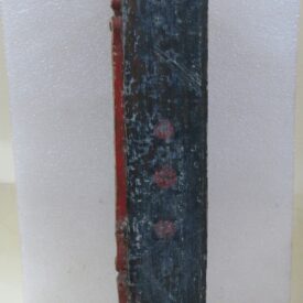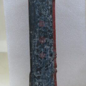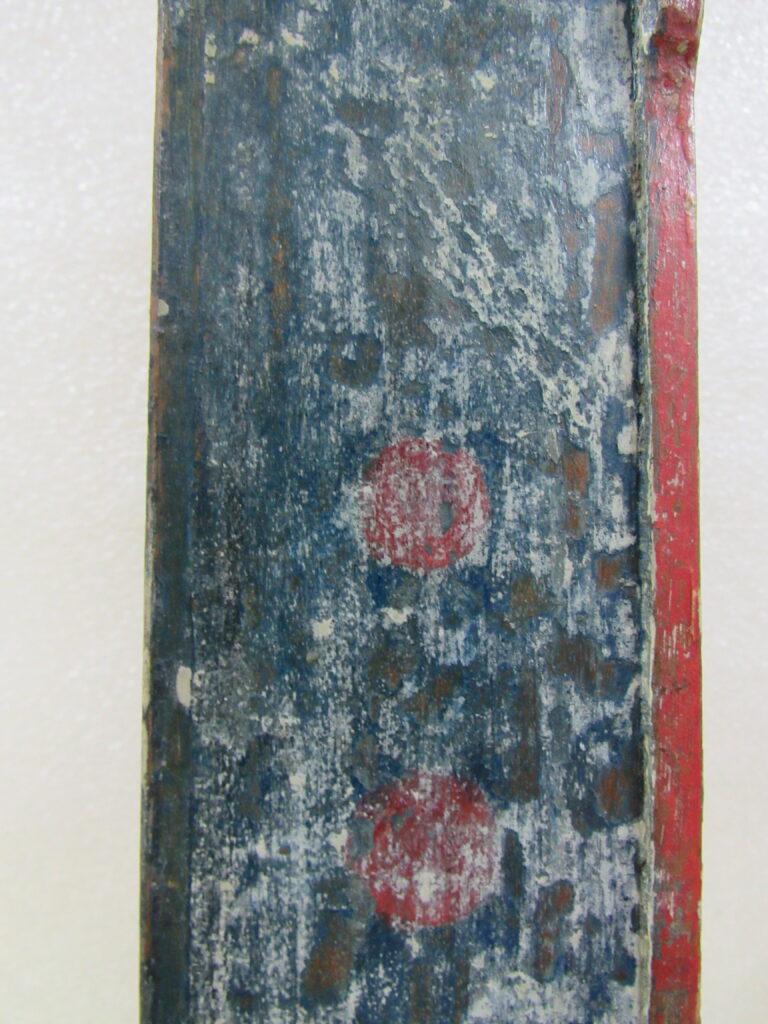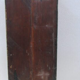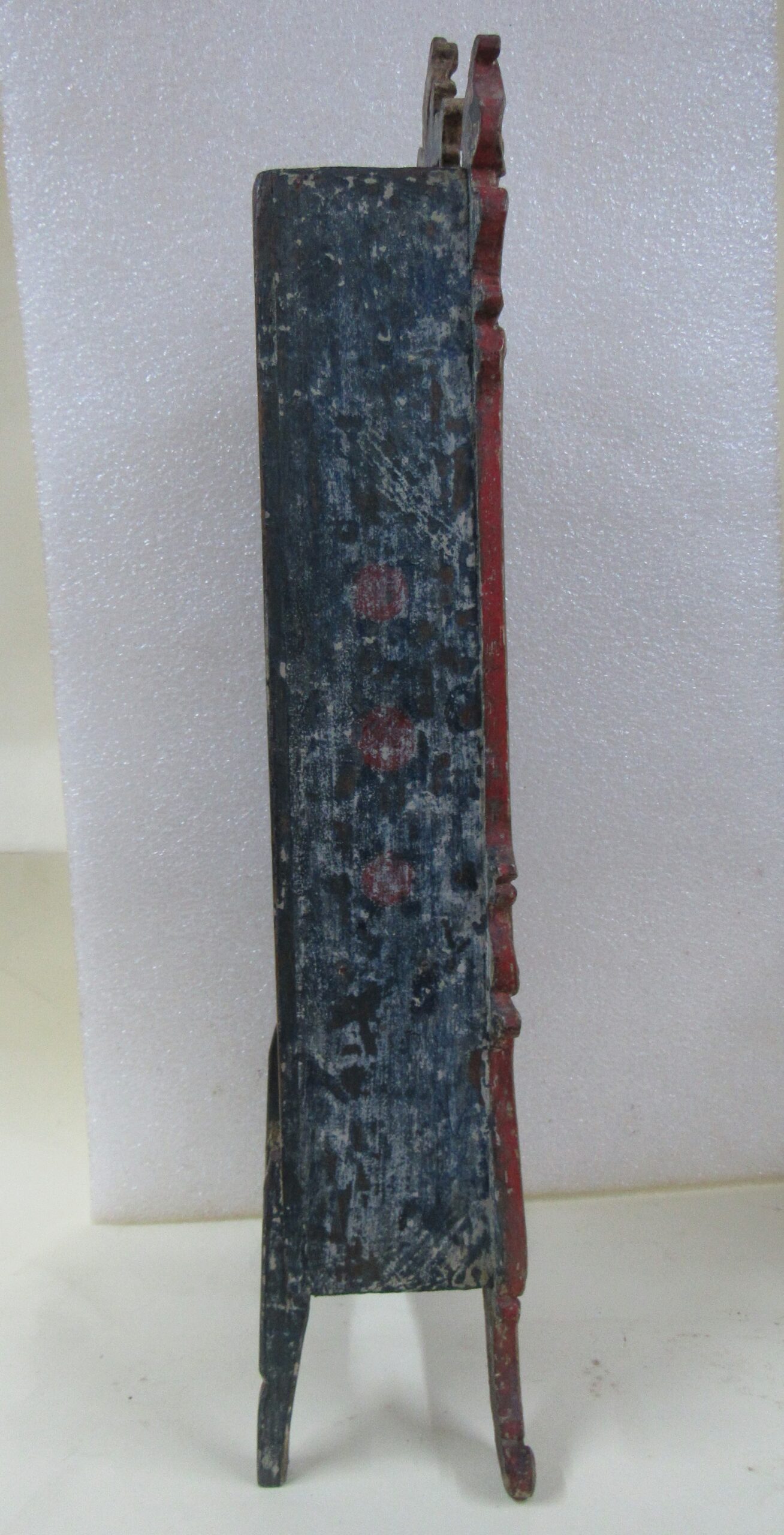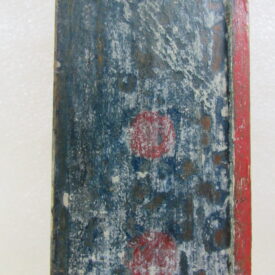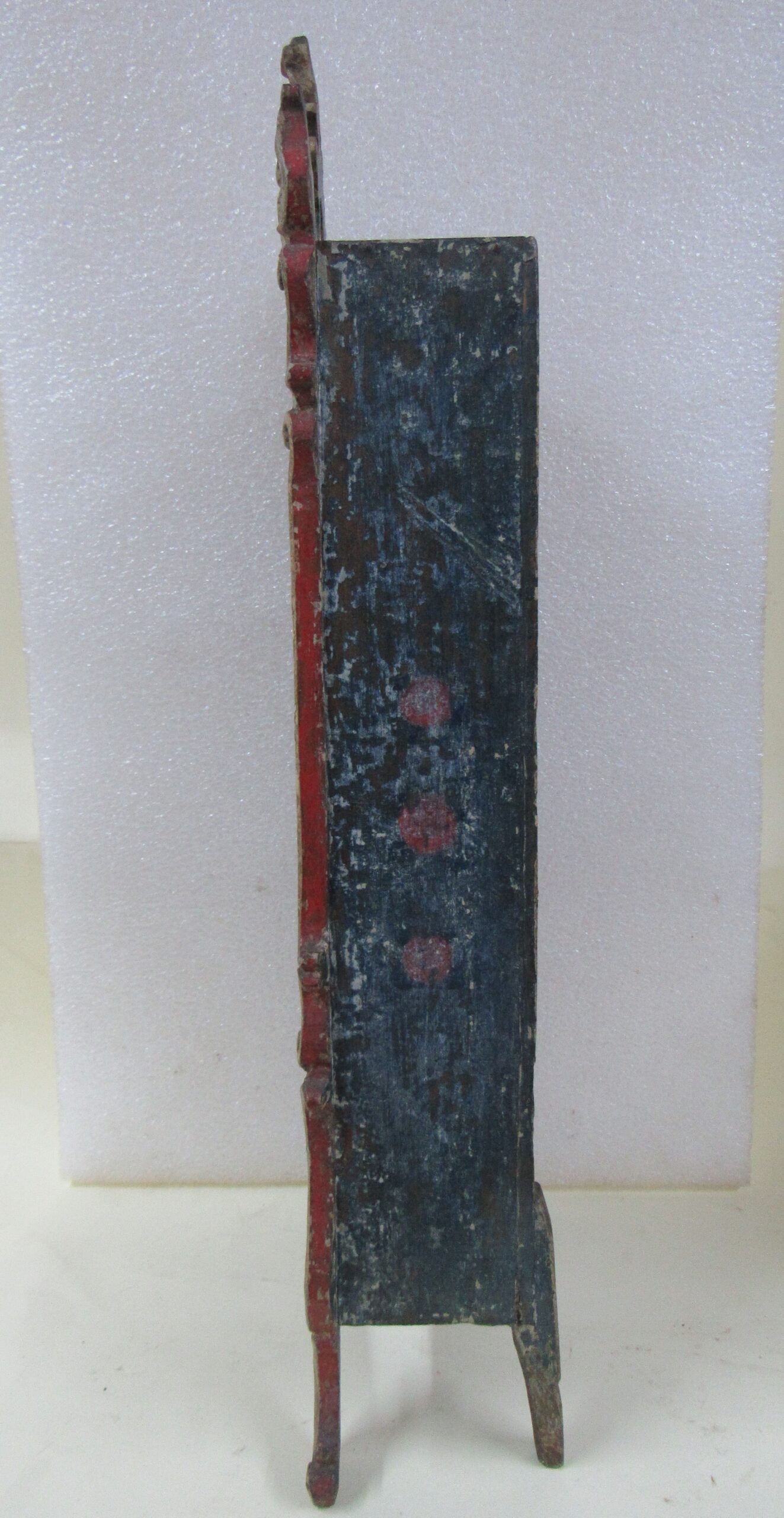 Oratório, em madeira talhada e esculpida, pintada e dourada, com Grupo Escultórico apresentando Cenas da Vida de Cristo, em pedra branca (talcita) esculpida, pintada e dourada. Oratório constituído por caixa de madeira, dividida na parte interna frontal em dois níveis, com estrutura externa perfilada e entalhada com motivos fitomórficos e volutas, apoiada sobre dois pés frontais em volutas e dois pés posteriores retilíneos, pintada na face frontal em tom de branco, e dourada (volutas e arremate superior). Faces laterais externas pintadas. Verso liso, sem acabamento e sem pintura, constituído por tábuas de madeira postas verticalmente, com janela central removível fixada por tramelas. O nível superior do oratório tem, internamente, o fundo e o teto pintados de azul, apresentando por ornamentação estrelas metálicas douradas aplicadas. Distribuídas neste espaço, sobre pedestais e bases de madeira trabalhadas, estão seis imagens em pedra branca, destacando-se o Cristo Crucificado ladeado por Nossa Senhora da Conceição e por São José com o Menino Jesus e, mais abaixo, Santo Antônio com o Menino Jesus, Santana Mestra com a Virgem Menina, e São Sebastião. Descrição das imagens esculpidas em pedra, contidas no nível superior do oratório: o Cristo Crucificado está representado por figura masculina presa à cruz, com o corpo seminu, trajando perizônio com a borda dourada, portando resplendor em metal amarelo e com a cabeça encimada por coroa de espinhos na cor verde. Possui cabelos, barba, sobrancelhas e olhos pintados em tons de castanho, a boca vermelha, além de escoriações em tinta vermelha nas mãos, braços, tórax e pernas. Cruz de haste delgada, acompanhando a altura interna do oratório, em madeira talhada e pintada de verde. À esquerda do Cristo, figura feminina representando Nossa Senhora das Mercês, de pé sobre nuvem estilizada e pousada sobre pedestal pintado em tons de branco e vermelho, marmorizado. Possui cabelos, sobrancelhas e olhos castanhos; a boca vermelha; vestimenta com frisos dourados na borda; sapatos pretos. À direita do Cristo, figura masculina, de pé, representando São José com o Menino Jesus apoiado sobre seu braço esquerdo. São José tem cabelos, barba, sobrancelhas e olhos castanhos; a boca vermelha; traja vestimenta bordejada de dourado; calça botas marrons. Está sem a mão direita e encontra-se apoiado sobre pedestal em tons de branco e vermelho, marmorizado. Menino Jesus com cabelos louros, sobrancelhas e olhos castanhos, a boca vermelha. Abaixo do Cristo, figuras femininas representam Santana Mestra e a Virgem Menina. Santana está sentada sobre cadeira pintada nos tons de vermelho e dourado, tendo a Virgem Menina de pé ao seu lado. Santana segura com sua mão direita um livro aberto, enquanto a Virgem apóia as duas mãos sobre o mesmo. Ambas têm pintura em tom avermelhado e encontram-se sobre pedestal em tons de branco e vermelho, marmorizado. À esquerda da Santana, figura masculina de pé, representando Santo Antônio com o Menino Jesus sobre livro vermelho apoiado em seu braço esquerdo. Santo Antônio possui cabelos, sobrancelhas e olhos castanhos; a boca vermelha; vestimenta com frisos dourados; sapatos. Apóia-se sobre pedestal pintado em tons de branco e vermelho, marmorizado. Menino Jesus com cabelos louros, sobrancelhas e olhos castanhos, a boca vermelha. À direita da Santana, figura masculina de pé, representando São Sebastião, corpo seminu, trajando perizônio com bordas em dourado, tendo flechas douradas transpassadas pelo corpo. Tem os braços amarrados a um tronco verde por cordas em dourado e está sem a mão direita. São Sebastião tem os cabelos, sobrancelhas e olhos castanhos, a boca vermelha e encontra-se apoiado sobre rocha estilizada, pintada de verde e pedestal pintado em tons de branco e vermelho, marmorizado. No nível inferior do Oratório, correspondente a um terço do alçado, encontra-se distribuído um grupo de imagens em pedra branca, compondo a cena do Presépio, destacando-se o Menino Jesus na manjedoura, Nossa Senhora, São José, um Pastor, um carneiro, um burro e um boi. Descrição das imagens esculpidas em pedra, contidas no nível inferior do oratório: à esquerda, figura masculina representando São José, ajoelhado; com cabelos, barba, sobrancelhas e olhos castanhos; a boca vermelha; vestimenta com frisos dourados; as mãos postas em oração. Ao lado, figura feminina representando Nossa Senhora, ajoelhada; com cabelos, sobrancelhas e olhos castanhos; a boca vermelha. Veste túnica com detalhes e frisos dourados e tem as mãos postas em oração. Em seguida, figura masculina representando um Pastor, ajoelhado; com cabelos, sobrancelhas e olhos castanhos; a boca vermelha; túnica com bordas douradas; mãos unidas em oração. À frente, no centro, figura de criança representando o Menino Jesus, deitado de costas sobre base, com a cabeça voltada para a sua direita e apoiada em almofada. Possui cabelos dourados; sobrancelhas e olhos castanhos; a boca vermelha; um globo entre as mãos. Parte inferior frontal do móvel em madeira entalhada e recortada, com pés dianteiros em volutas e pés traseiros retos. Não apresenta vidro frontal apesar da existência do encaixe recortado na parte superior da caixa.