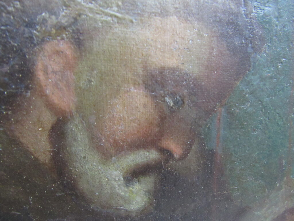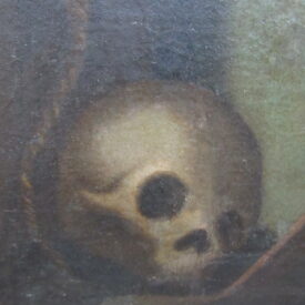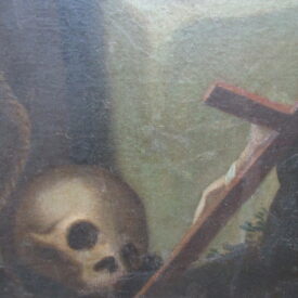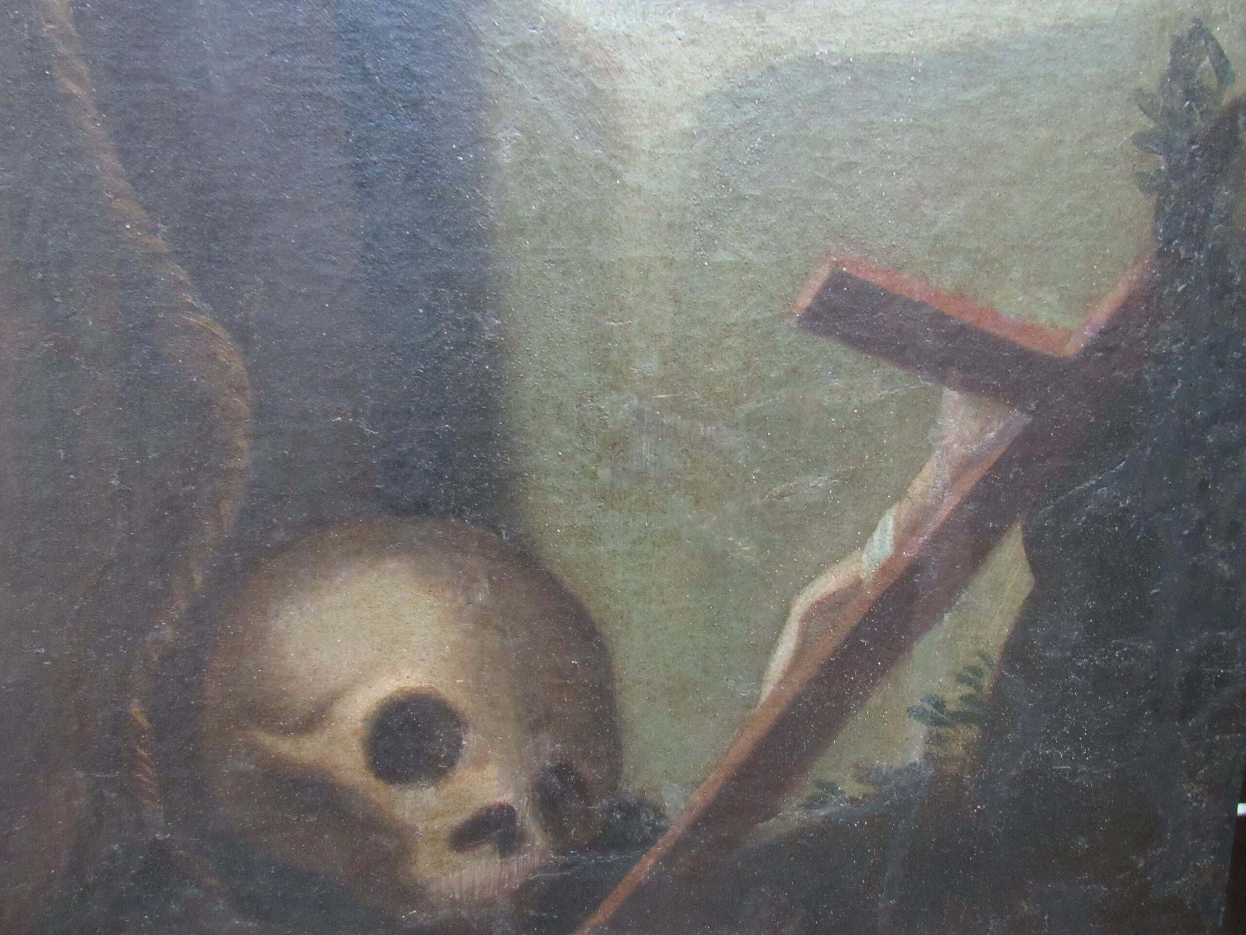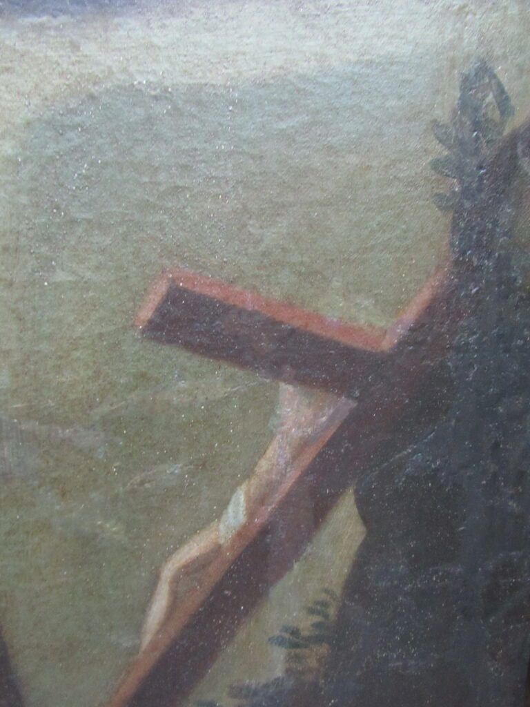 Pintura religiosa a óleo sobre tela, representando Estigmatização de São Francisco de Assis. Em primeiro plano, à direita da cena, crucifixo e caveira humana. Em segundo plano, figura masculina ajoelhada, representando São Francisco de Assis, encostado a mesa coberta por tecido, com o rosto voltado à sua direita e olhar direcionado para cima, cabelos curtos e olhos castanhos, nariz comprido, orelha esquerda aparente, e boca pequena cerrada, em tom vermelho; traja Hábito da Ordem Franciscana, em tom marrom, cintado por cíngulo bege; braço direito estendido para cima, e braço esquerdo flexionado, tendo o cotovelo apoiado sobre livro aberto; em ambas as mãos, recebe as chagas de Cristo, representadas por tinta vermelha, provindas do céu através de um fio reto, em tom vermelho; pernas flexionadas e unidas, posicionadas lateralmente, com a marca das chagas nos pés descalços. À esquerda da cena, mais ao fundo, outra figura masculina, a meio corpo, assentada, idosa, com os cabelos, cortados em tonsura, e barba brancos, rosto de perfil, trajando hábito franciscano, em tom marrom; braços flexionados, lendo um livro que segura nas mãos. Em segundo plano, na parte superior à esquerda, querubim cercado por campo iluminado, em tom amarelo, tendo asas azuis. Fundo em tom azul. Sem assinatura. Sem moldura.
